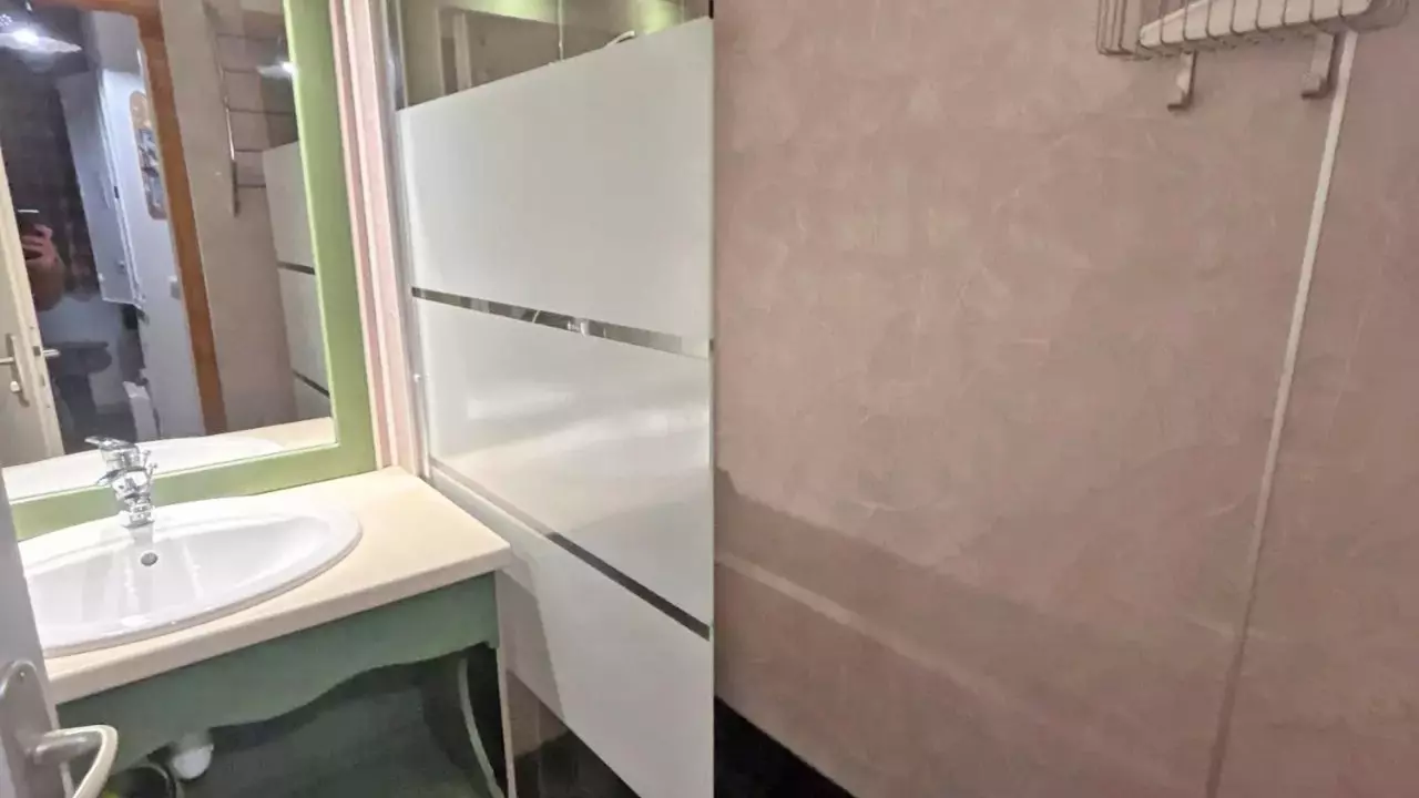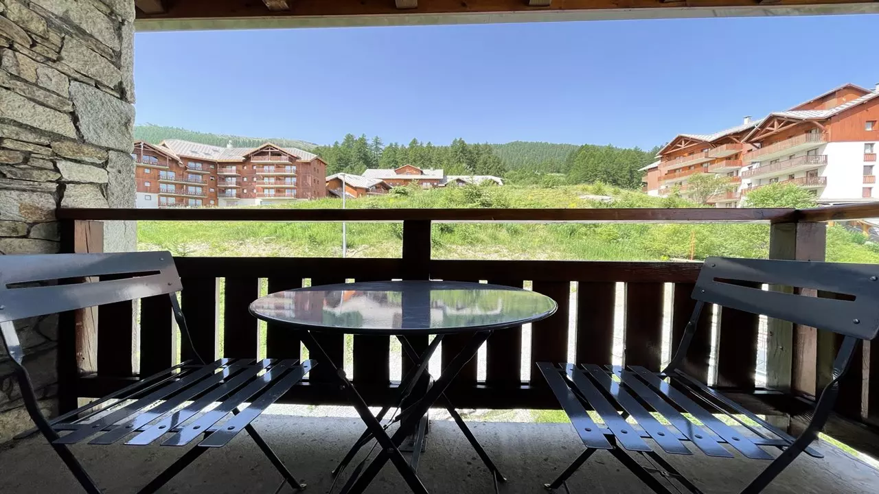 - Séjour avec canapé lit gigogne convertible (2/80x190 ou 160x190), table à manger, tv écran plat et balcon équipé d’une table et deux chaises.