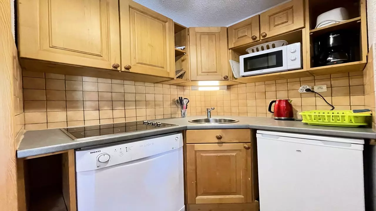 - Cuisine équipée : avec micro-ondes, lave-vaisselle, plaque vitrocéramique (4 feux), réfrigérateur, grille-pain, bouilloire, cafetière.
