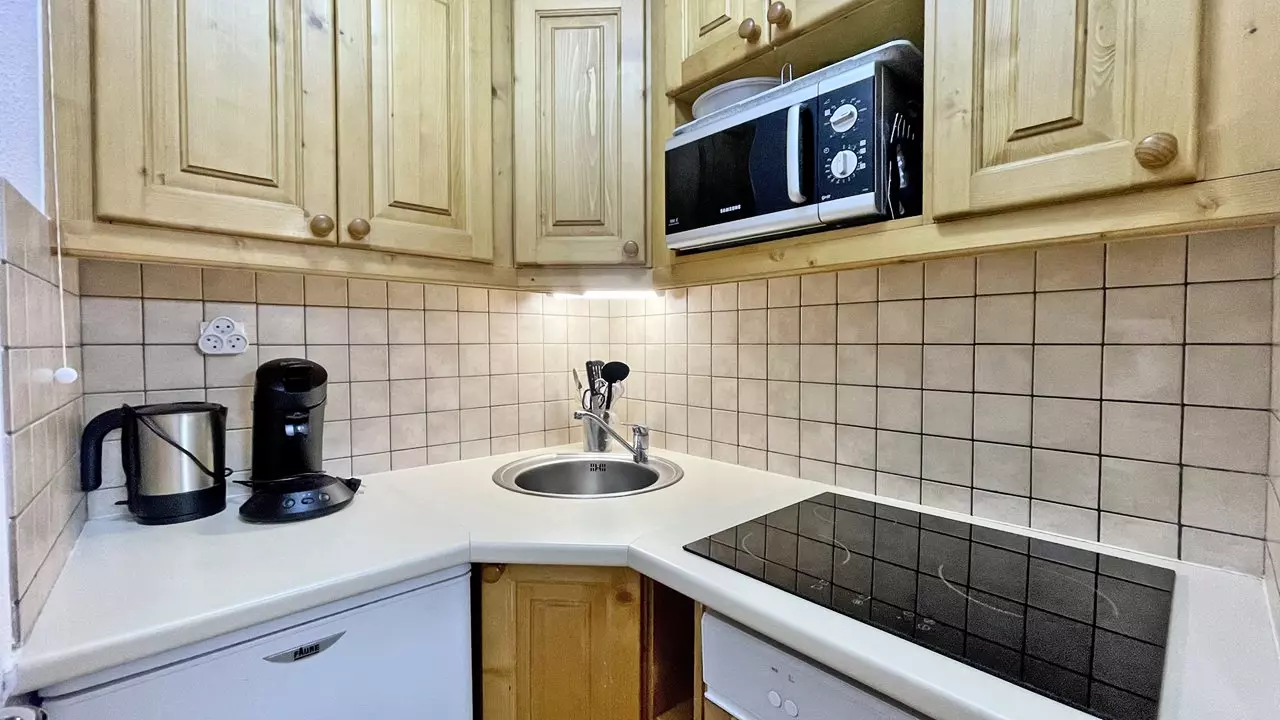 - Cuisine équipée : avec lave-vaisselle, plaque de cuisson vitrocéramique (4 feux), four micro-ondes, cafetière, grille-pain et bouilloire.