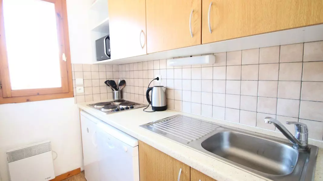 - Une cuisine équipée d'un lave vaisselle, d'une plaque de cuisson électrique de 4 feux, d'un micro-ondes, d'une bouilloire, d'une cafetière, d'un grille pain