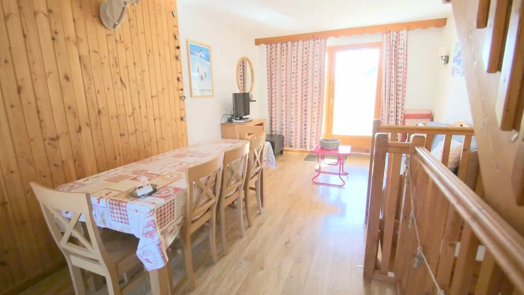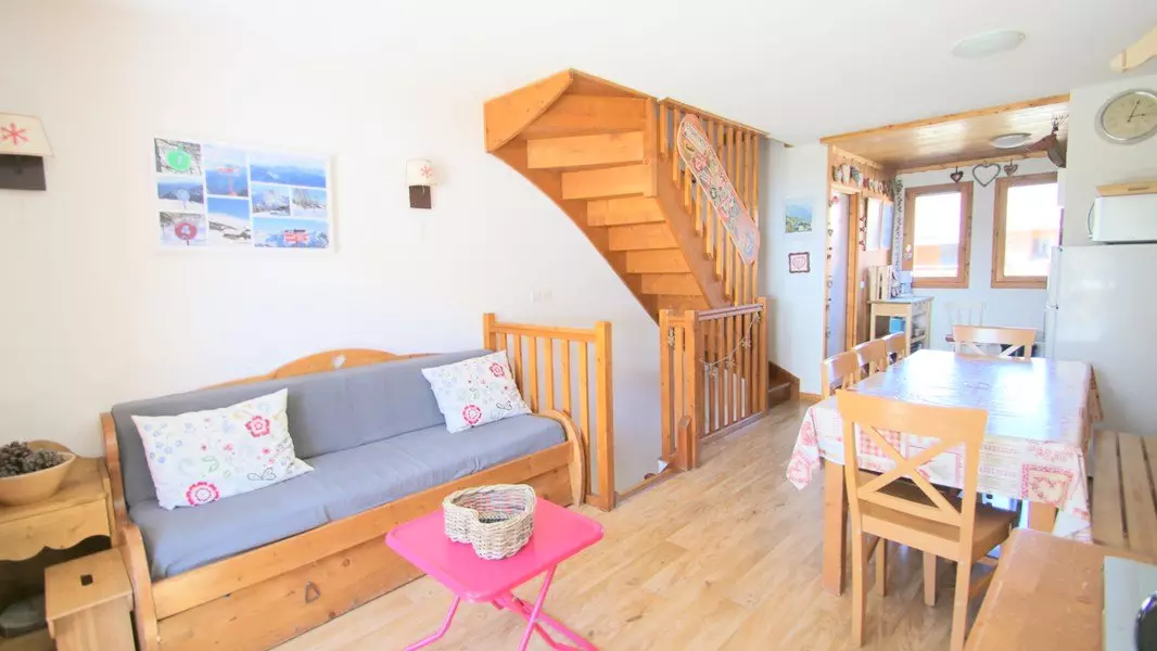 Location de vacances à Puy Saint Vincent, au coeur des pistes à 1800m, joli chalet triplex mitoyen de 3 chambres, de bon standing avec terrasse et balcon, meublé et équipé pour 8 personnes. RÉSIDENCE LE PARC AUX ÉTOILES PISCINE ET SAUNA.