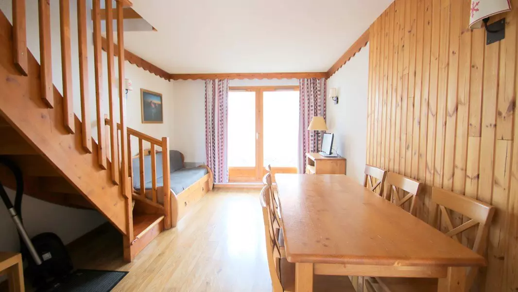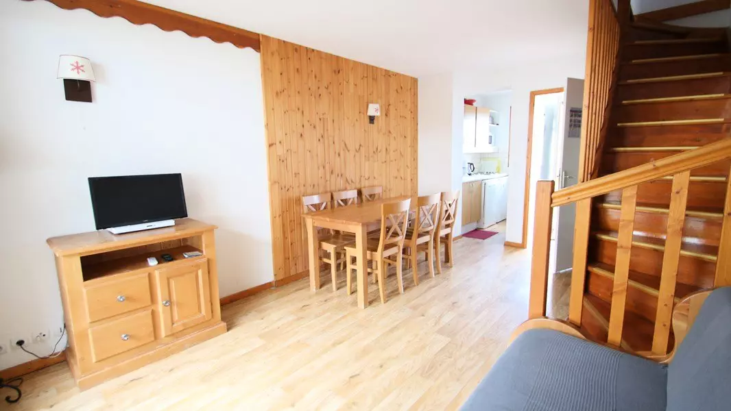 Au cœur des pistes de Puy-Saint-Vincent, location à 1800m d'un joli chalet mitoyen de bon standing avec terrasse et balcon, meublé et équipé pour des vacances au ski pour 6-7 personnes.