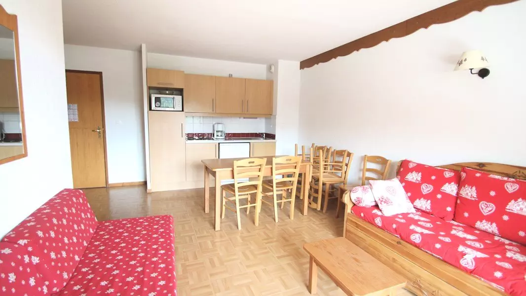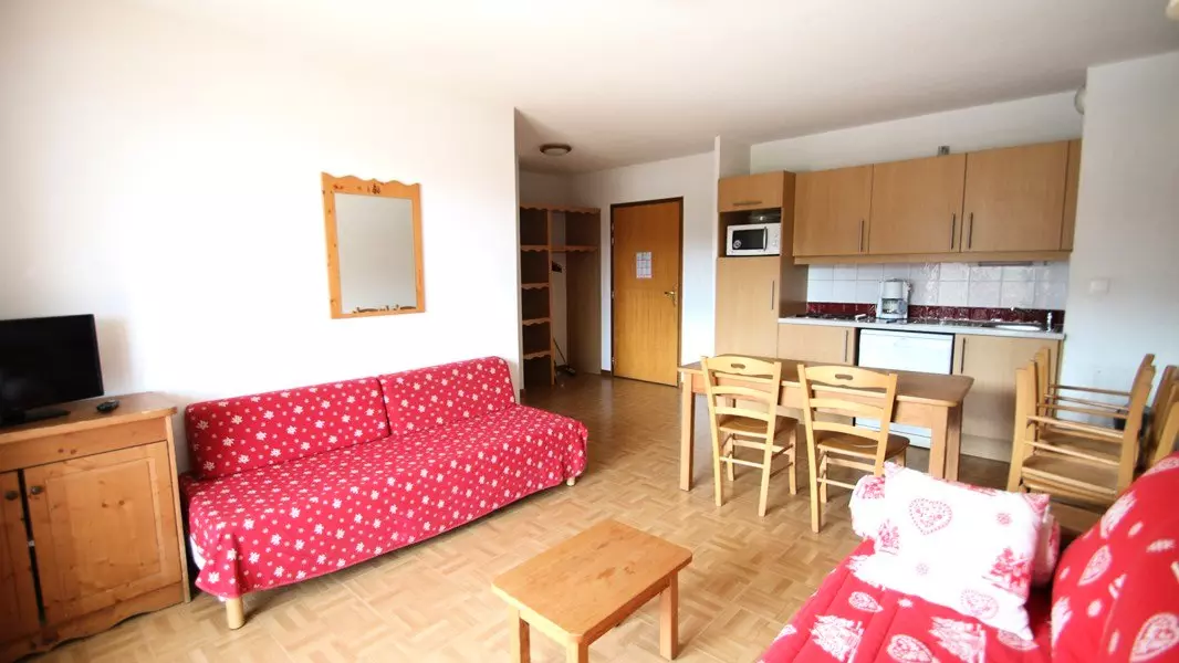 - L'entrée donne sur un grand séjour avec banquette gigogne ainsi qu'une banquette supplémentaire, et le coin cuisine ouverte équipée avec micro-ondes, lave-vaisselle. Le balcon est exposé Sud-Est.