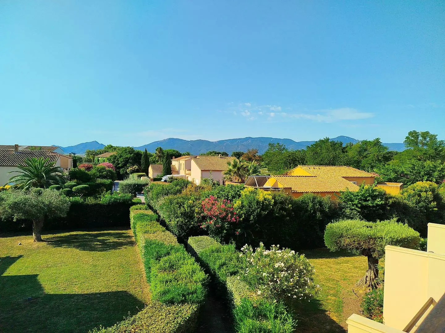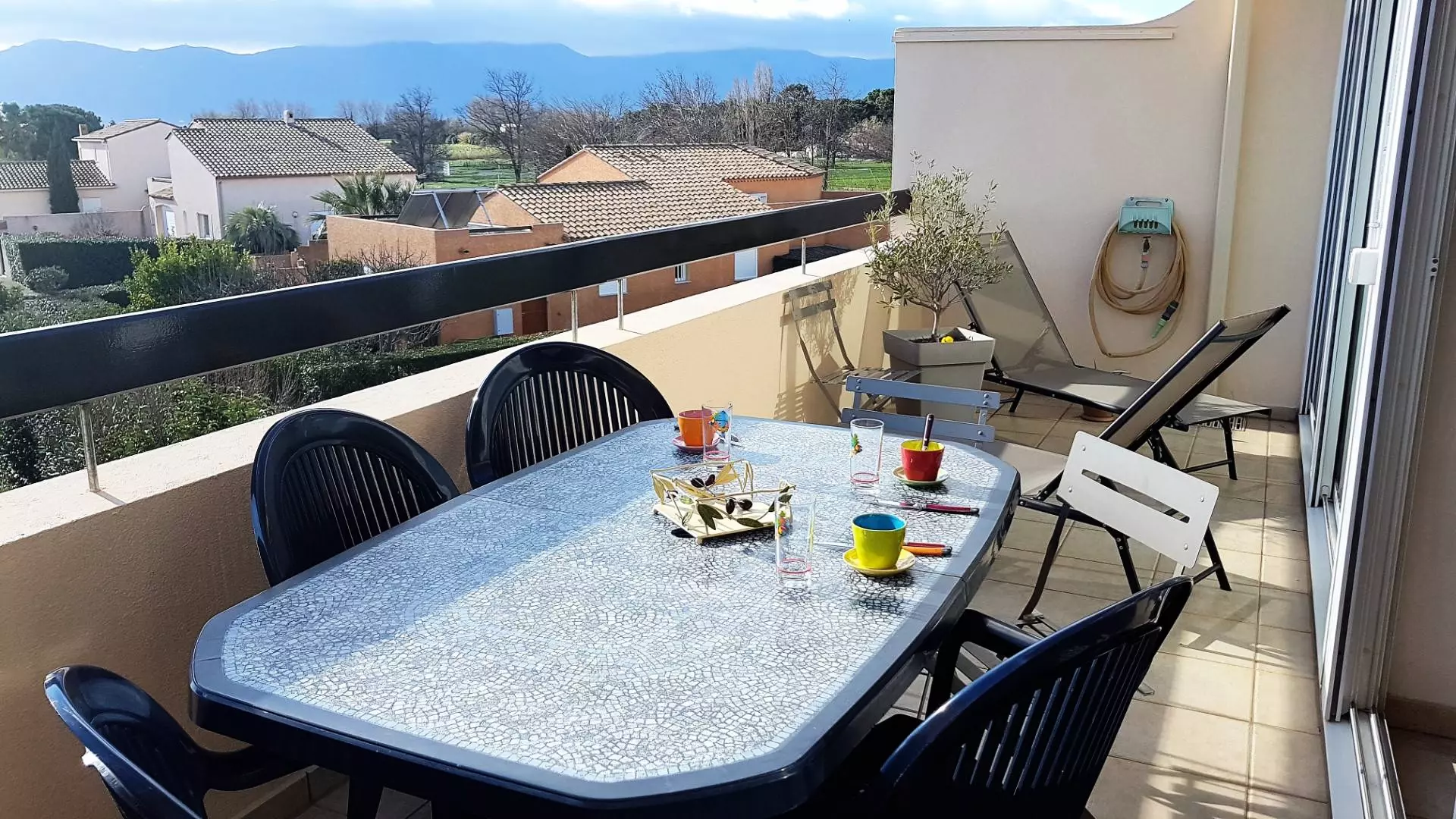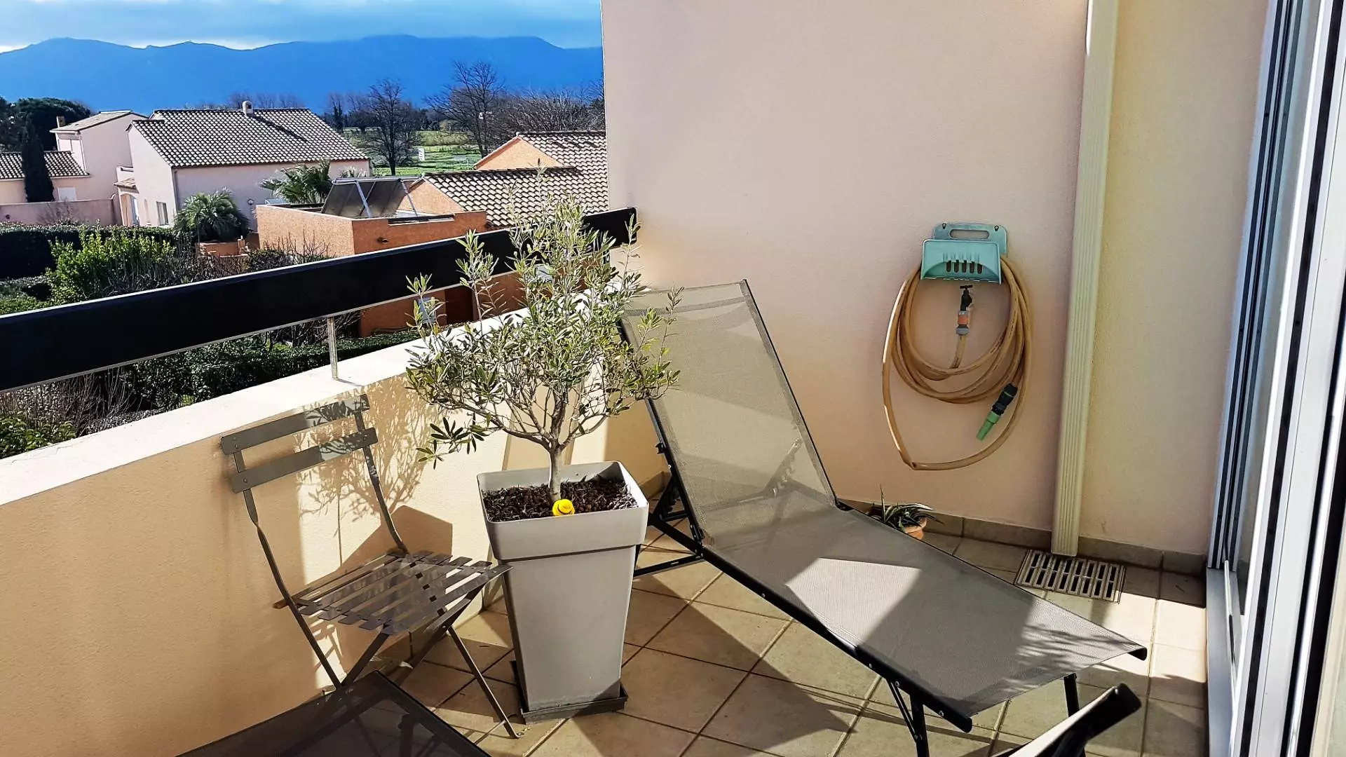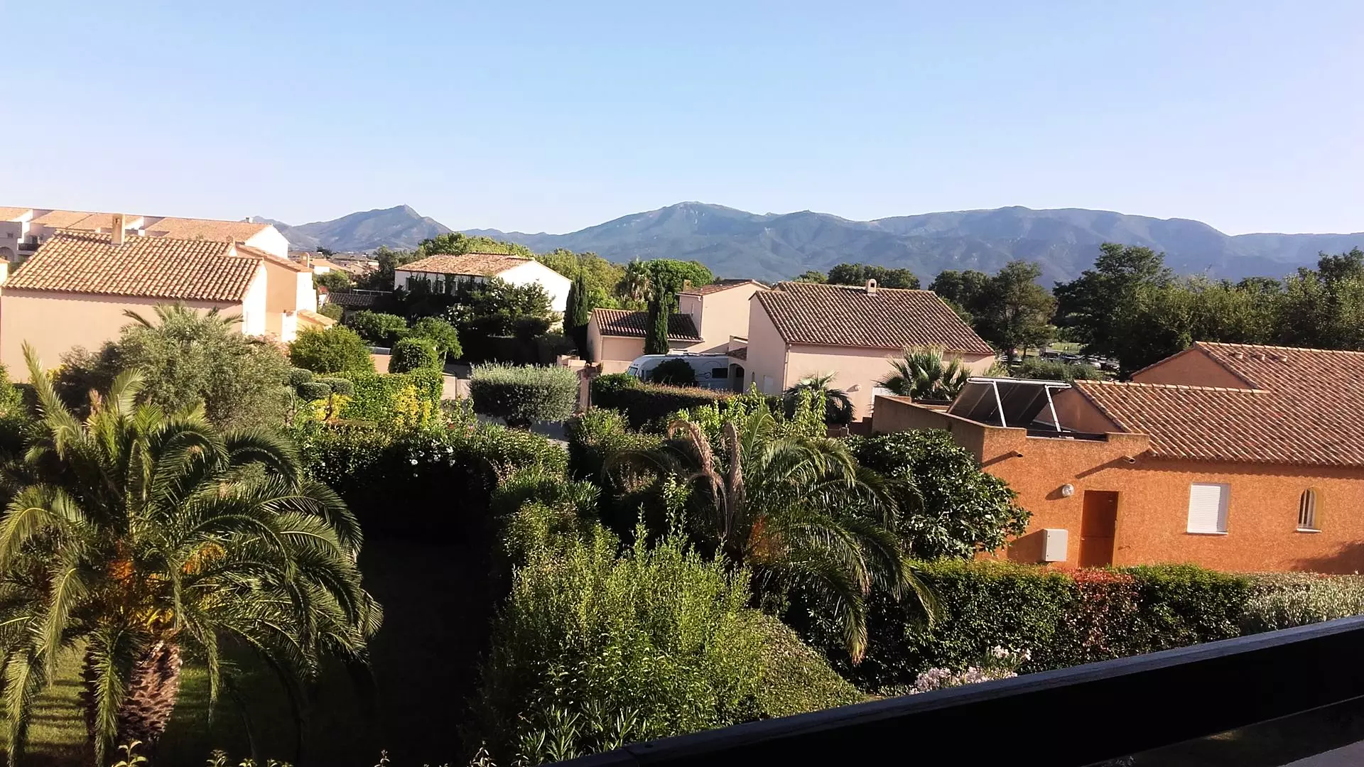Le séjour et la chambre du RDC disposent de baies vitrées (volets roulants électriques) donnant sur la grande terrasse de 15 m2 (store banne, transats, salon de jardin et plancha)- Vue panoramique sur les Albères !