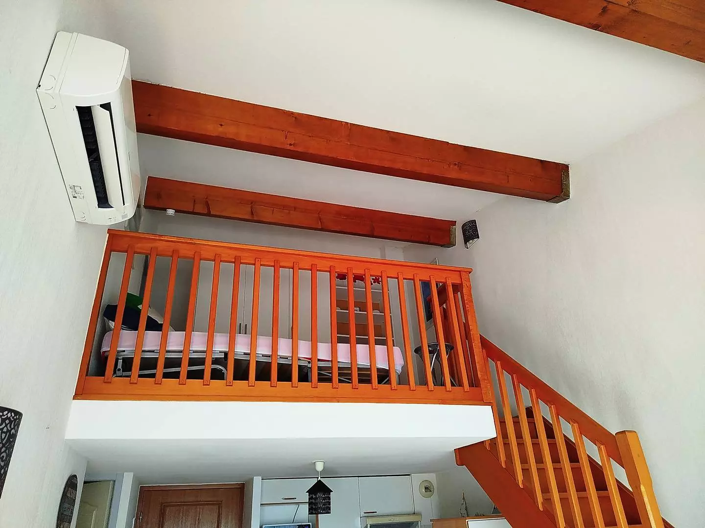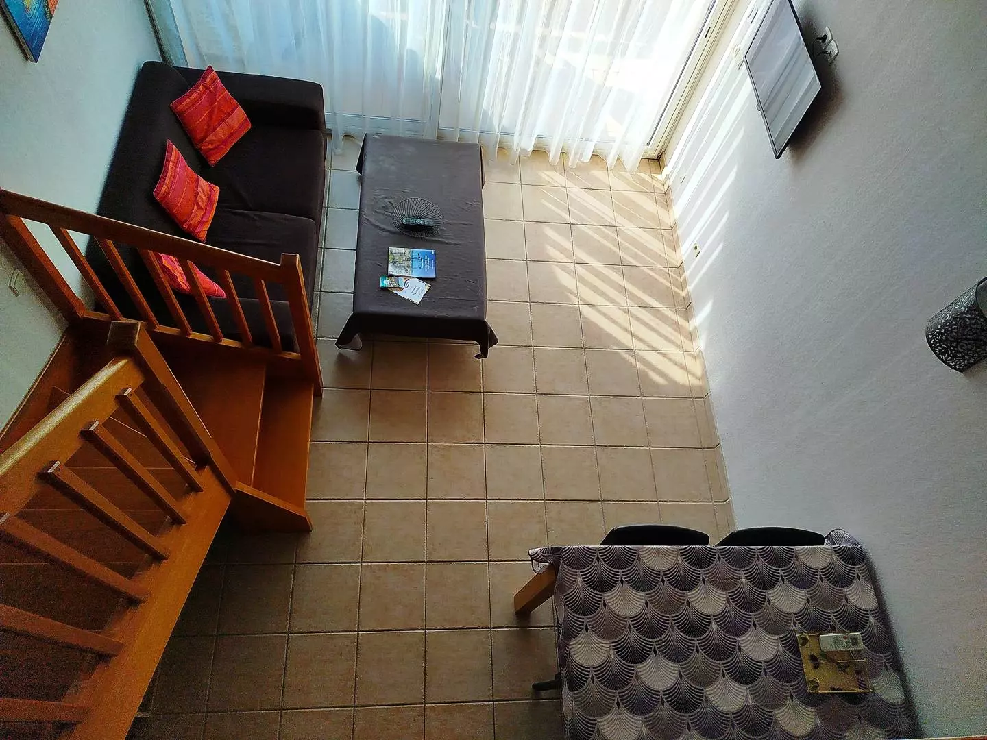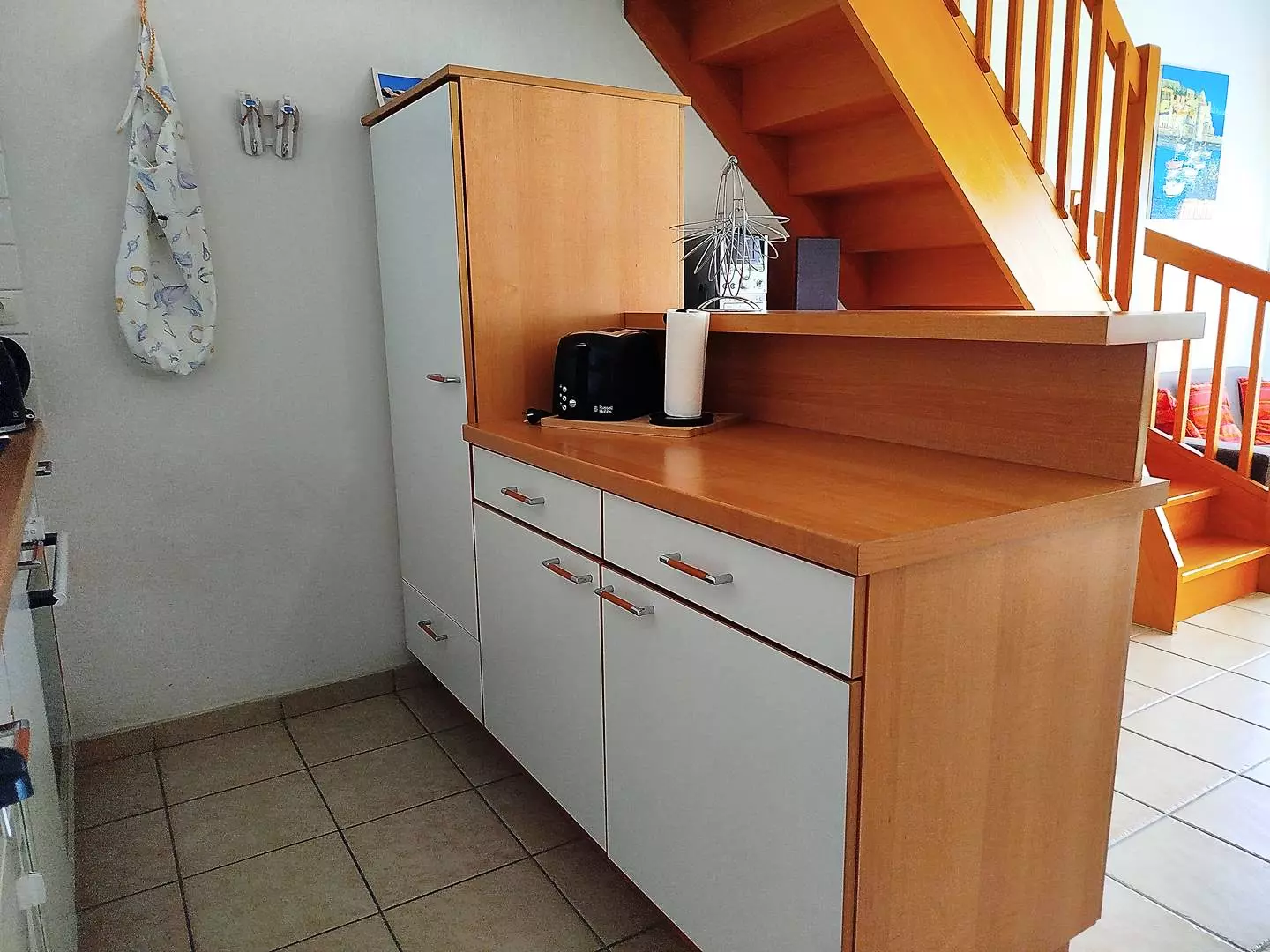 Séjour/salle à manger (TV) avec coin cuisine américaine équipée (Réfrigérateur, congélateur, plaques de cuisson vitrocéramiques, petit lave vaisselle, four, micro ondes cafetière filtres, bouilloire, grill pain ..)