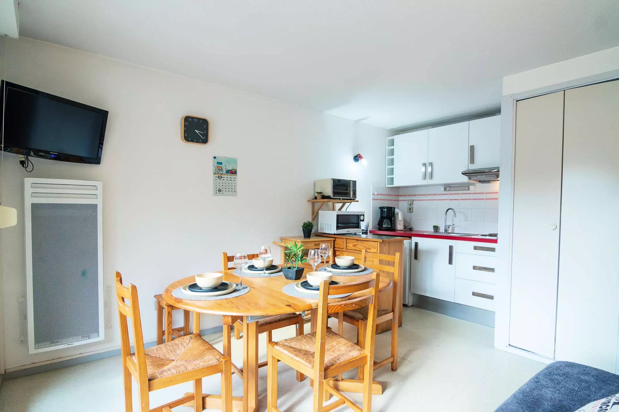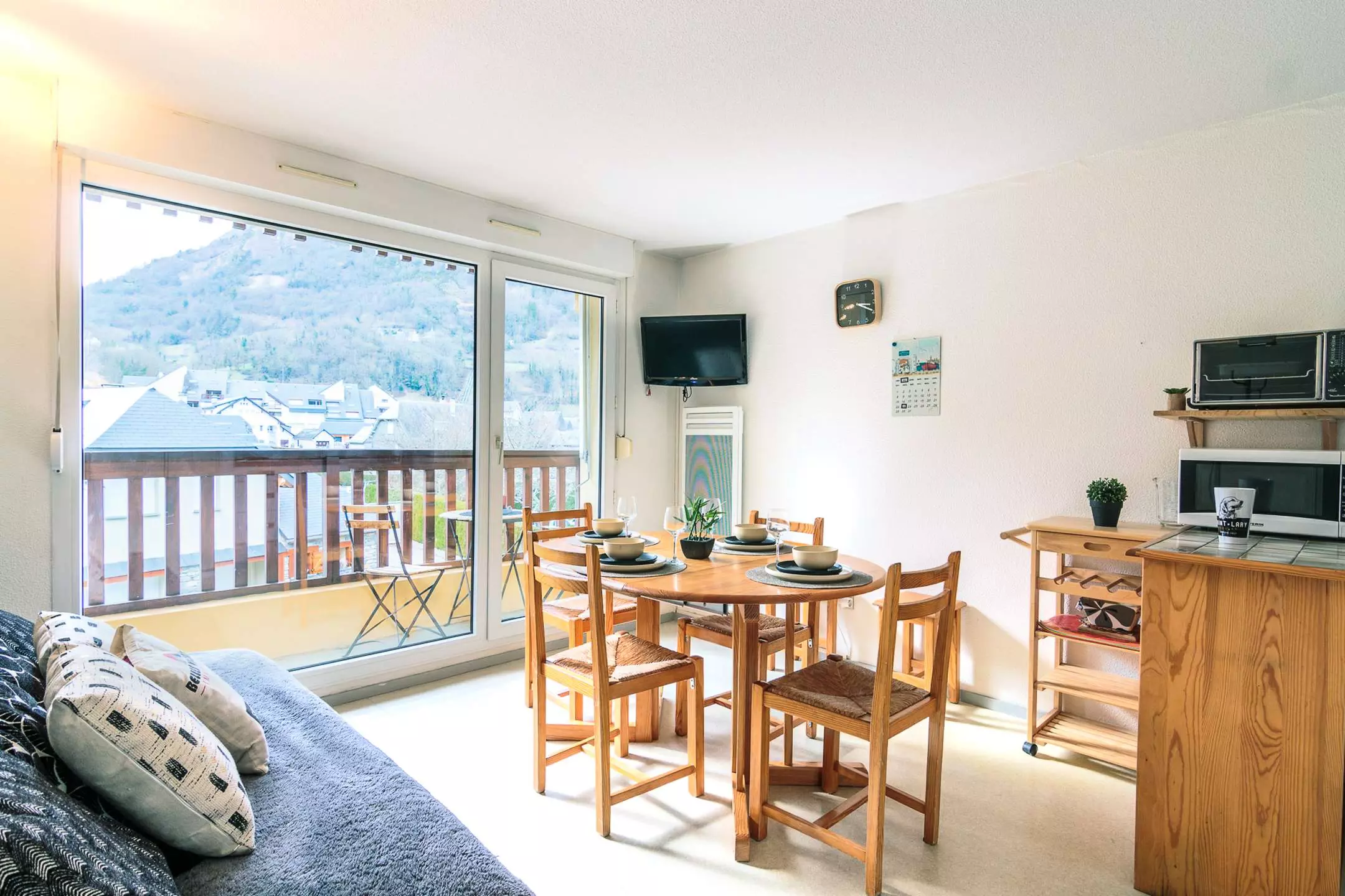 -Coin-cuisine équipé avec mini-four et micro-ondes ouvert sur le séjour. Balcon avec vue dégagée.