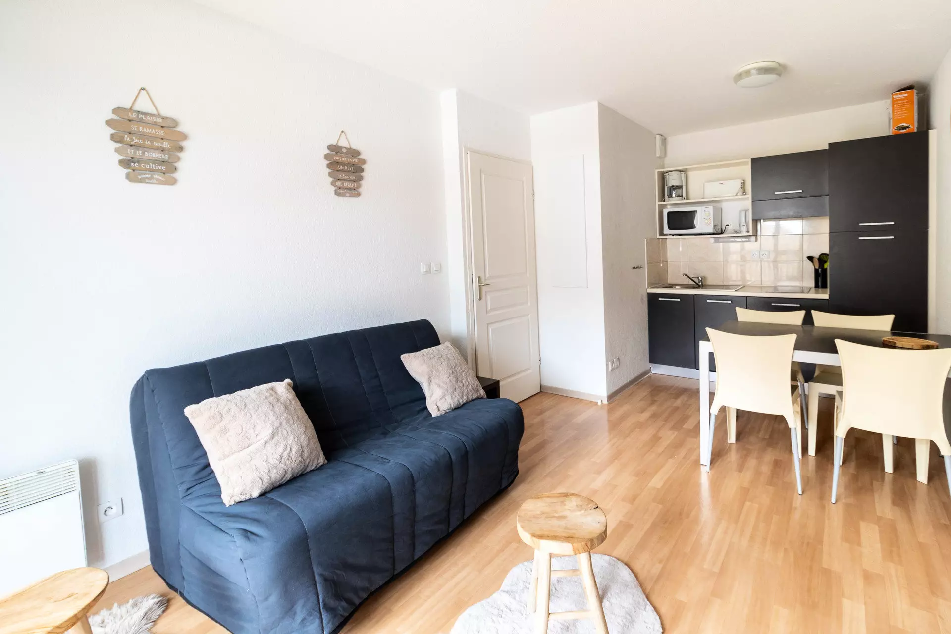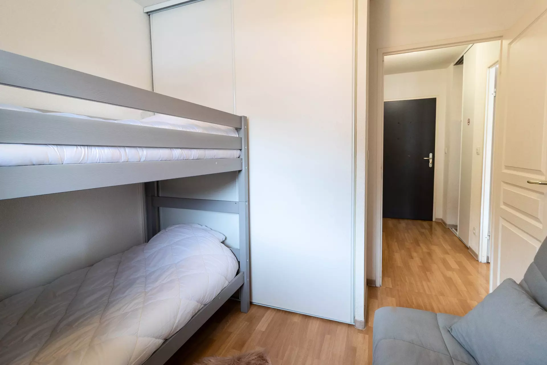 Coté couchage, l'appartement est équipé pour 4 personnes avec 1 chambre composée d'un lit superposé et d'un canapé convertible 2 personnes, ainsi qu'un canapé convertible dans la pièce à vivre.