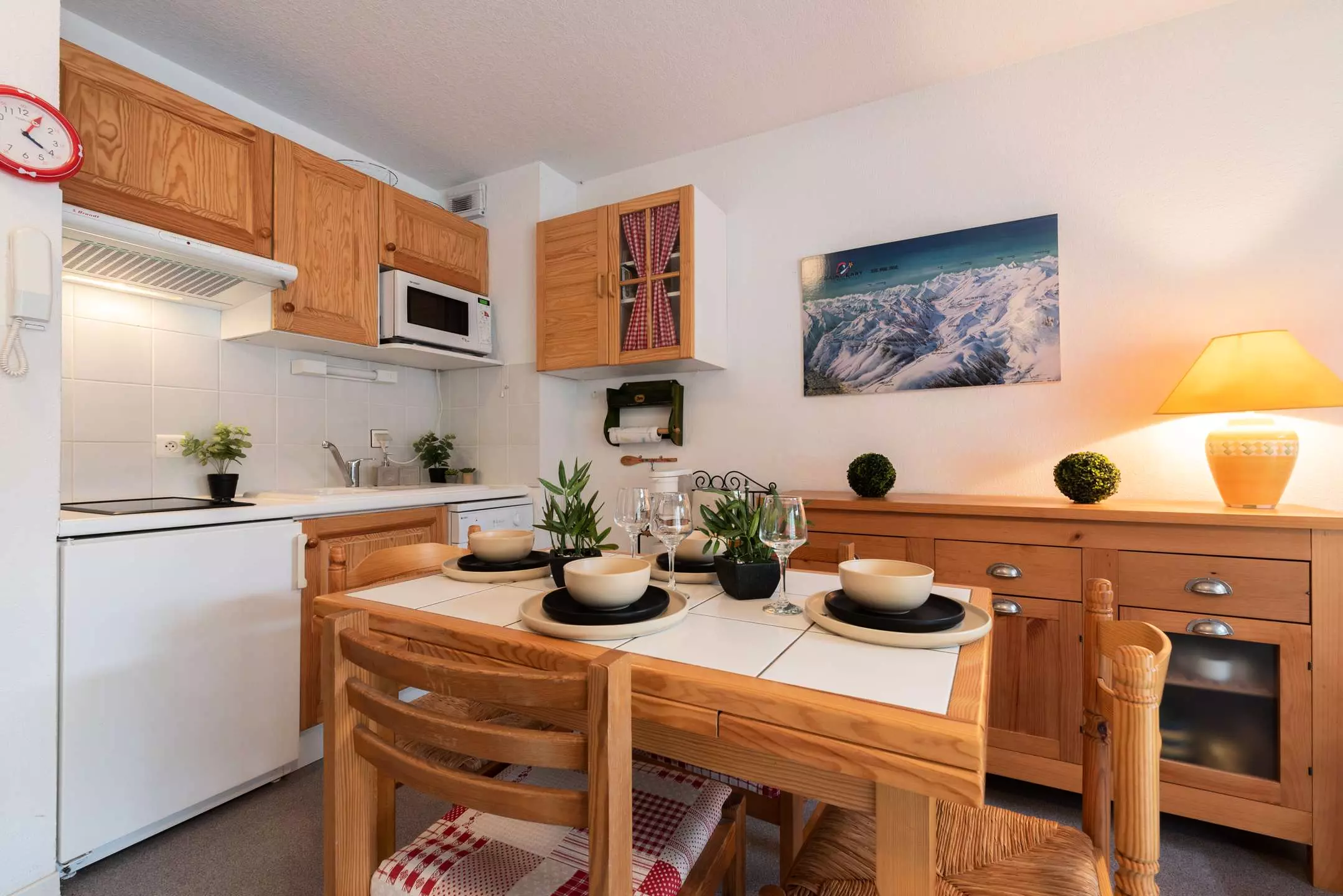 Kitchenette équipée et aménagée avec lave vaisselle, plaques vitrocéramiques (2feux), micro-ondes combiné, réfrigérateur