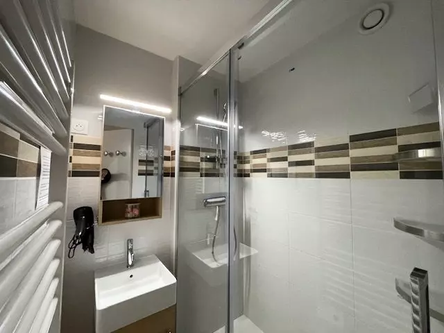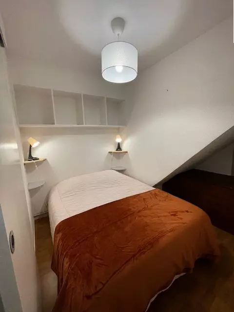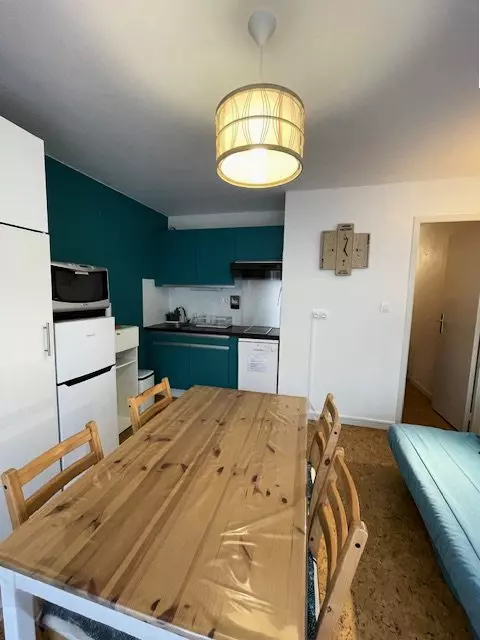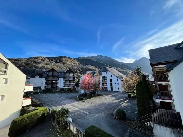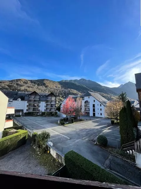 Au deuxième étage de la résidence Le Hameau des Thermes proche du télécabine, appartement 4 personnes avec séjour salon donnant sur un balcon exposée sud avec salon de jardin, une kitchenette équipée avec plaque vitro, lave-vaisselle, un grand frigo congélateur, et un micro-ondes grill, une salle d'eau et un wc séparés, un espace nuit séparé avec une petite fenêtre donnant sur l'extérieur avec un lit en 140, 2 lits superposées dans l'entrée. Sol gerflex et parquet dans l'espace nuit. Casier à ski mais pas de parking mais possibilité de se garer dans la rue. Appartement lumineux.
