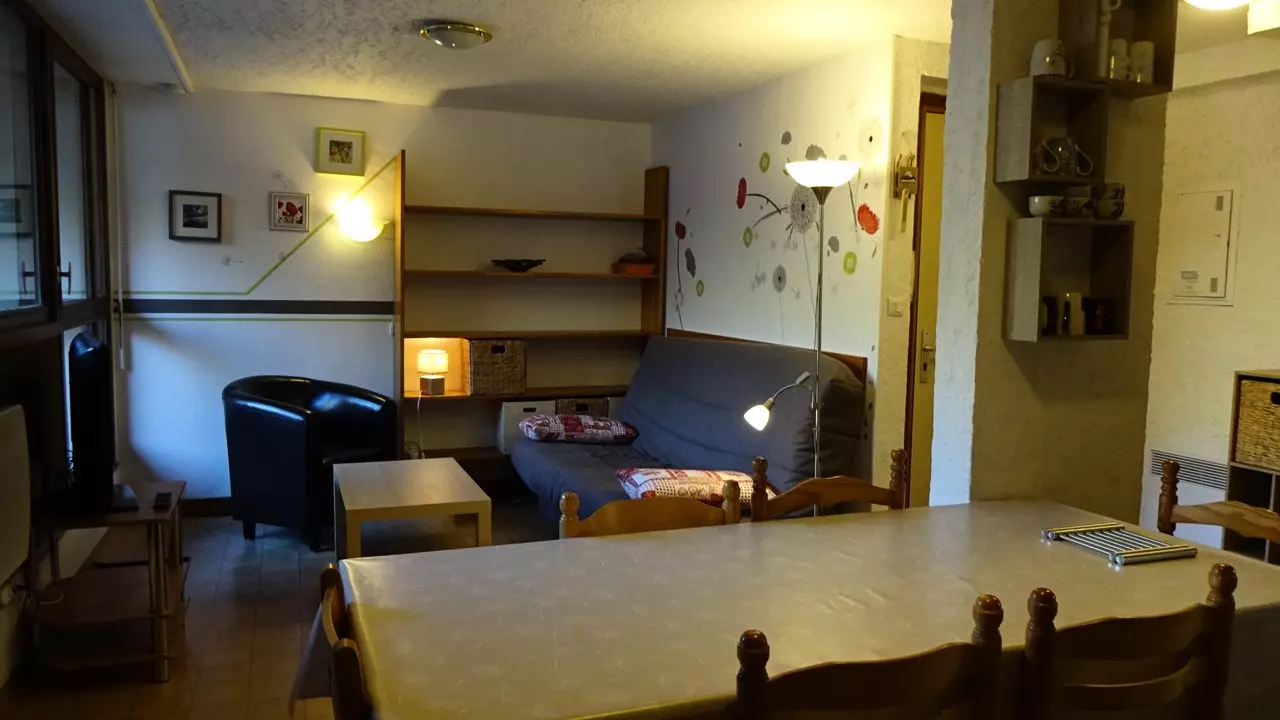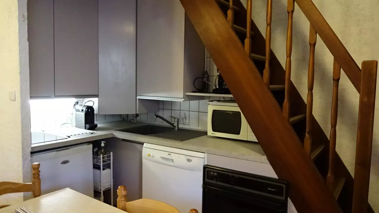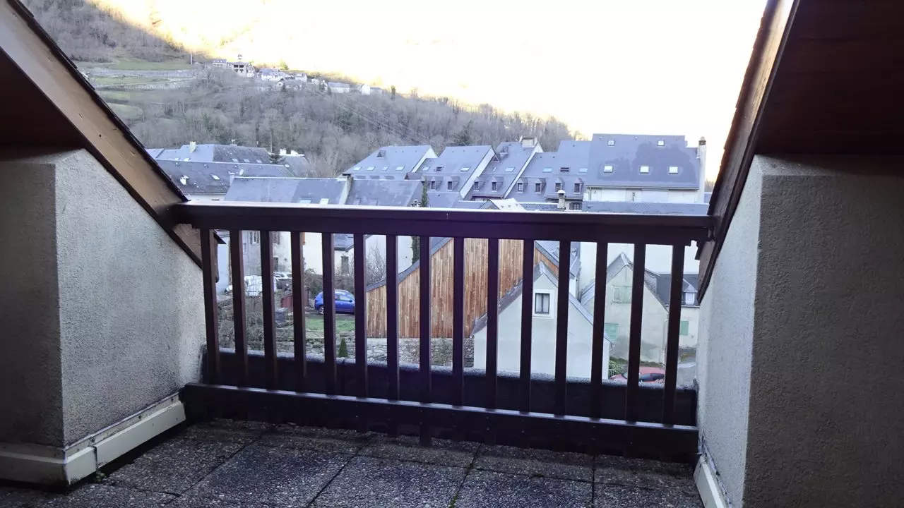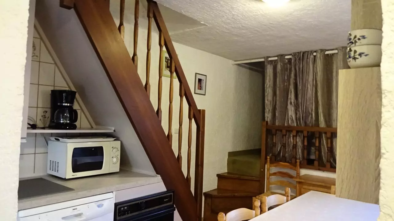 Dans la résidence Aurette, appartement composé : Un séjour avec canapé Clic-Clac, Kitchenette équipée 4 plaques vitro, micro-ondes, four, frigo et LV donnant sur terrasse Ouest vue Pla d'Adet. Une alcove avec un lit en 140. Salle d'eau avec douche et wc. A l'étage un espace nuit avec velux et un lit en 140 et un espace nuit sans fenêtre avec 2x90 superposés.