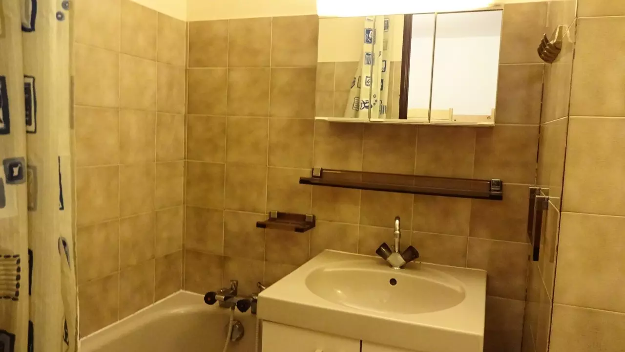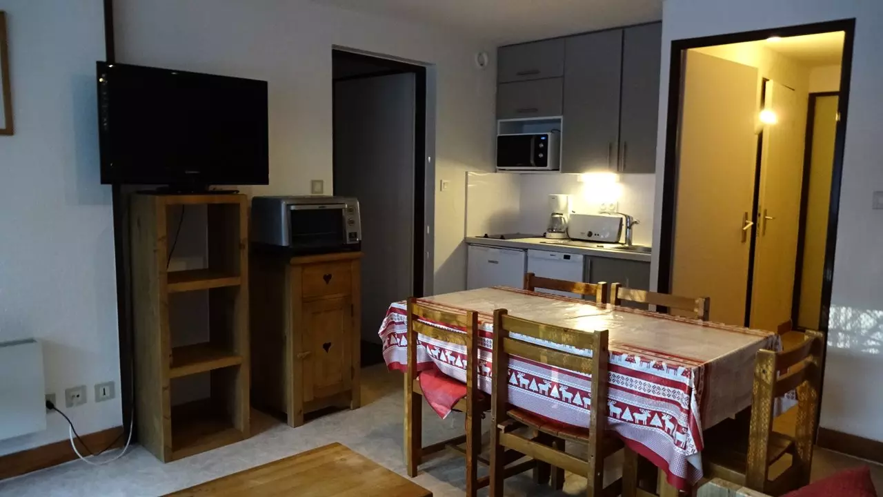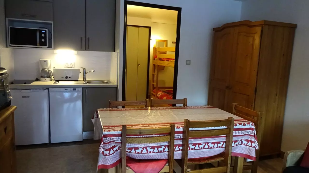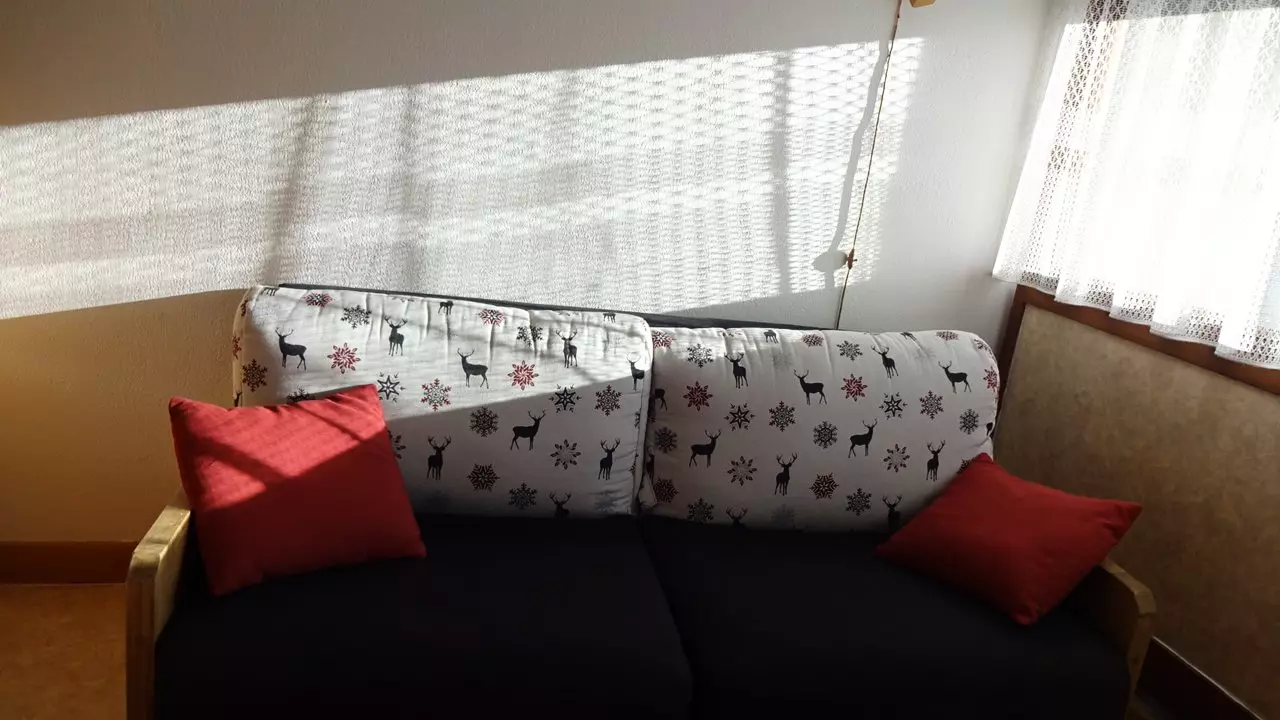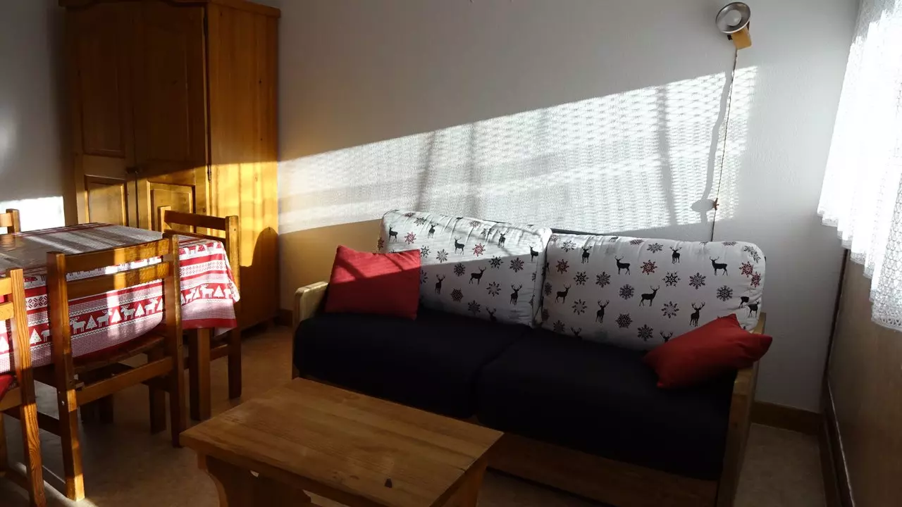 Dans la résidence AURETTE dans le centre du village, au 1er étage avec ascenseur, appartement pour 4/6 personnes de 38 m² comprenant un séjour avec un canapé RAPIDO et kitchenette équipée et rangements donnant sur une loggia exposée au Sud. Une chambre avec un lit en 140. Un coin nuit à l'entrée avec 2 lits superposés. Salle de bain avec wc. Mobilier en pin . Sol gerflex et moquette dans la chambre. Place de parking et casier à ski. Exposé sud.