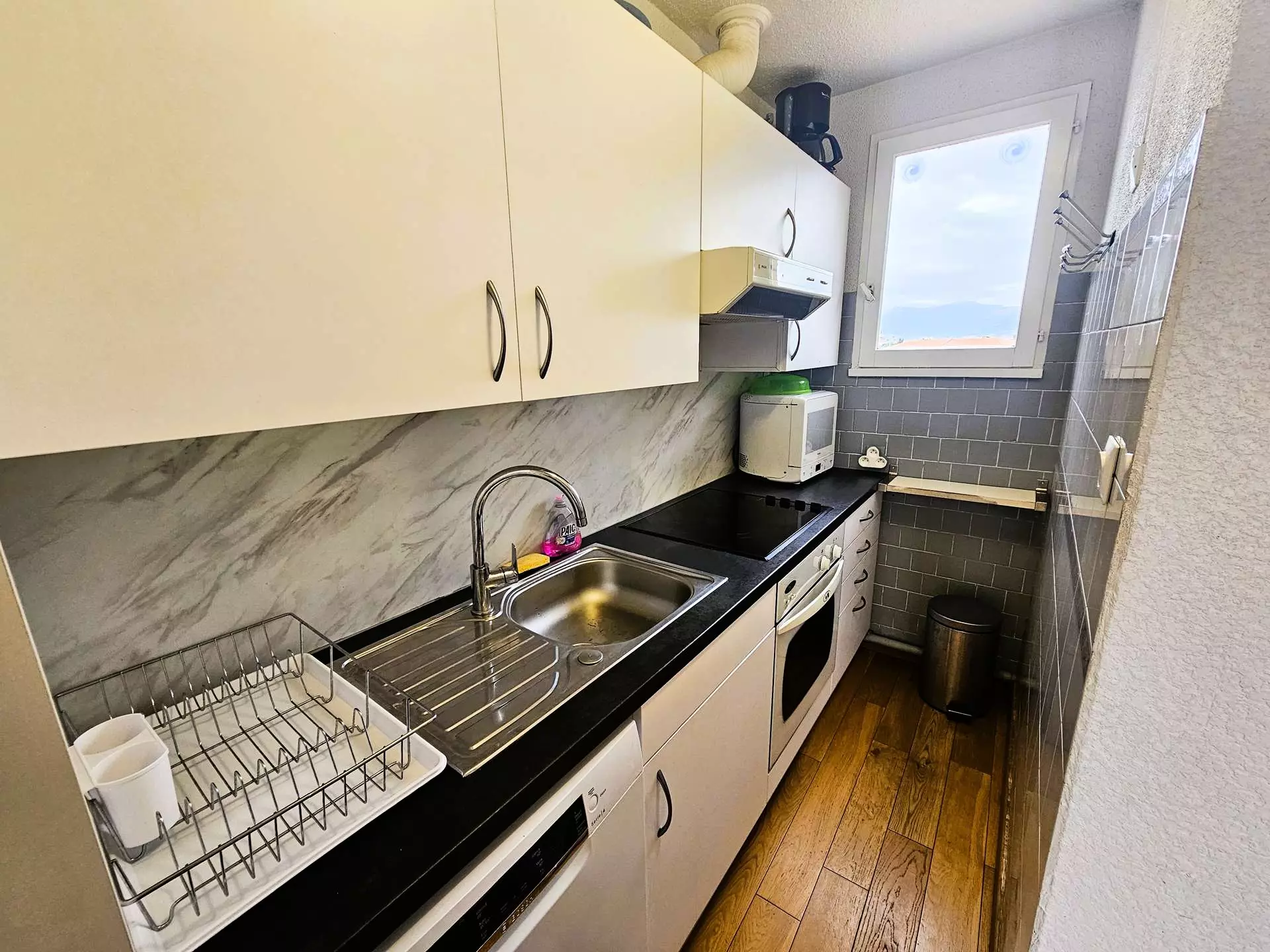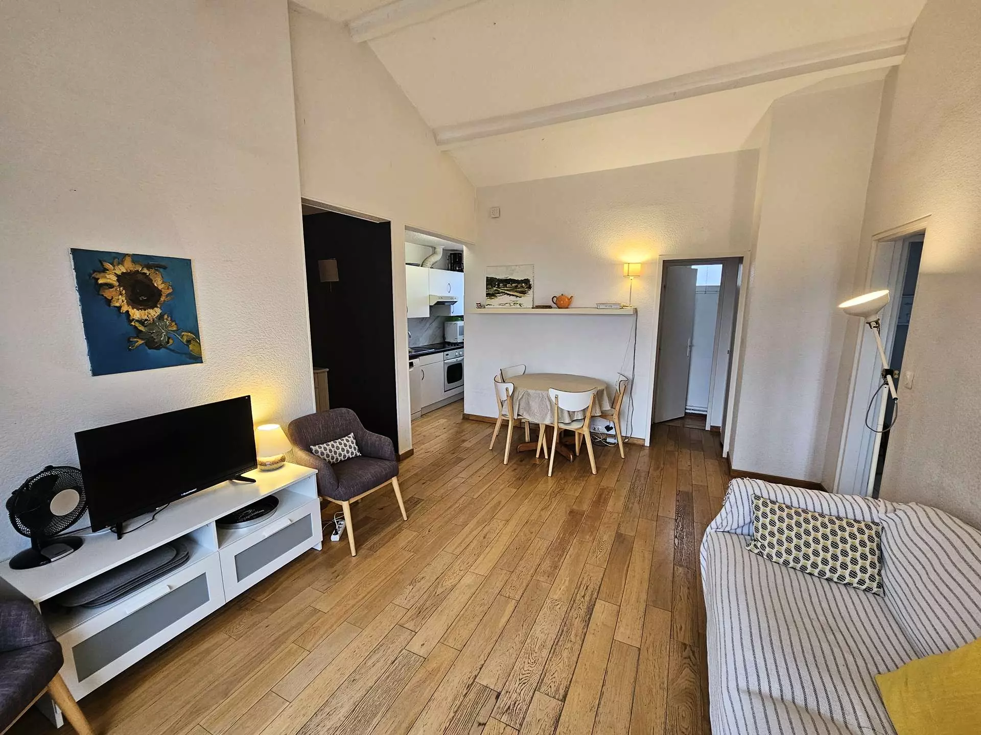 Une cuisine équipée, ouverte sur un séjour climatisé, lumineux, composé d'un canapé convertible et d'un téléviseur, lui même avec un accès direct sur la terrasse.