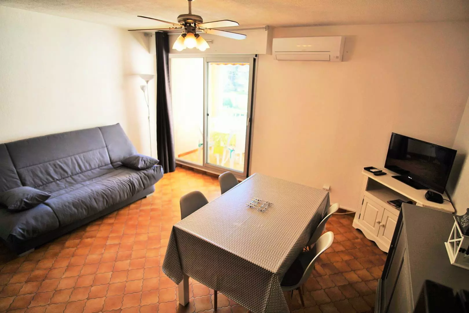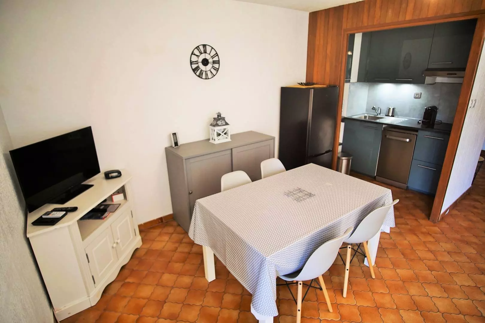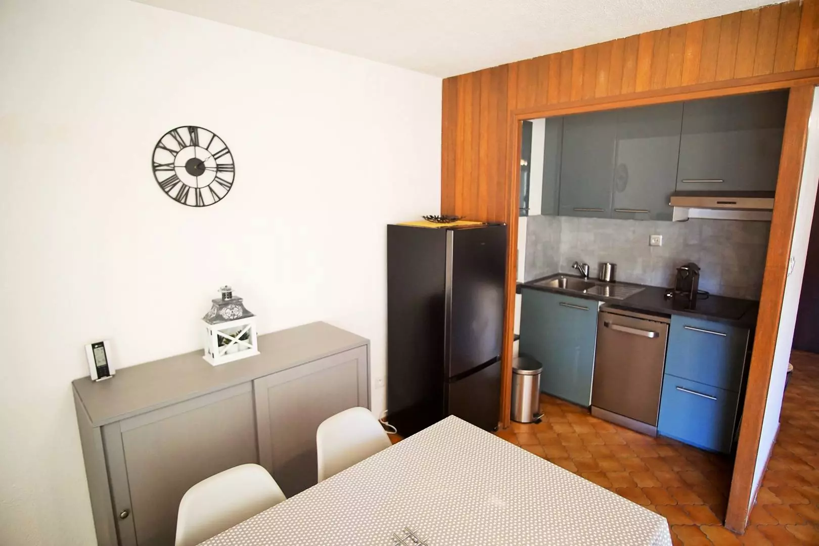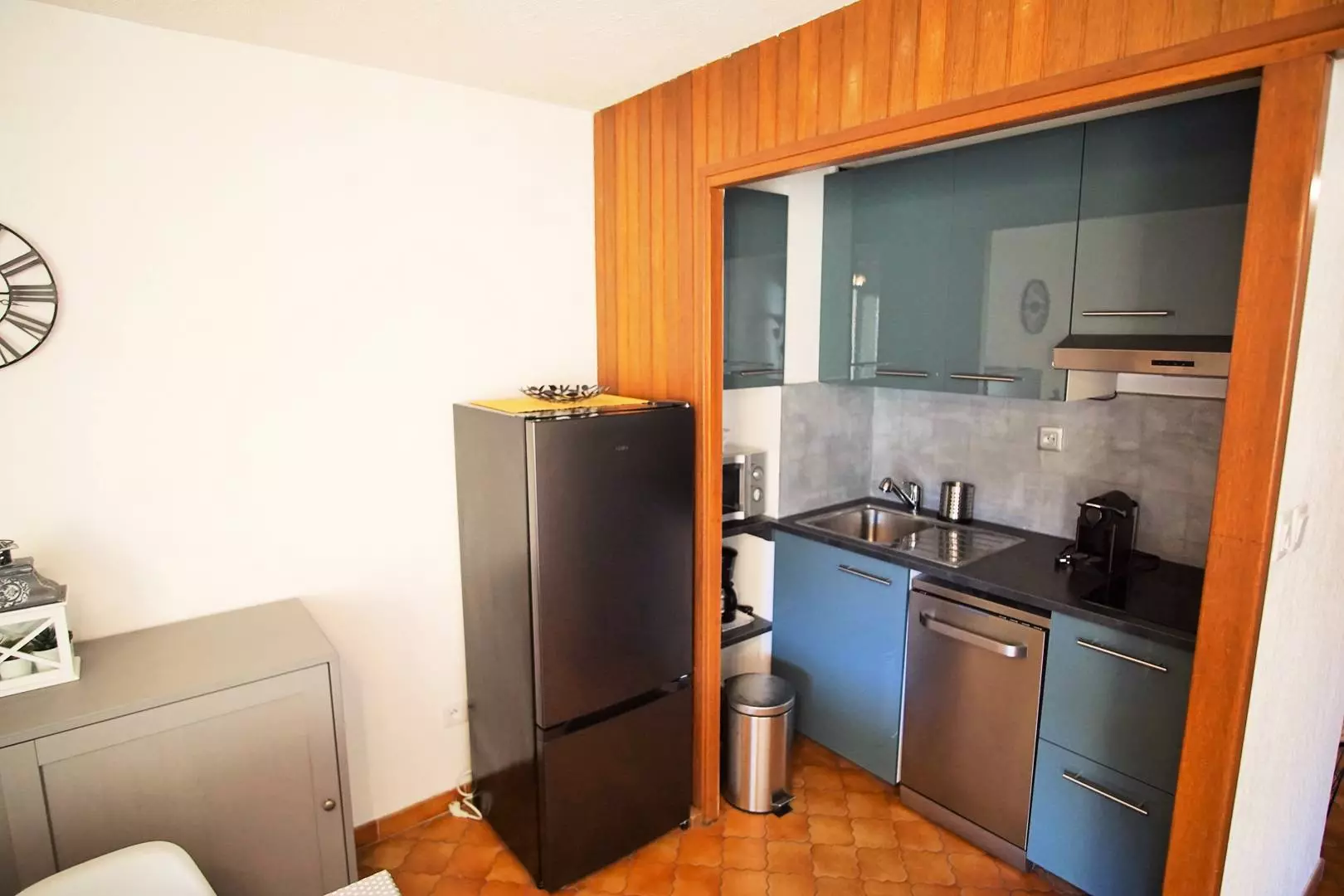 Cuisine équipée et ouverte sur le séjour, canapé convertible, terrasse, télé.