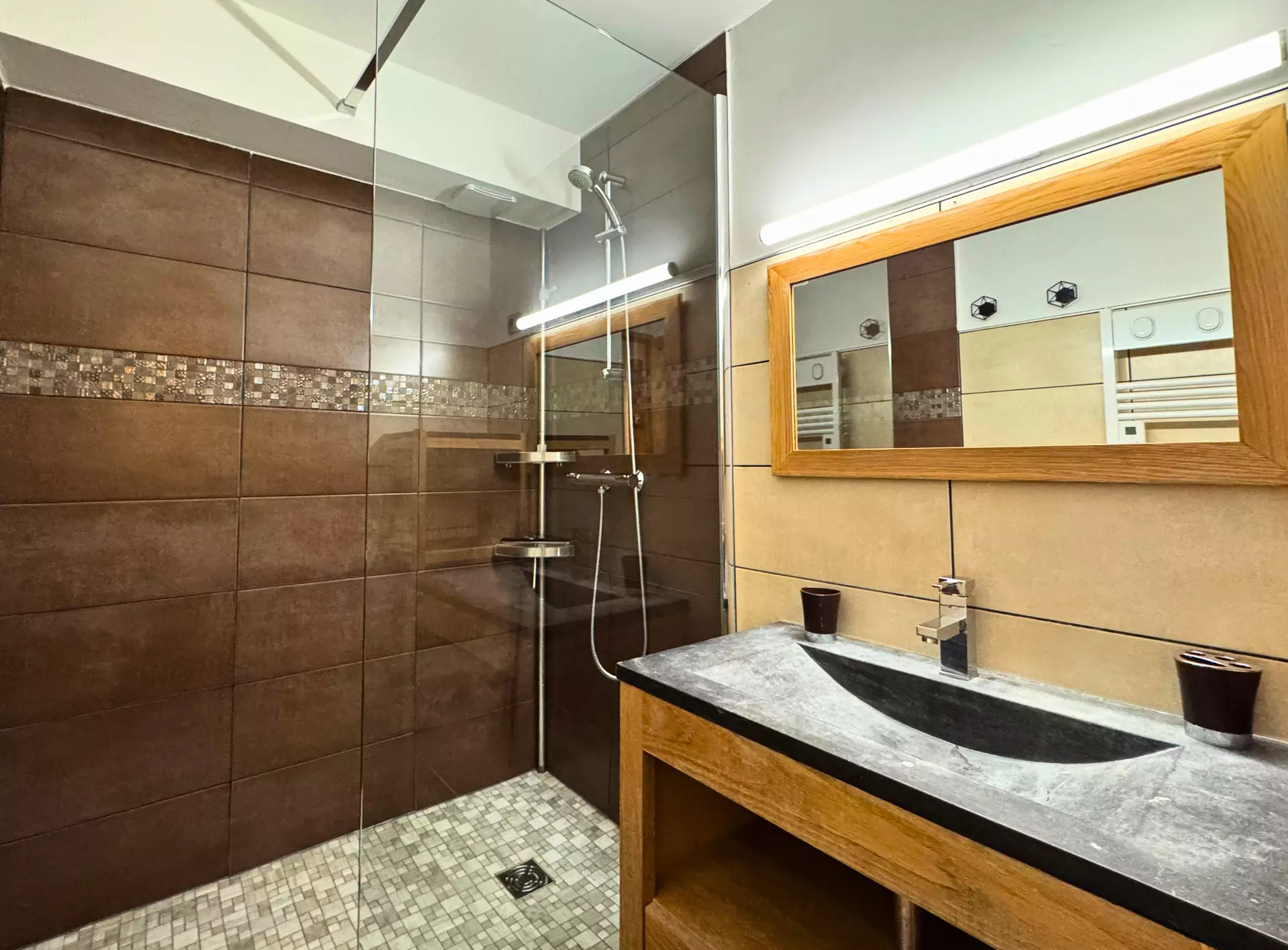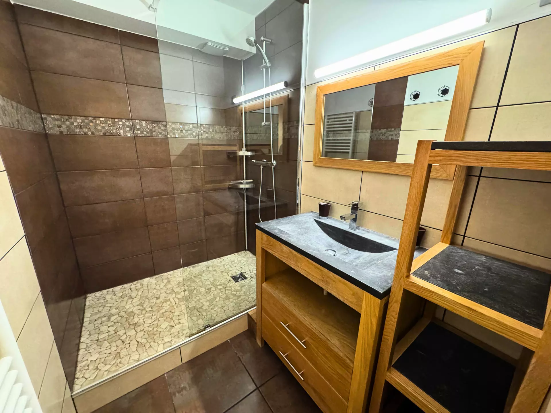 Salle de bain : lavabo, douche, sèche-serviettes, sèche-cheveux