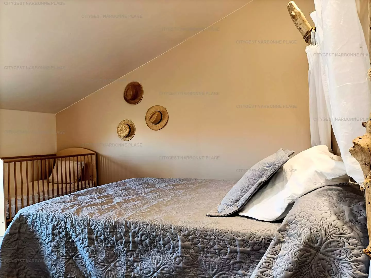 A l'étage, un deuxième wc séparé, une chambre parentale avec lit double 140 + lit bébé et dressing. Une autre chambre avec deux lits superposés ainsi qu'un lit simple + des rangements. Dernière chambre avec lit double 140, rangements et accès direct sur un solarium.