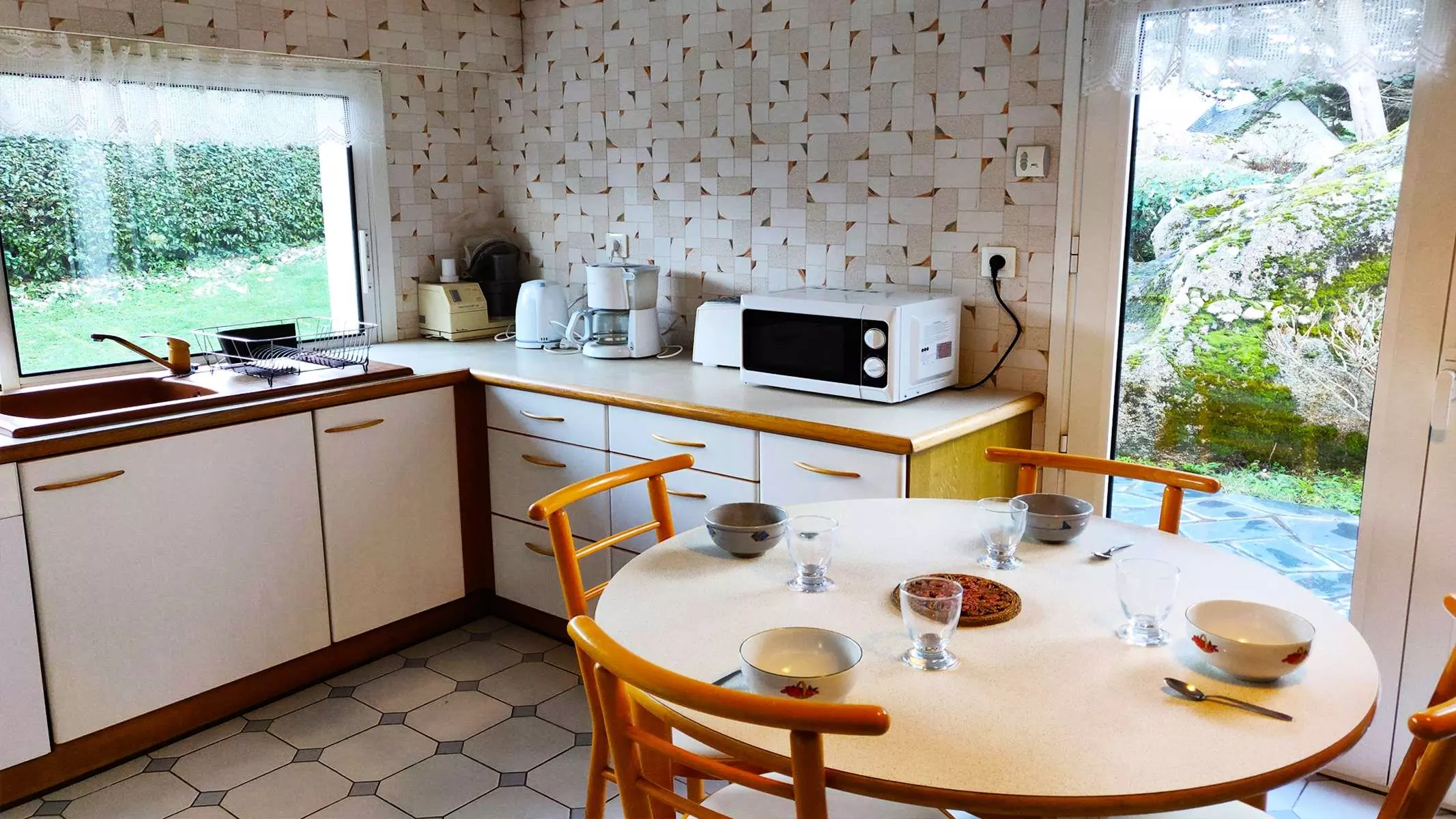 Équipements de la maison : réfrigérateur-congélateur, plaque de cuisson électrique, lave-vaisselle, four électrique et micro-ondes, cafetière classique, grille-pain, bouilloire. Lave-linge et sèche-linge. Canapé et fauteuils, Téléviseur et connexion Wifi. 3 lits 160x200 (literie récente). Oreillers et couettes pour les lits. Mobilier de jardin, parasol et barbecue électrique. Grand jardin parsemé de rochers.