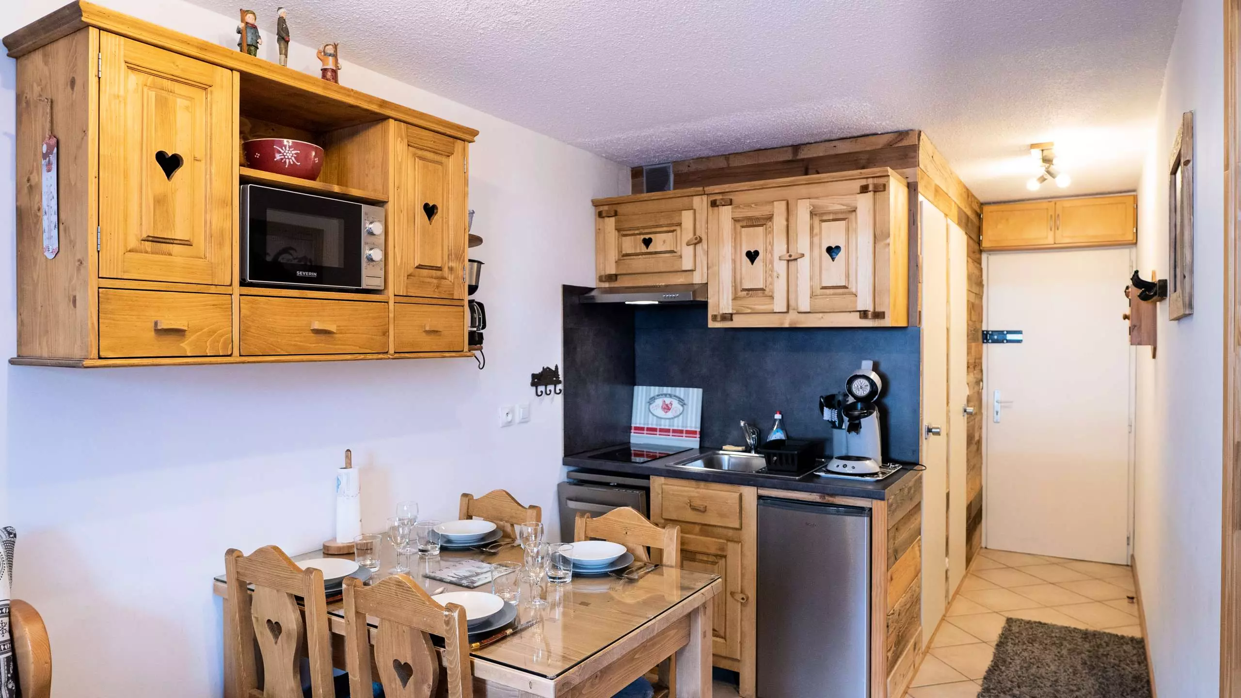 - Kitchenette toute équipée pour 4 personnes avec deux plaques de cuisson à induction, lave-vaisselle, micro-ondes, réfrigérateur, cafetière filtre, cafetière Senseo et bouilloire.