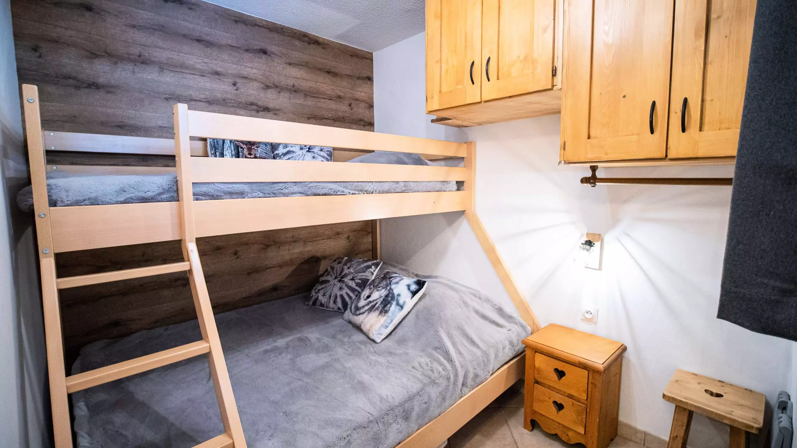 - Une chambre pour 3 personnes avec lit double et un lit superposé simple. Équipés de couettes.