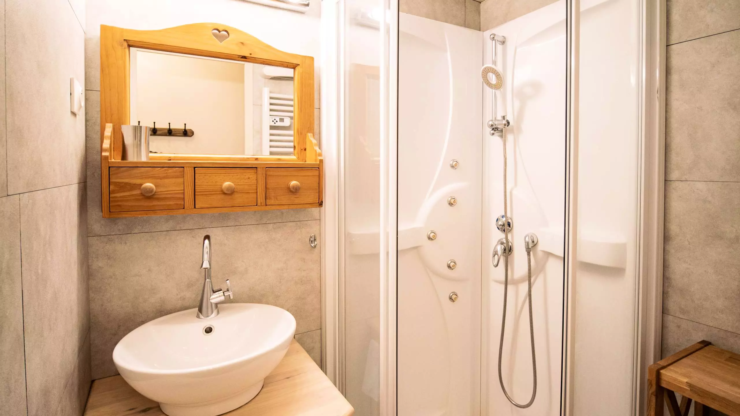 - Une salle de bain avec un sèche-serviette et un toilette indépendant.