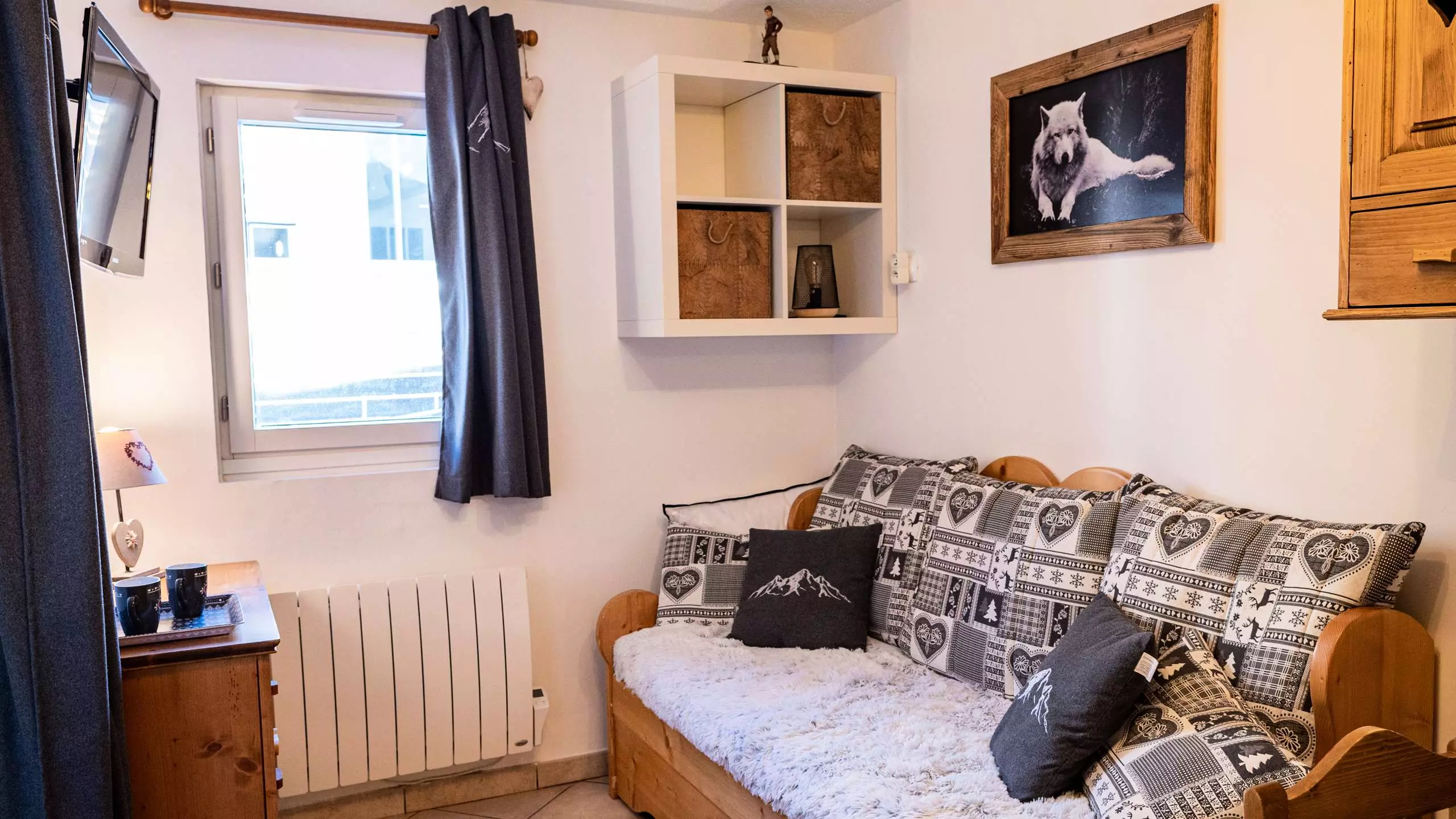 - Séjour équipé d’un canapé/banquette et d’une télévision.