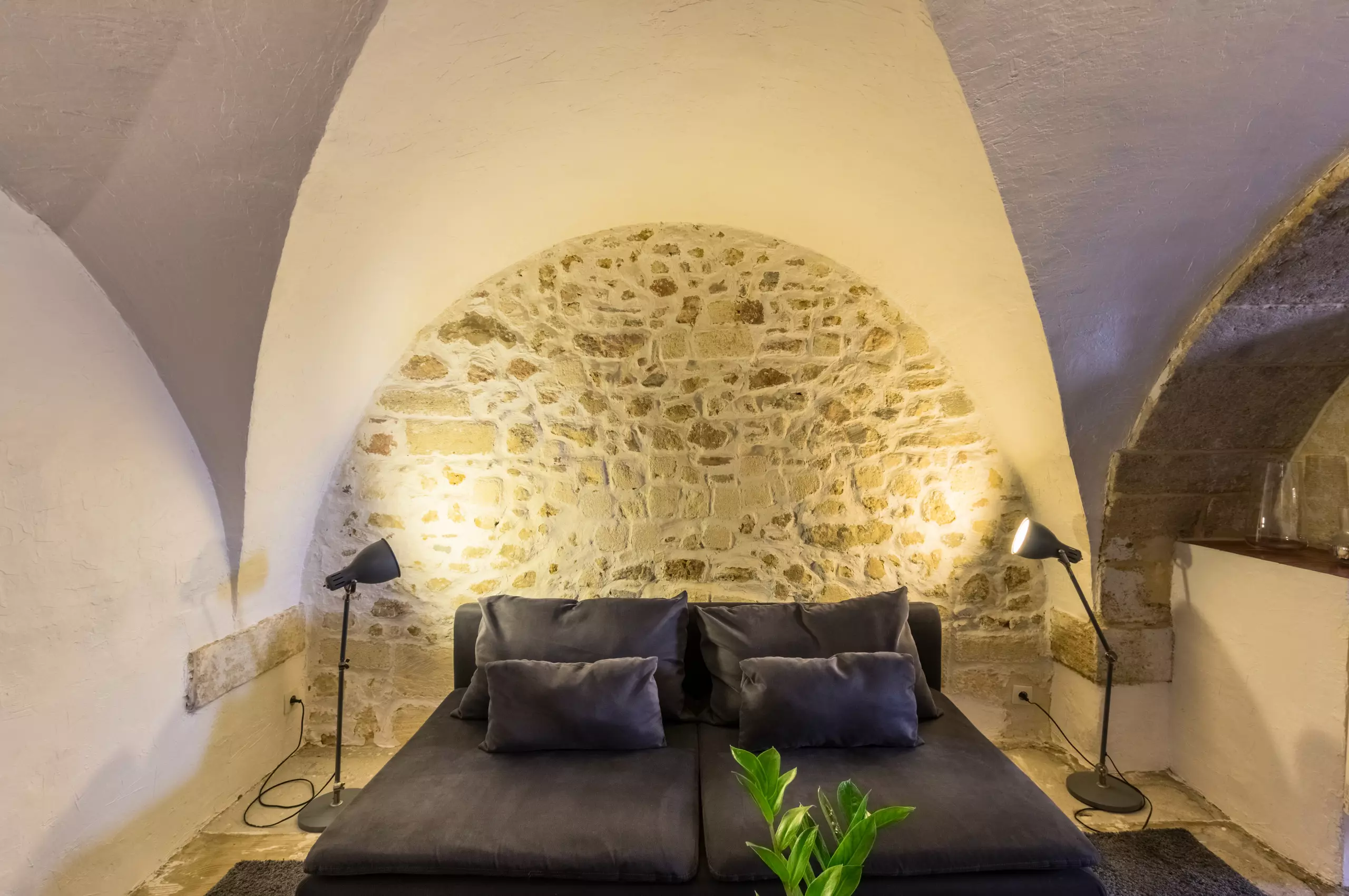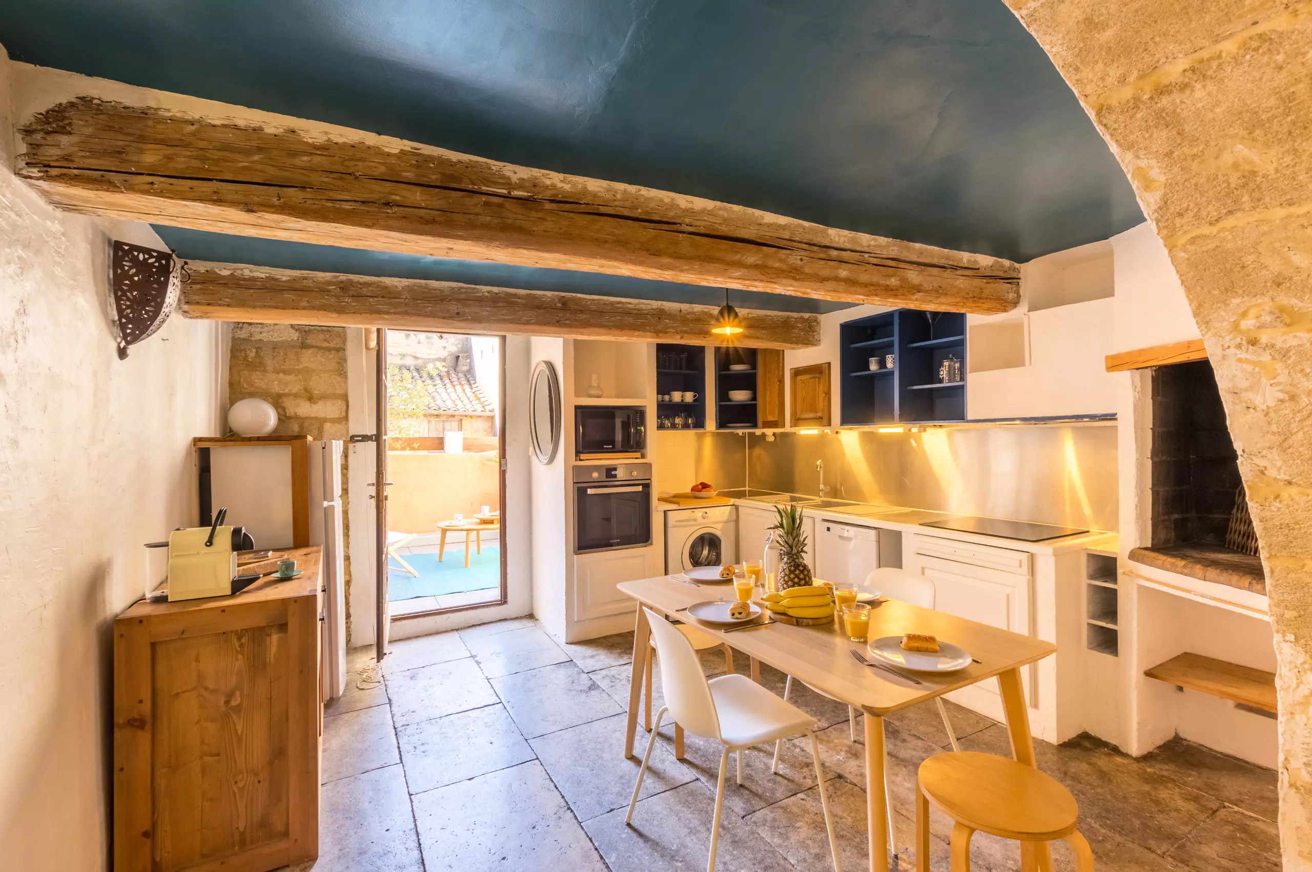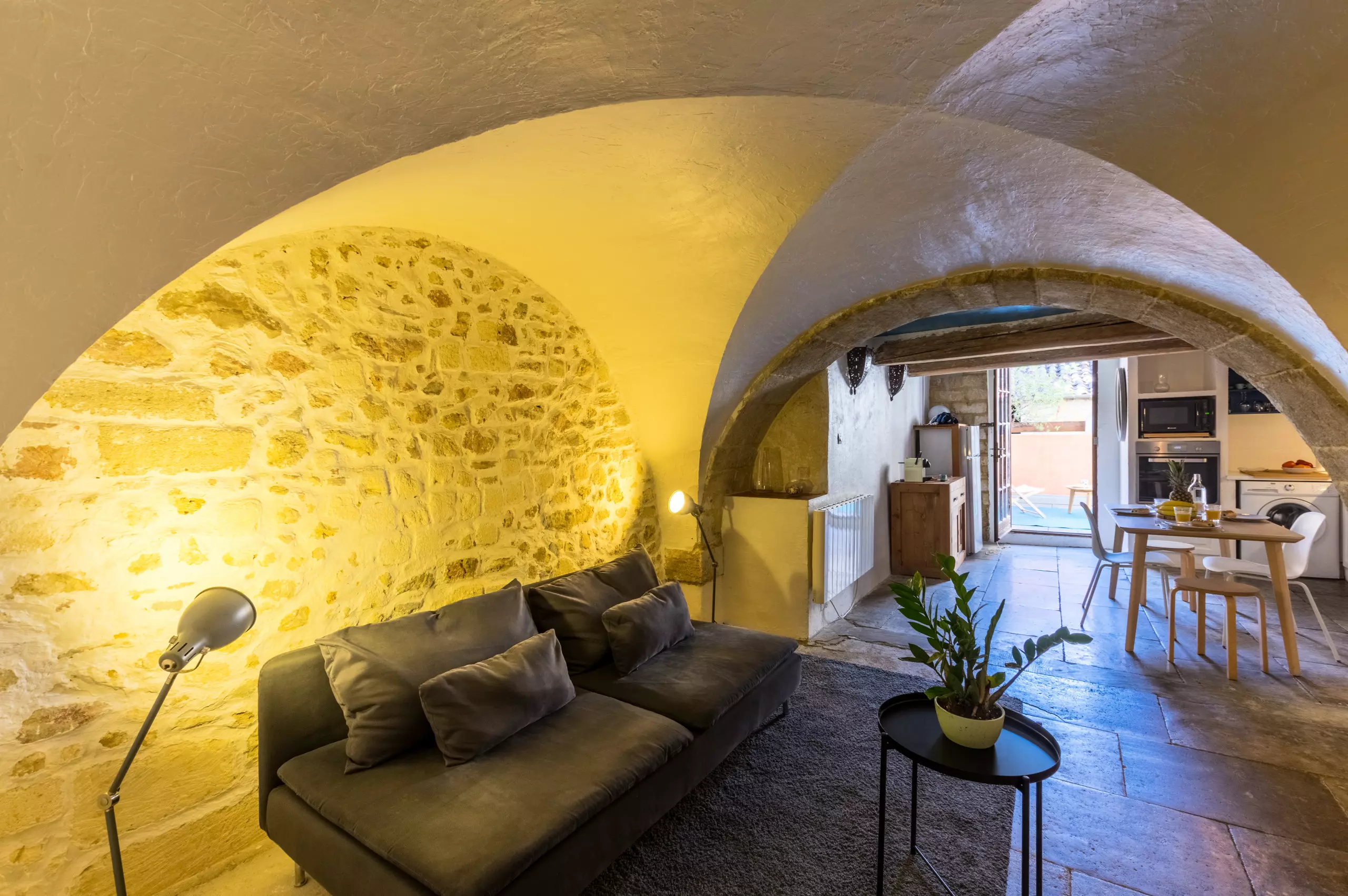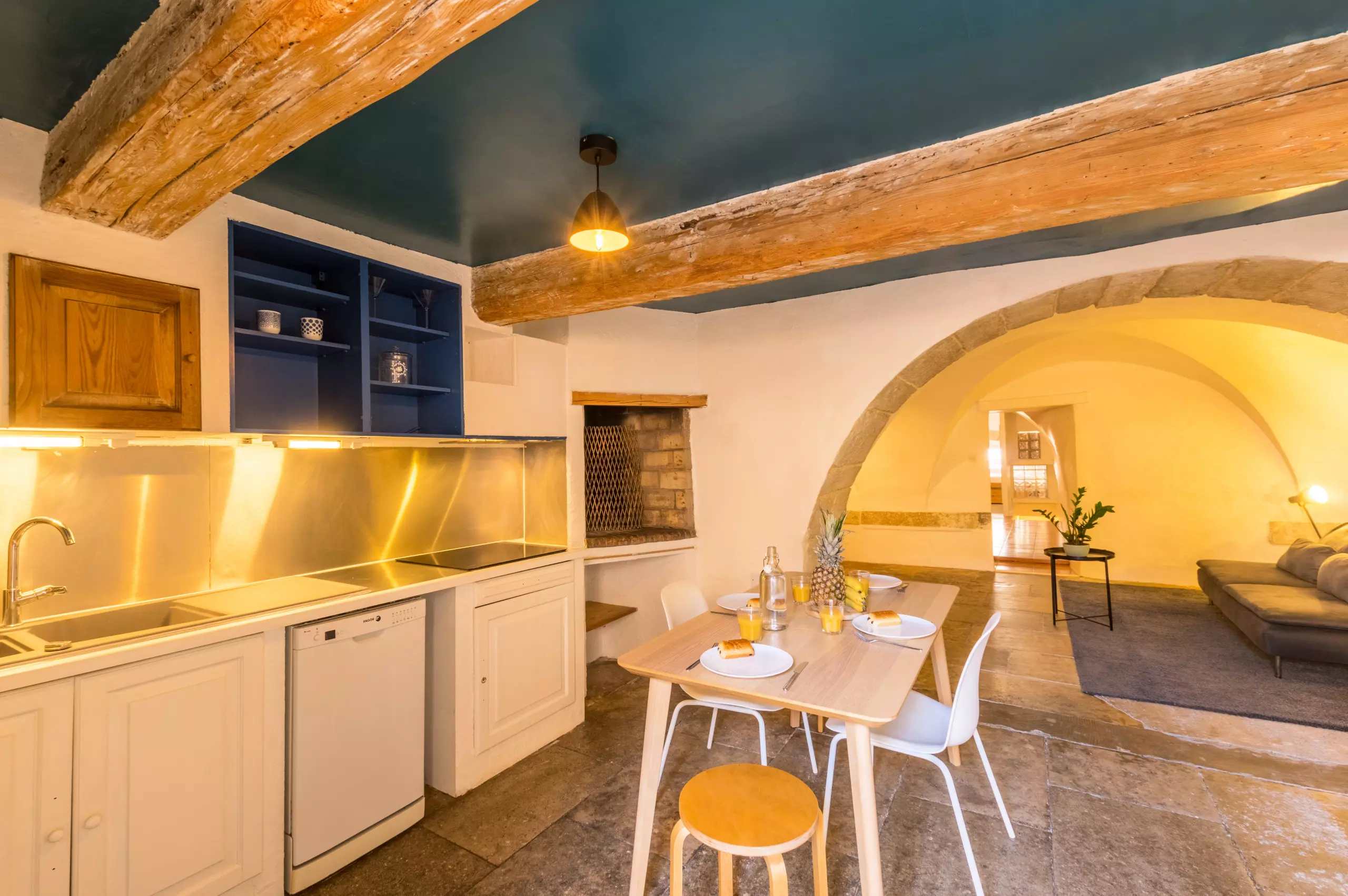Cet appartement offre un cadre unique avec ses plafonds voûtés anciens, ses pierres apparentes et ses barres au sol typiques de Montpellier dans la cuisine et le salon.
