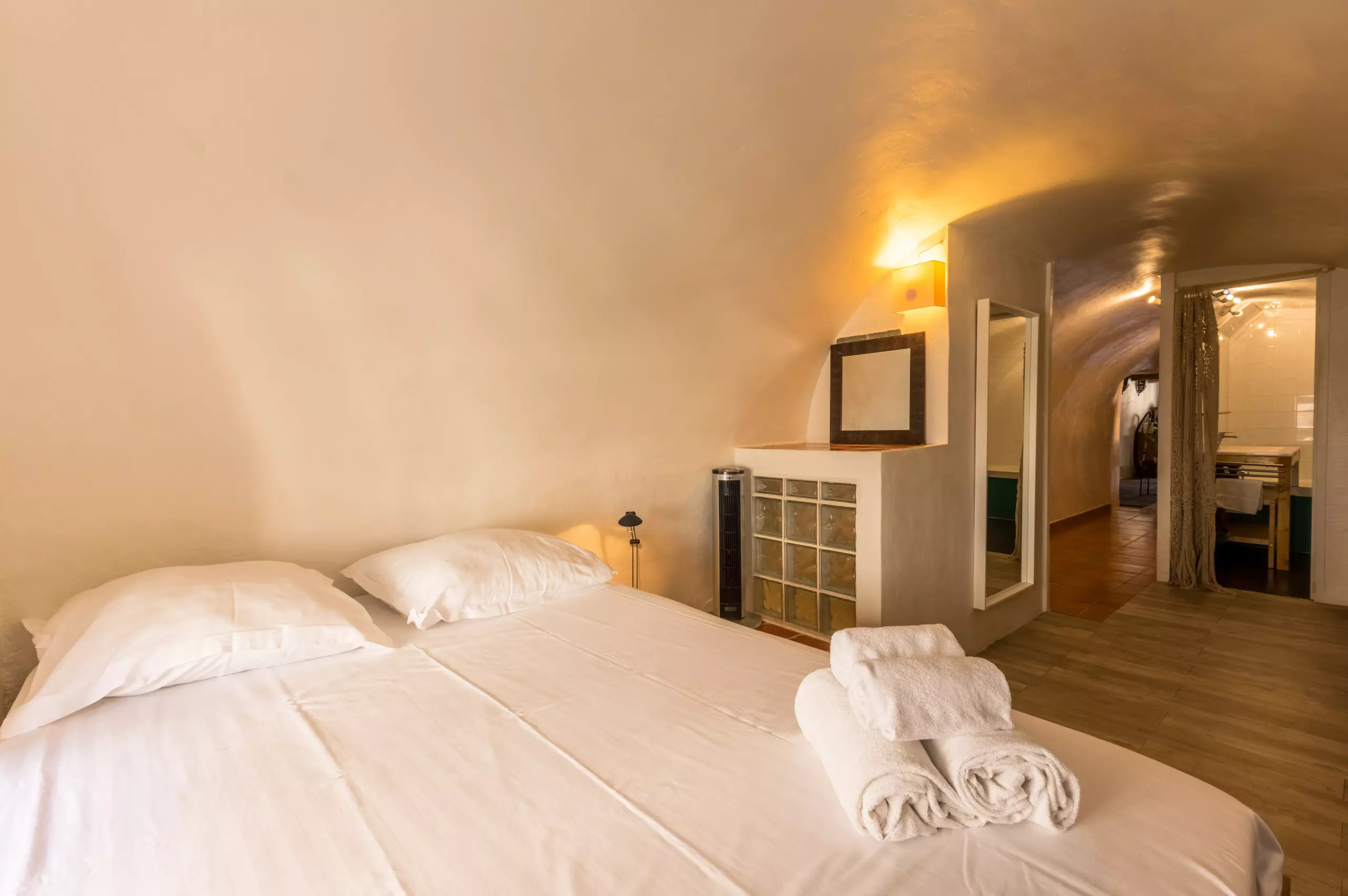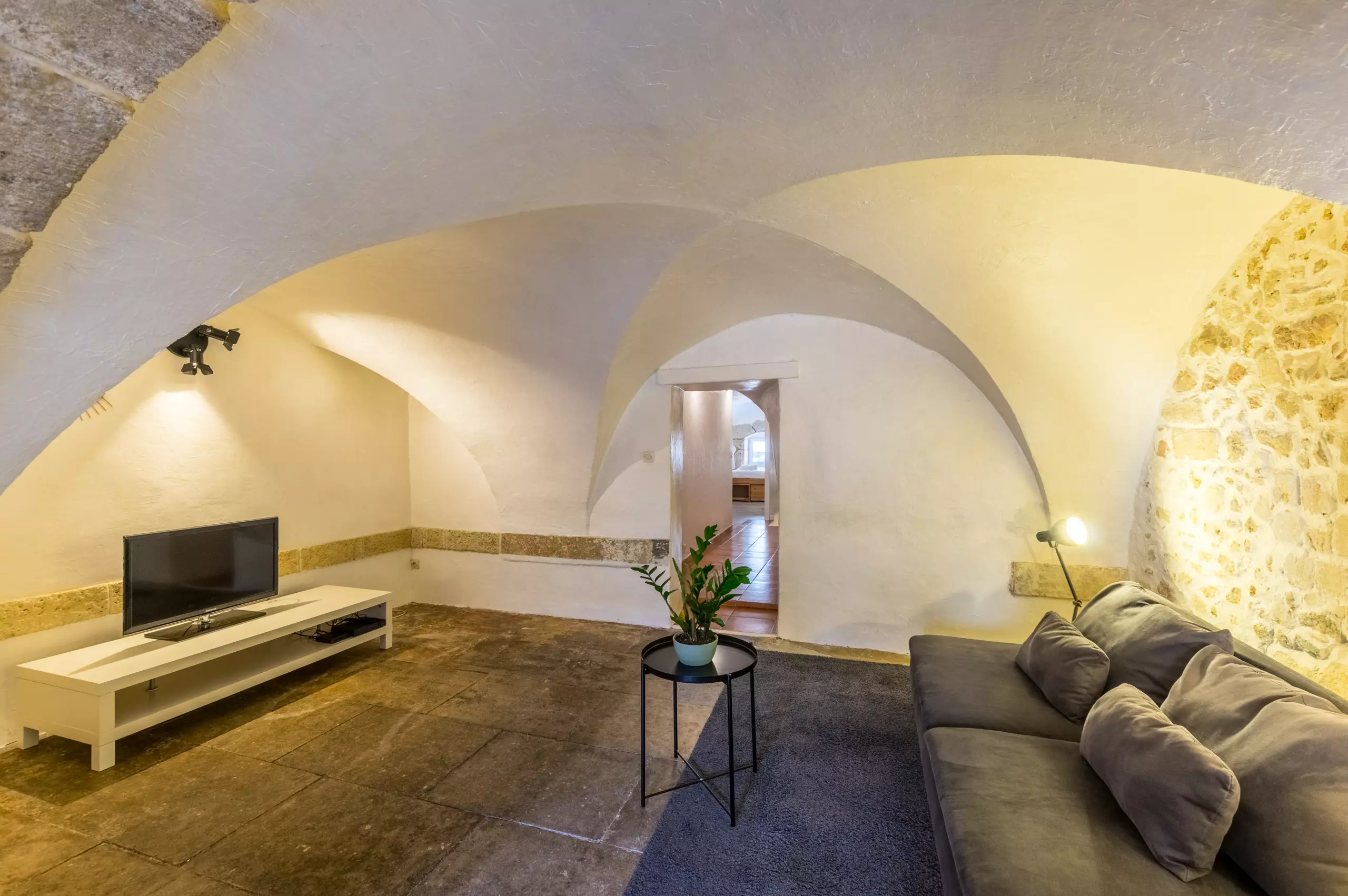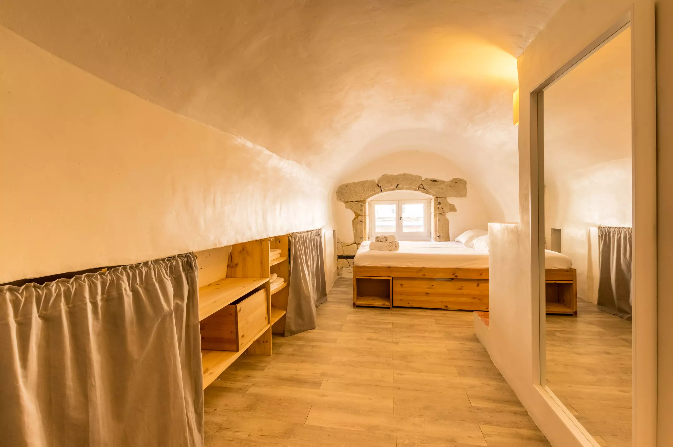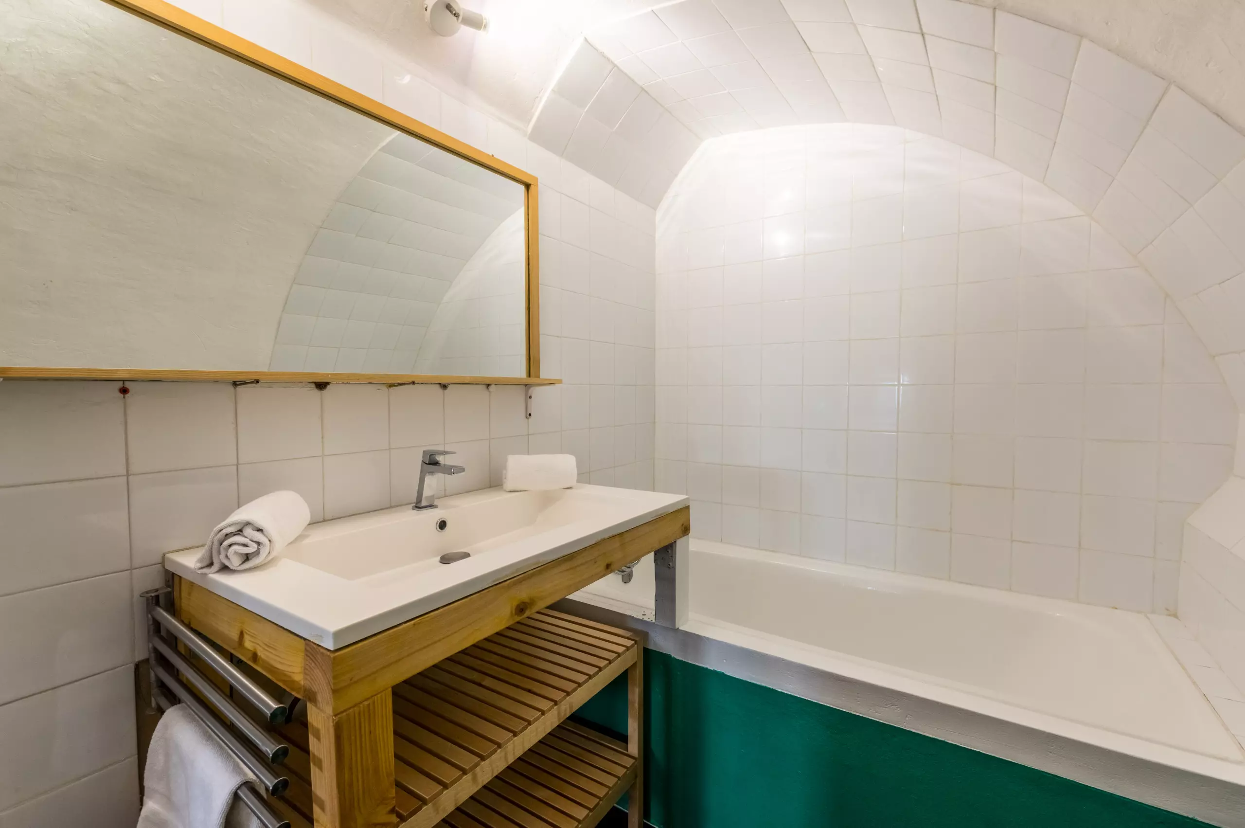 Cet appartement offre un cadre unique avec ses plafonds voûtés anciens, ses pierres apparentes et ses barres au sol typiques de Montpellier dans la cuisine et le salon.