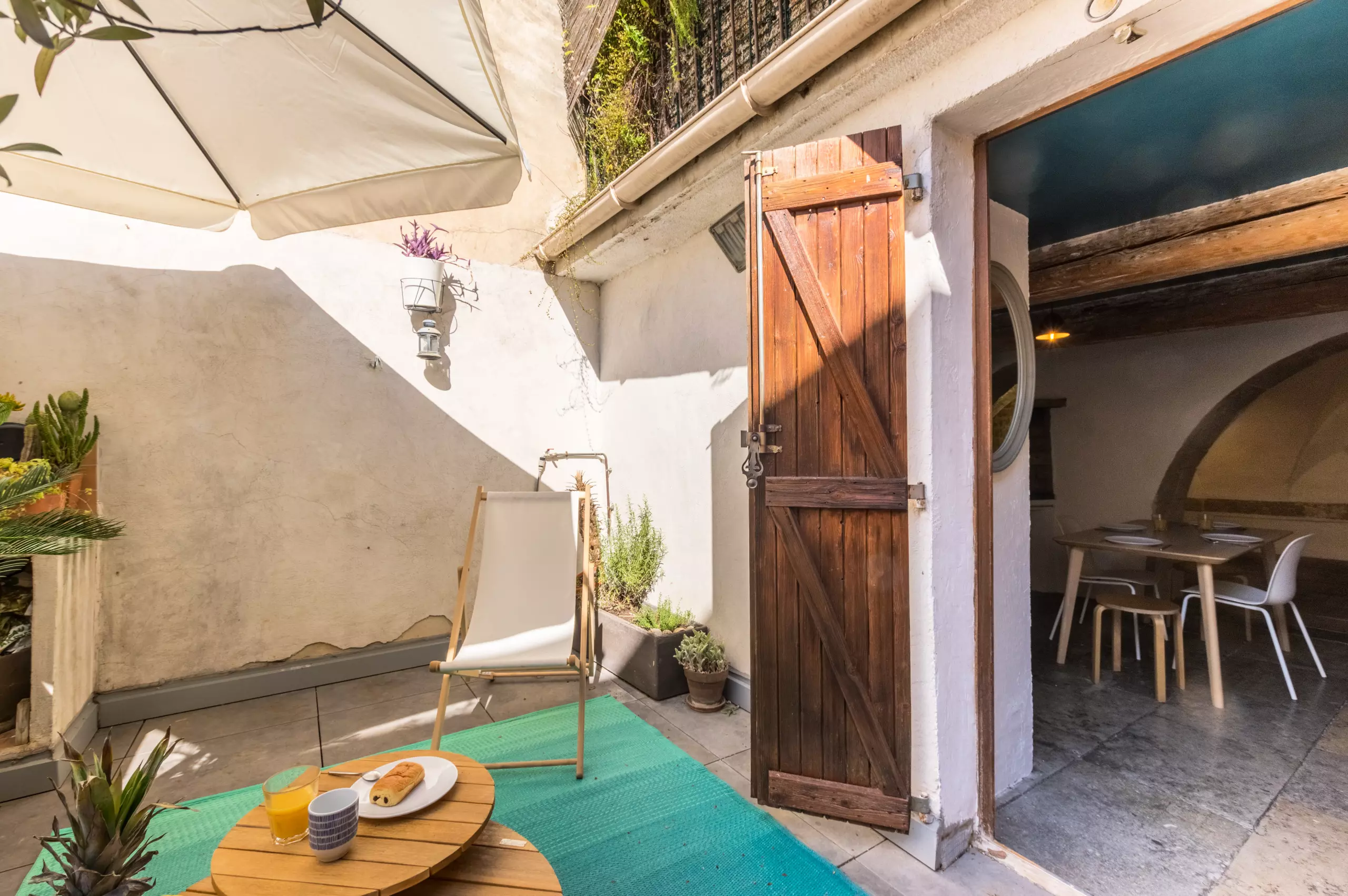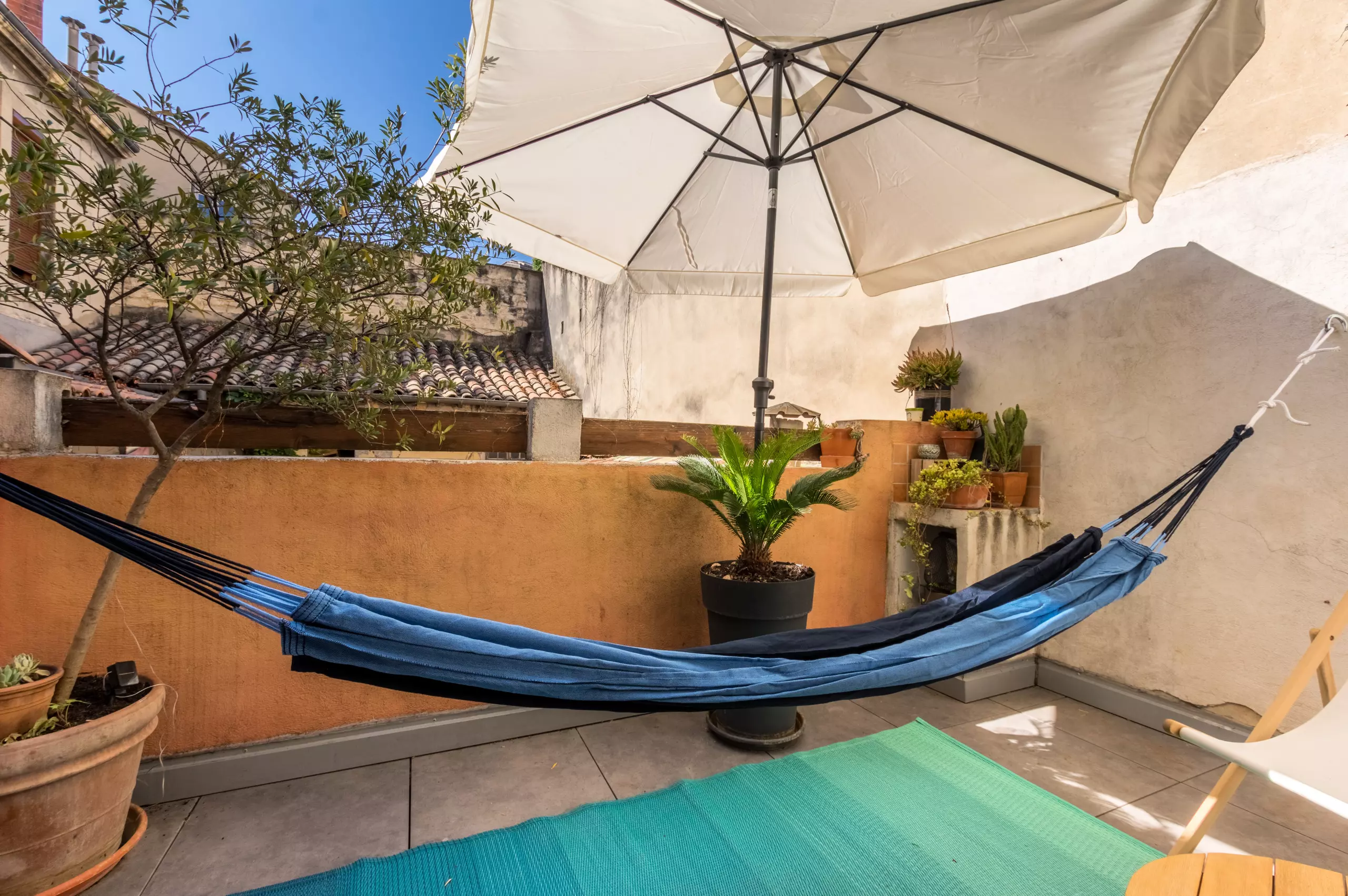 Vous profiterez d’une terrasse végétalisée spacieuse, au calme et sans vis-à-vis, espace très rare en cœur de ville. Hamac à disposition.