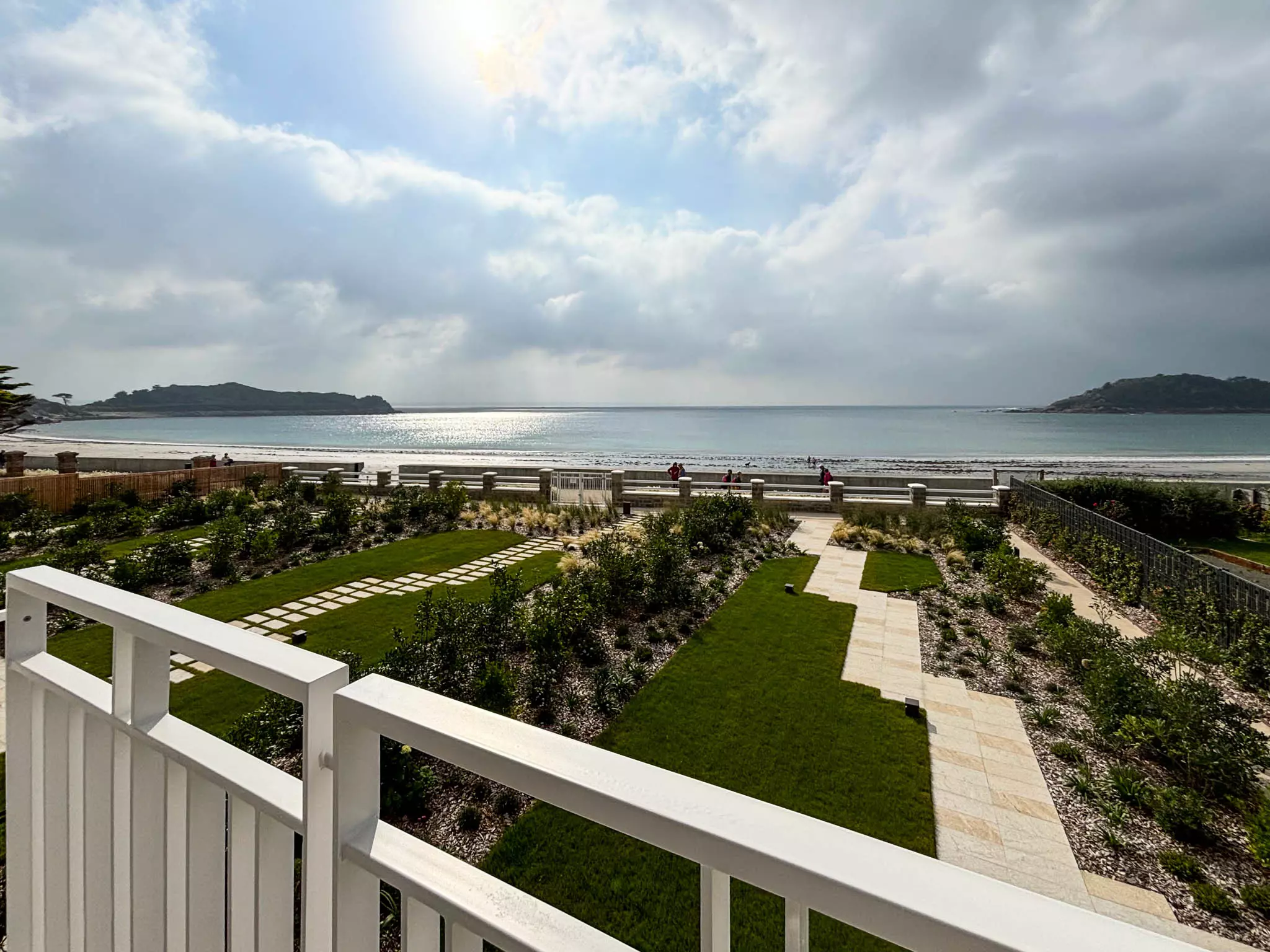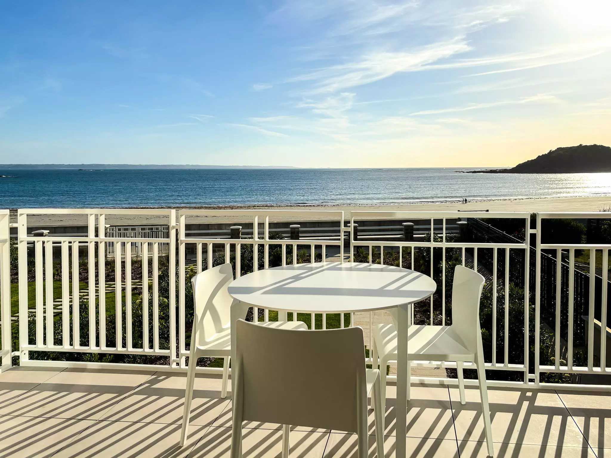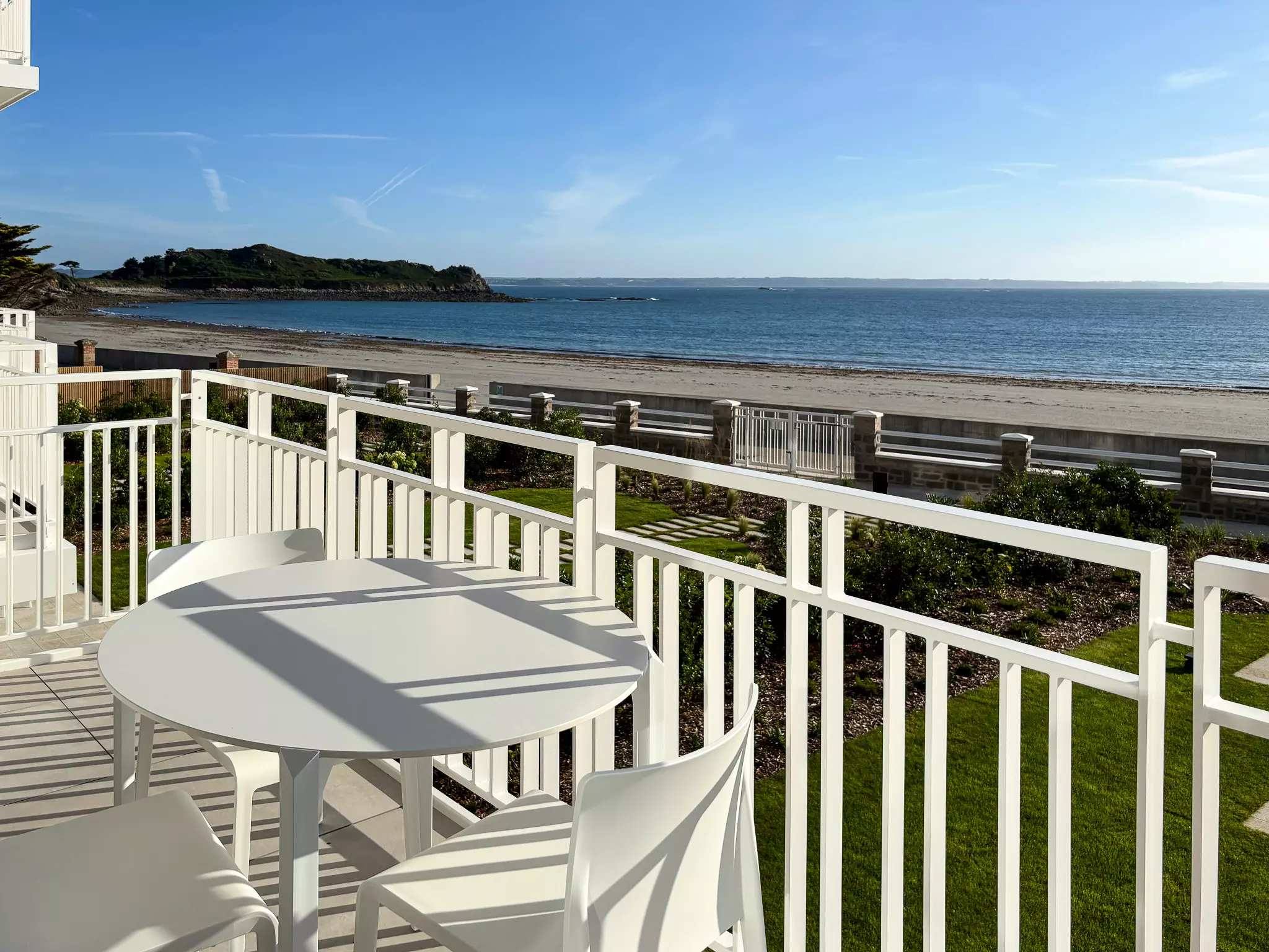 Grand Balcon face à la mer avec une table et 4 chaises.