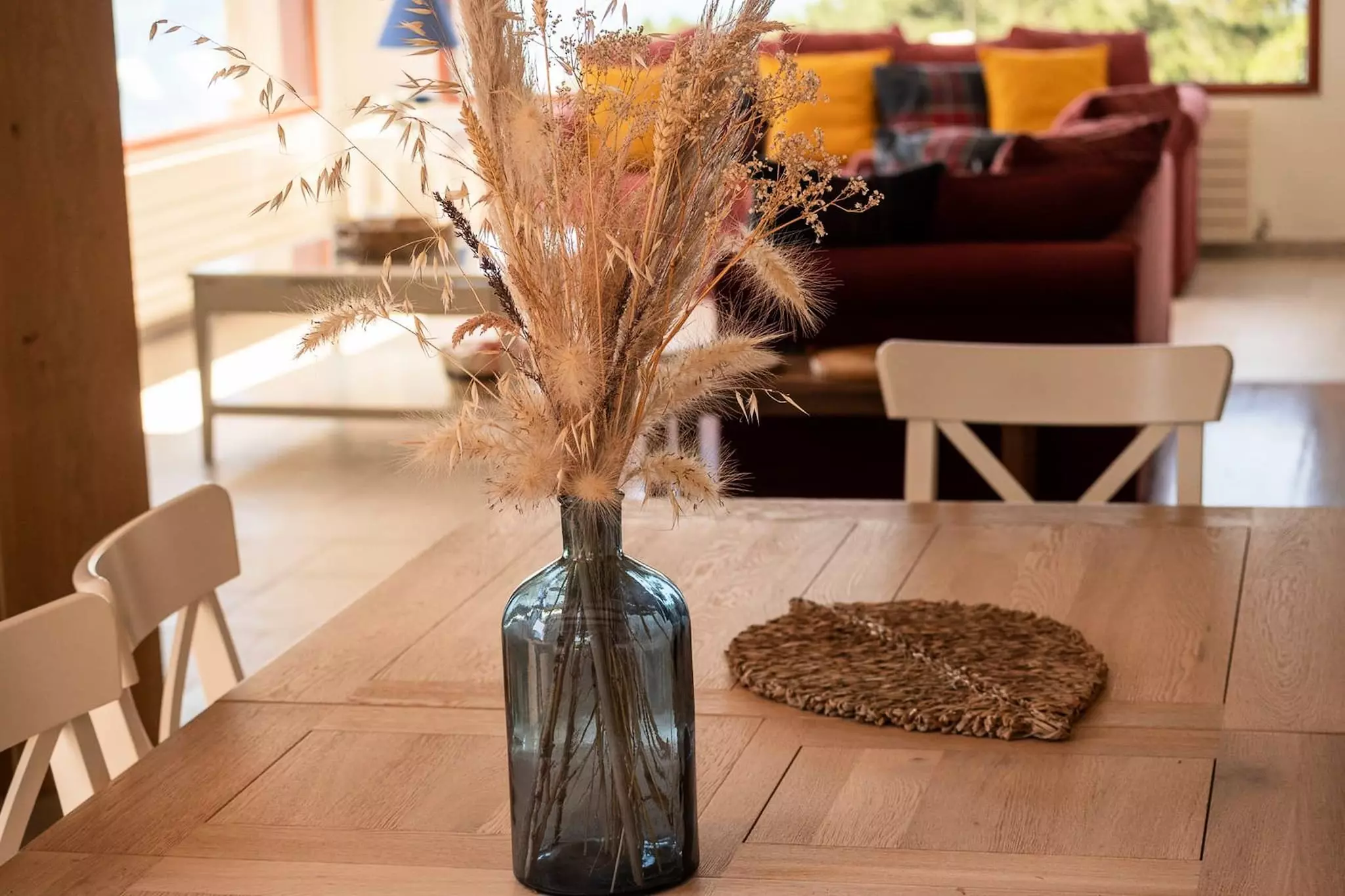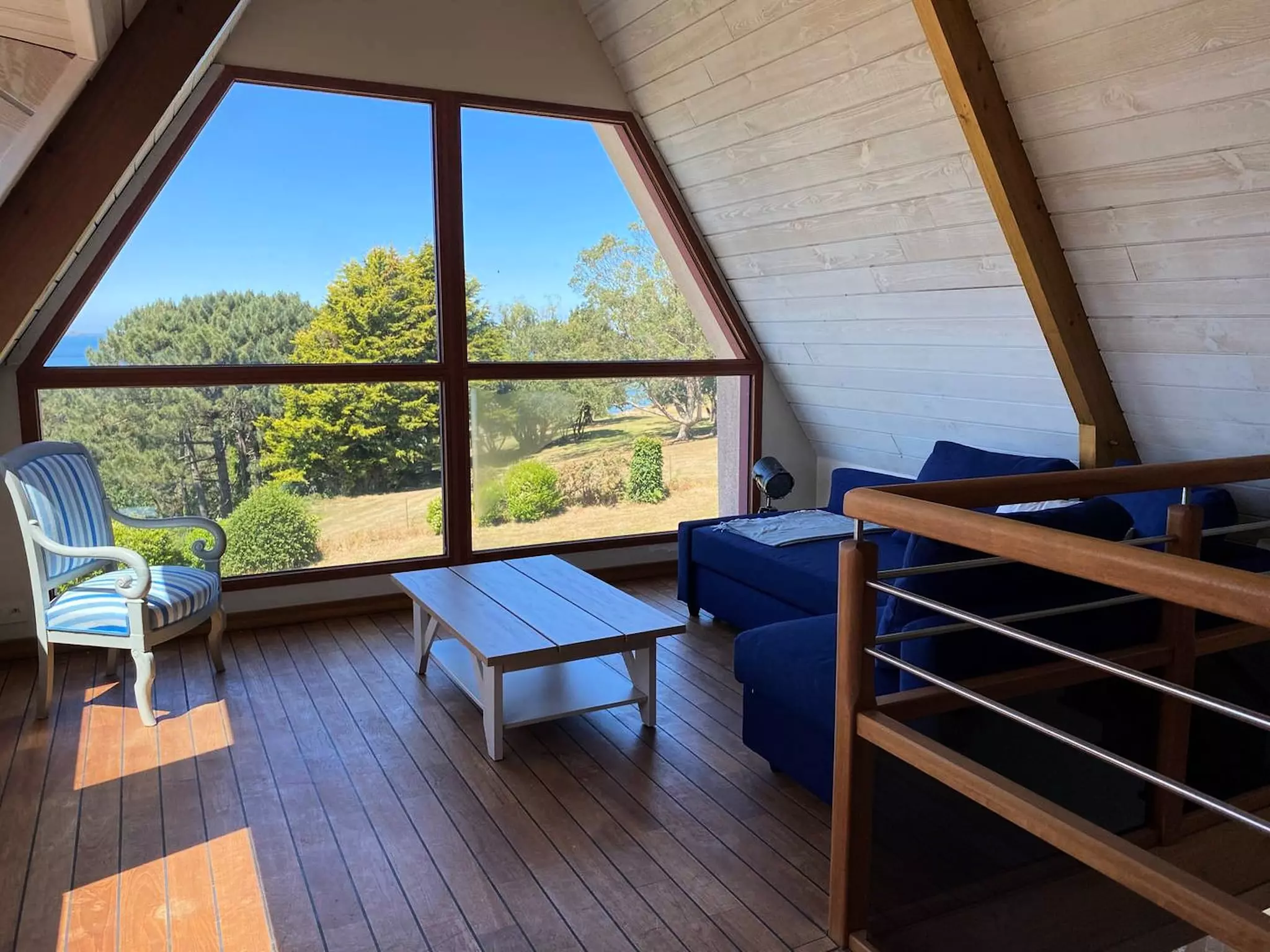 - Salon lumineux avec cheminée, donnant sur une grande terrasse en bois avec vue imprenable.