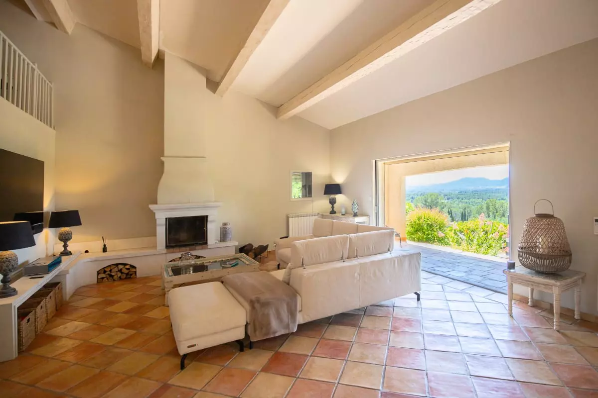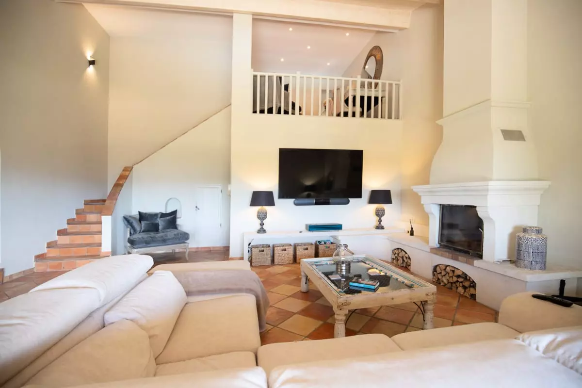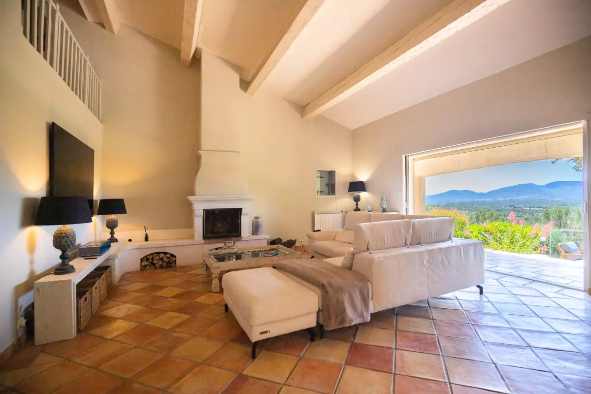 Un séjour lumineux tourné vers le massif de l’Estérel, avec grand canapé d’angle relax électrique, TV grand écran et système stéréo pour les soirées films ou musique.
