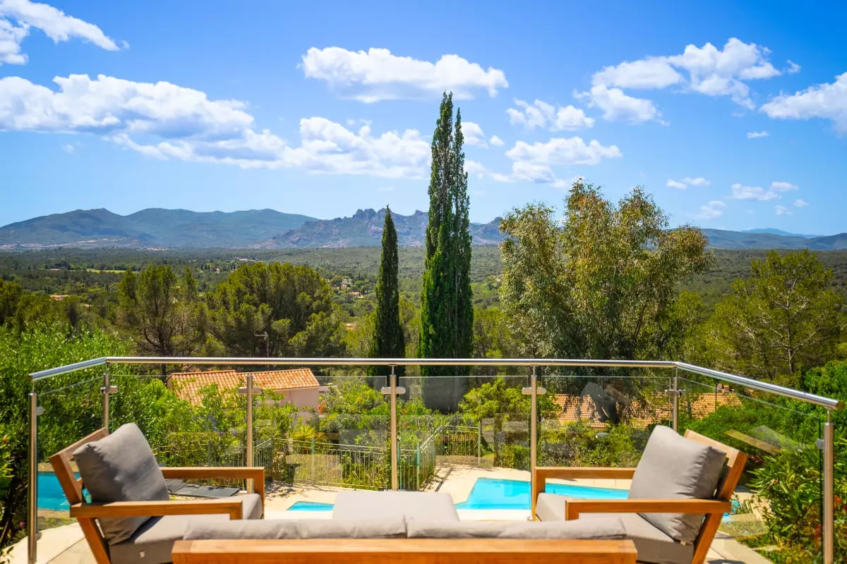 Jardin paysager entièrement privatif, avec vue dégagée sur le massif de l’Estérel.