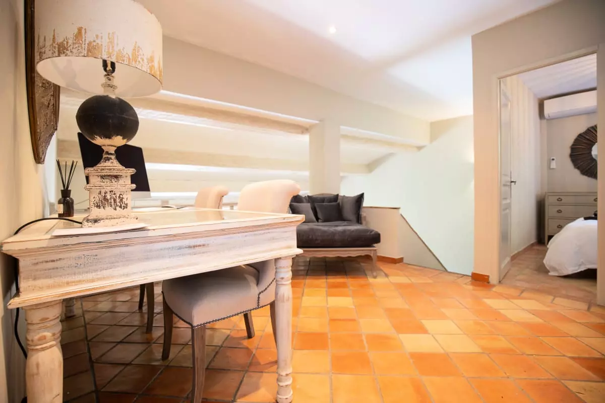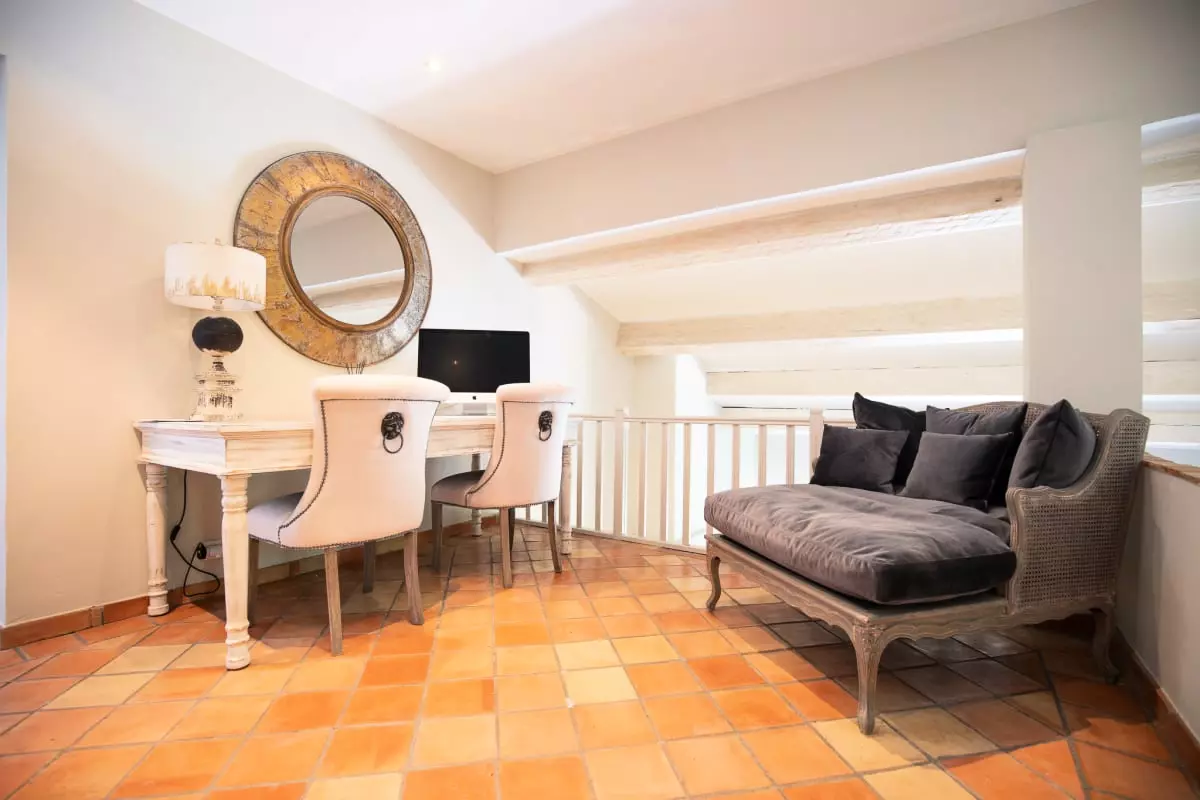 Un grand bureau indépendant avec ordinateur Apple et méridienne, parfait pour télé-travailler au frais ou s’isoler avec un bon livre.