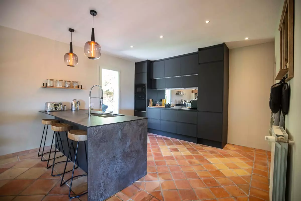 Une salle à manger conviviale et une cuisine moderne entièrement équipée (électroménager haut de gamme, grande plaque de cuisson, four, réfrigérateur-congélateur, cave à vin, vaisselle complète),