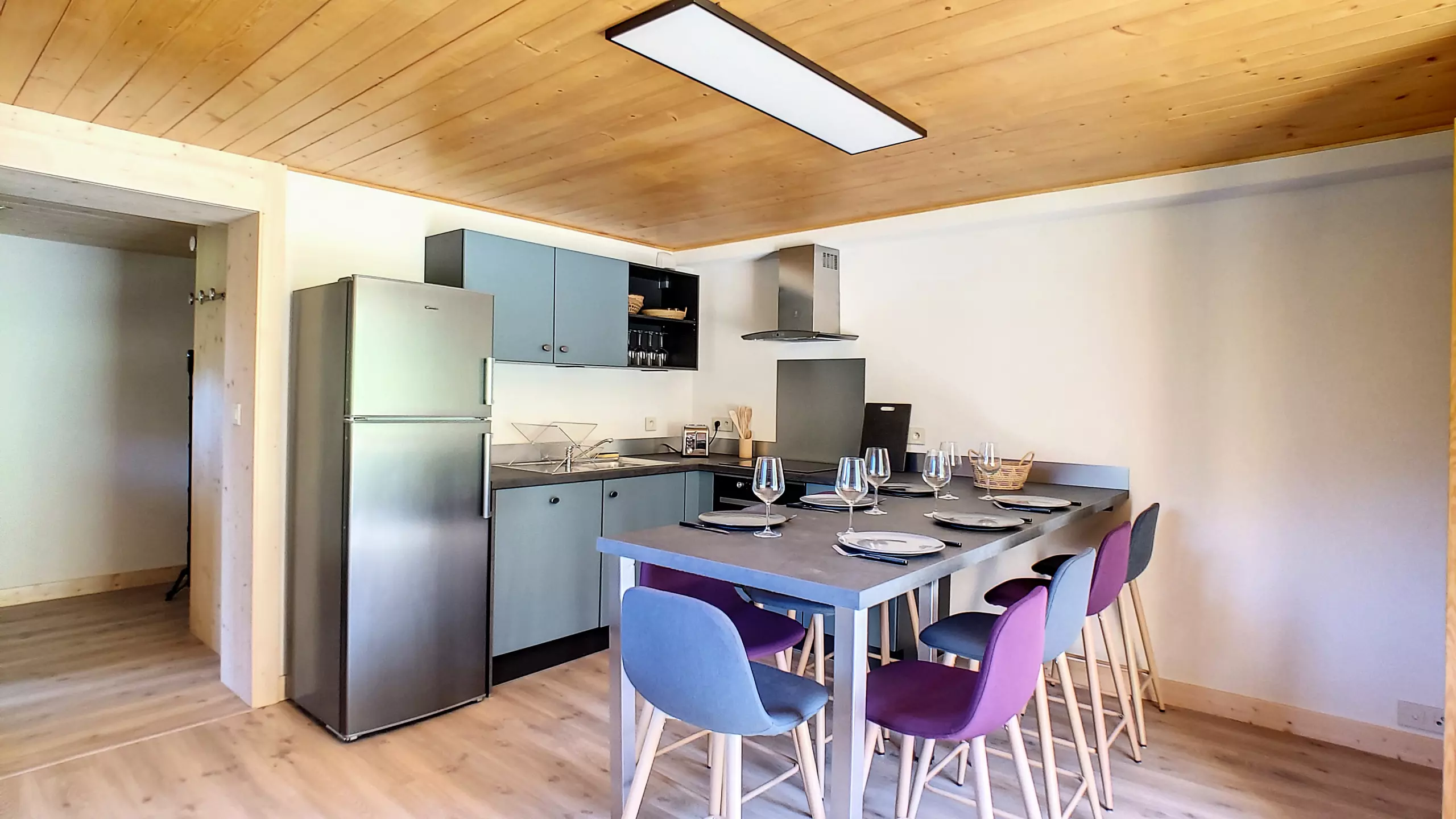 Une cuisine toute équipée ouverte sur la salle à manger avec four micro-ondes, frigo, congélateur, bouilloire, autocuiseur, plancha électrique, grille-pain, plaque à induction, cafetière électrique et nespresso