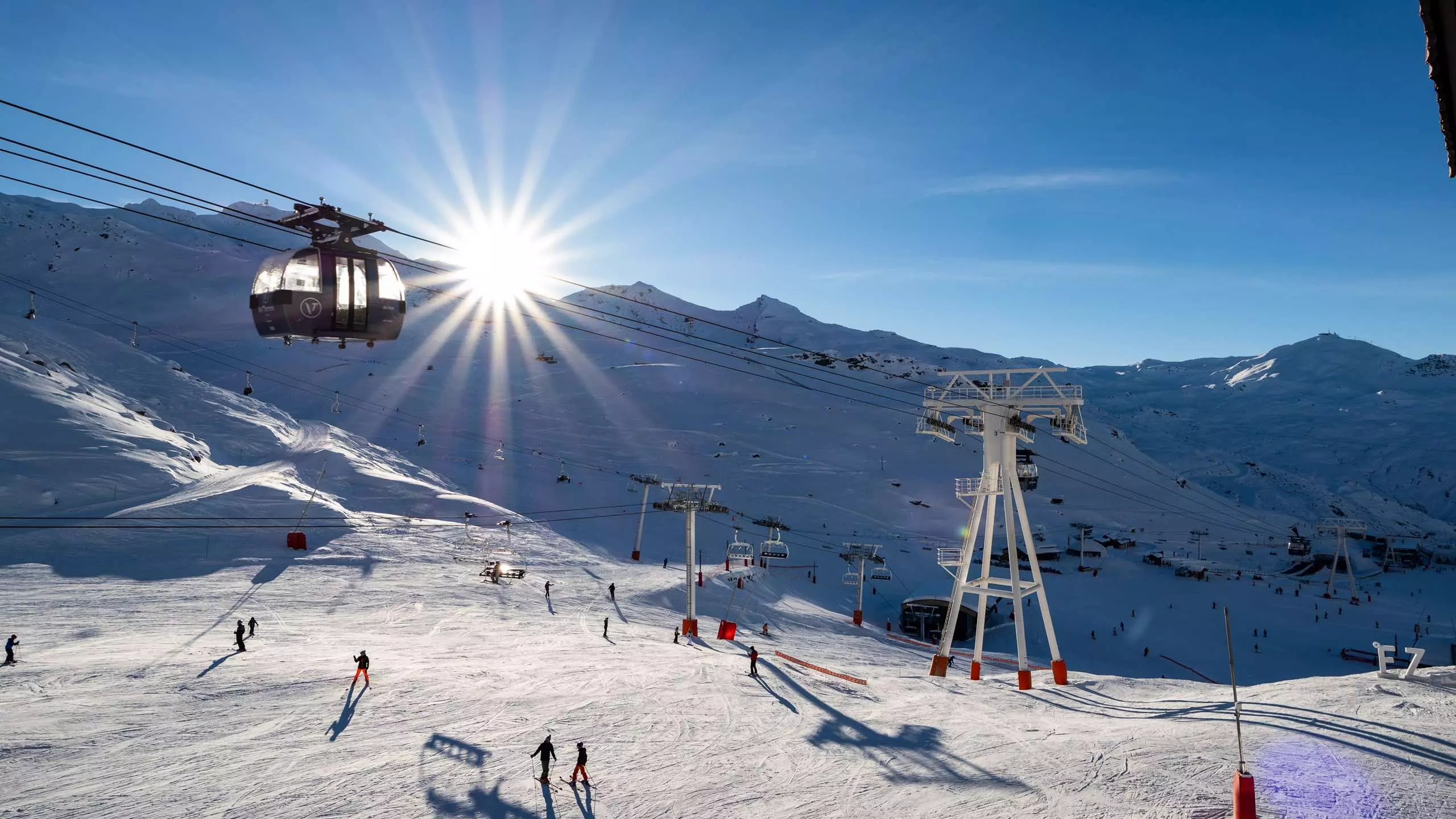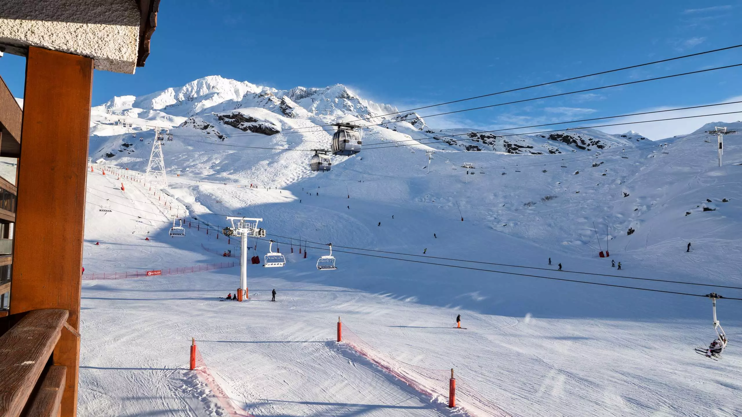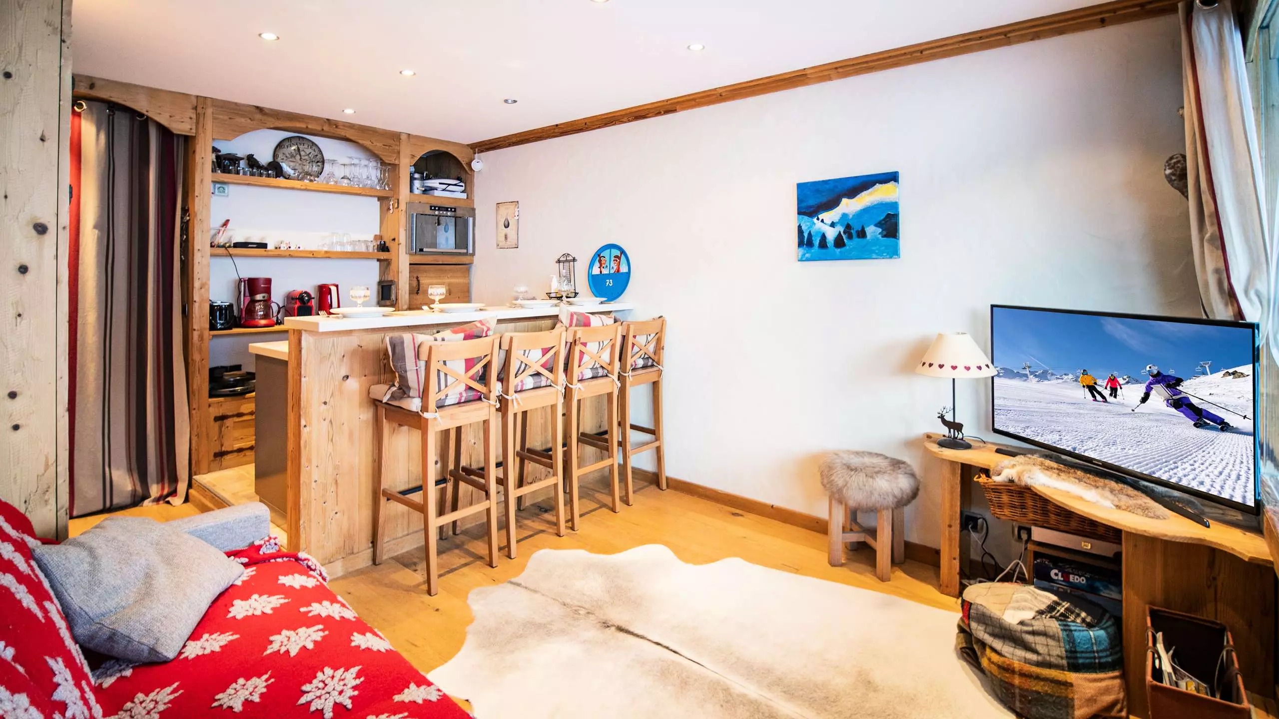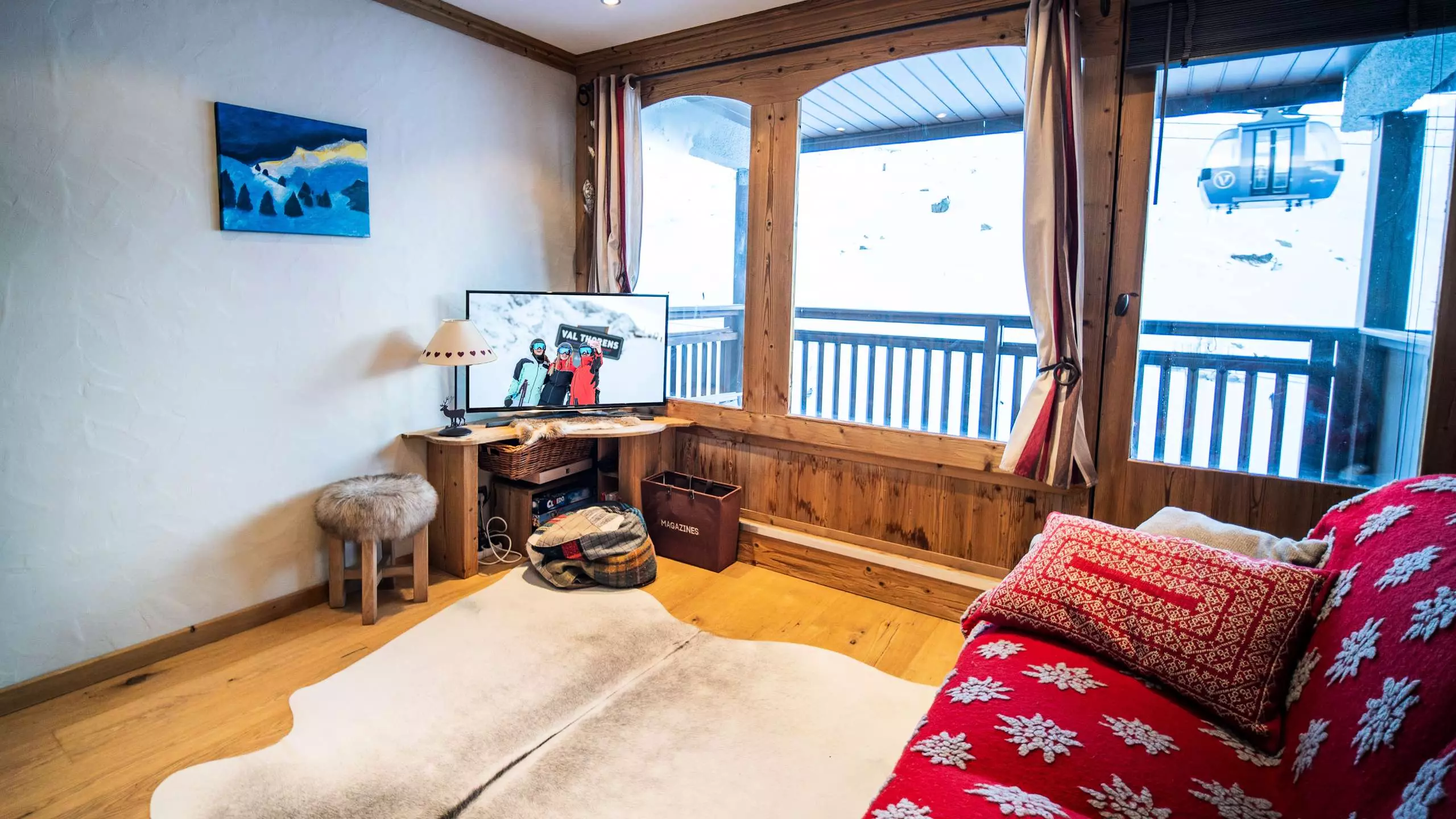 La pièce principale a une magnifique vue Sud donnant directement sur les pistes et les sommets enneigés de Val Thorens.