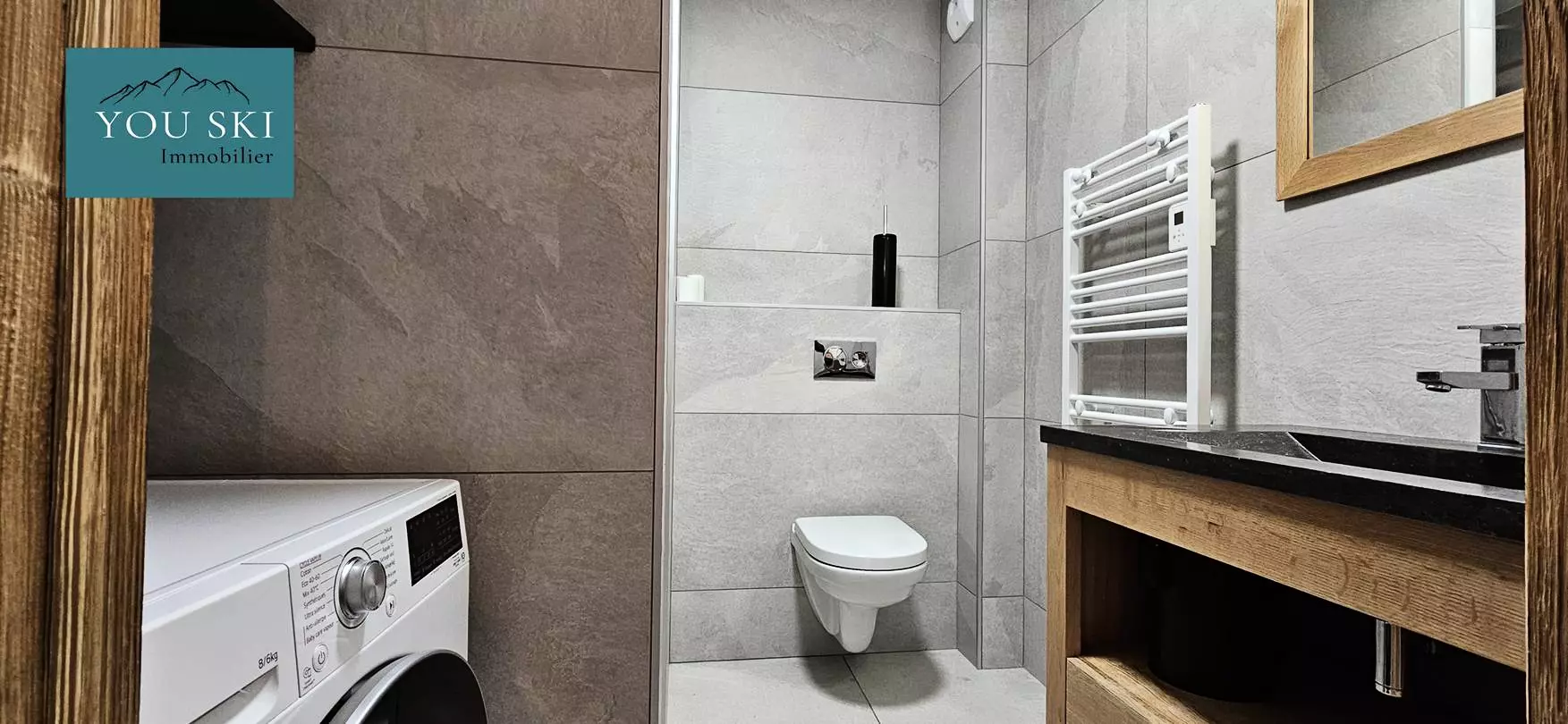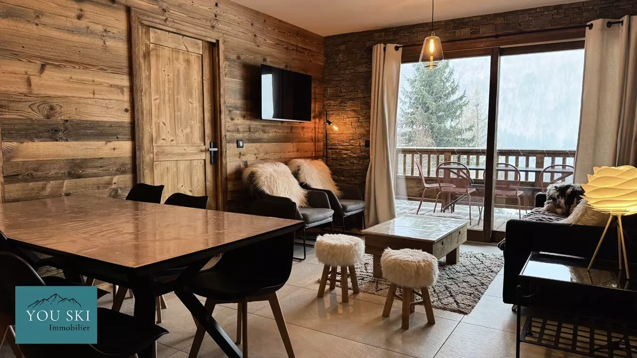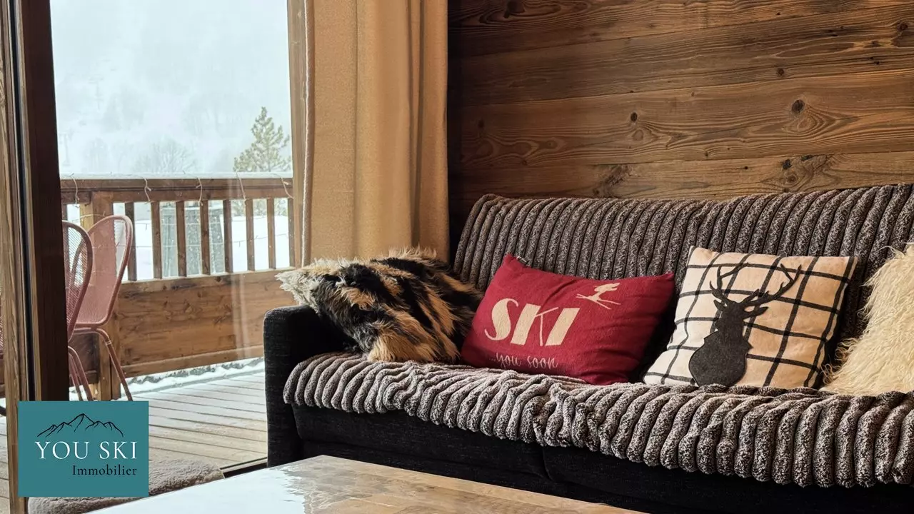 Imaginez-vous installé dans le coin salon, confortablement lové sur le canapé, admirant le soleil illuminer les sommets enneigés depuis le balcon exposé Sud ou depuis la terrasse privative de la chambre parentale. La pièce de vie lumineuse, ouverte sur le balcon, offre un espace convivial pour partager des repas, se détendre ou simplement contempler le panorama spectaculaire des montagnes.
