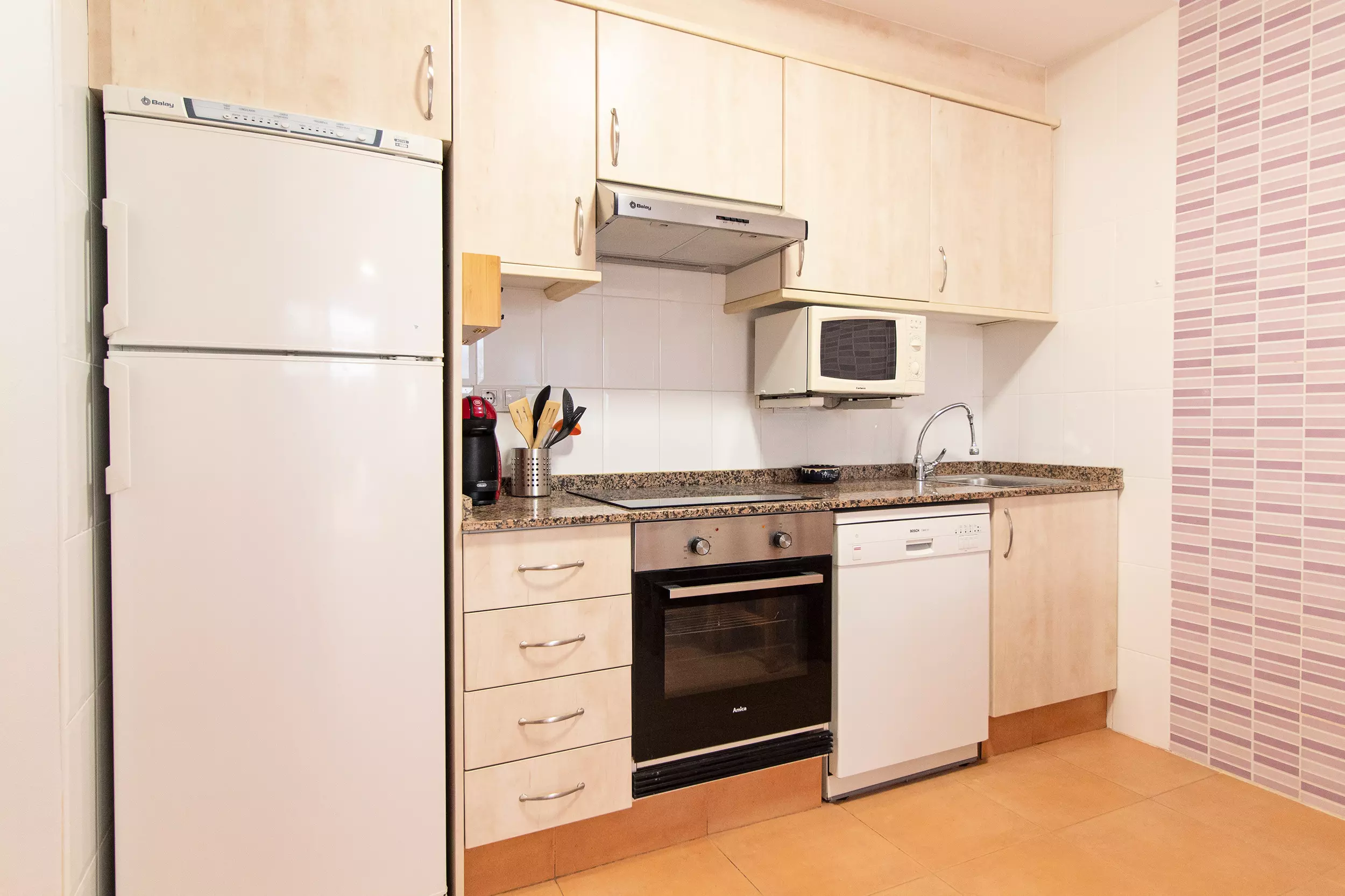 La cuisine américaine, à vitrocéramique, est équipée avec réfrigérateur, micro-ondes, four, congélateur, lave-vaisselle, vaisselle/couverts, ustensiles/cuisine et grille pain.