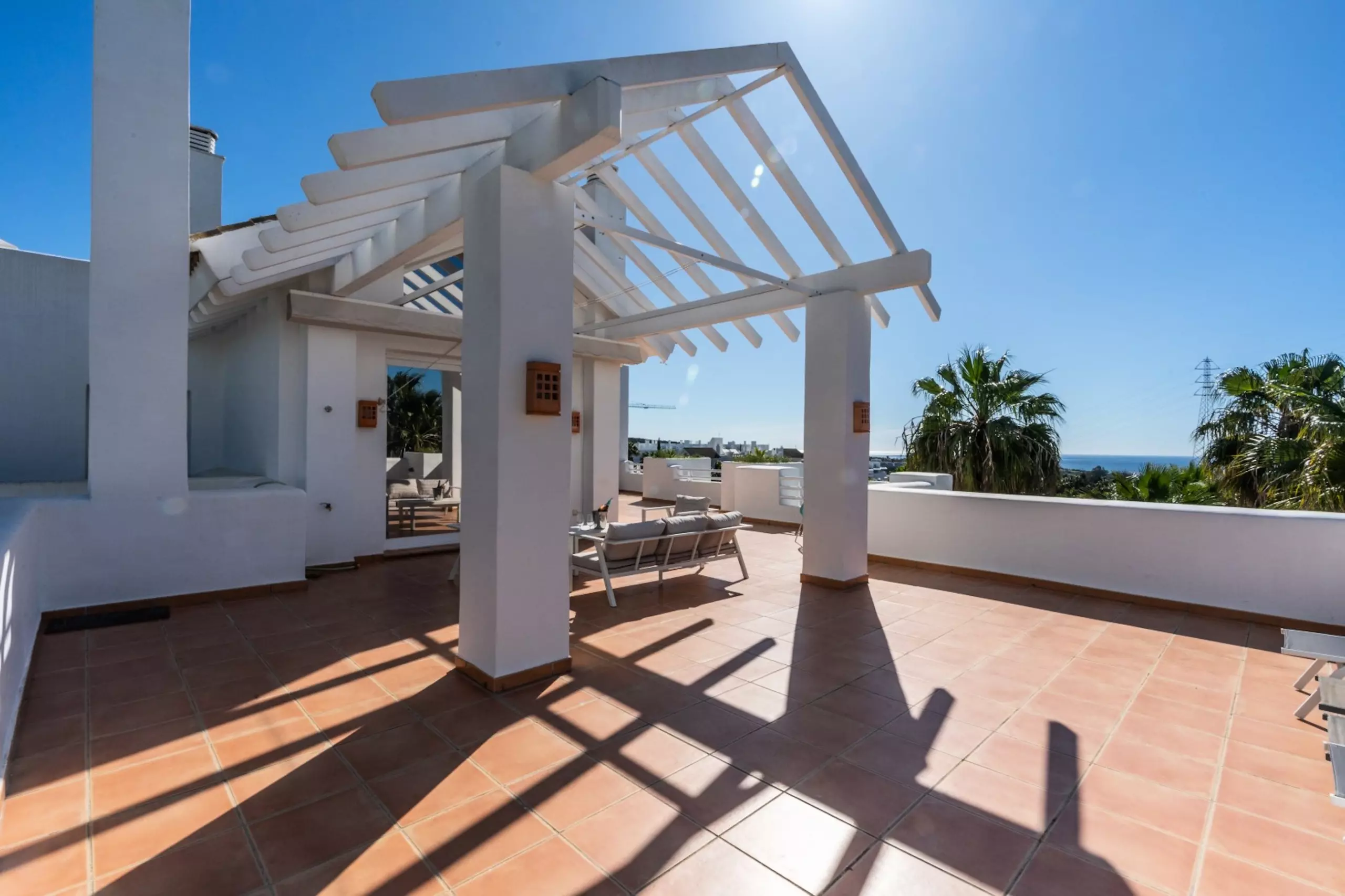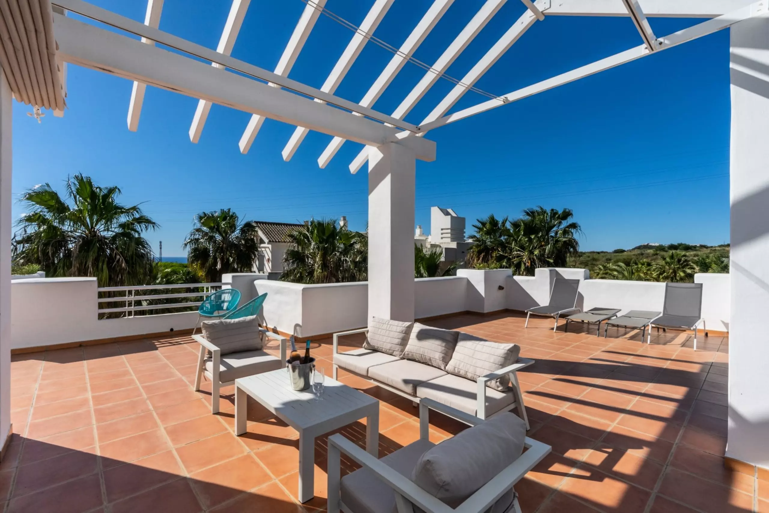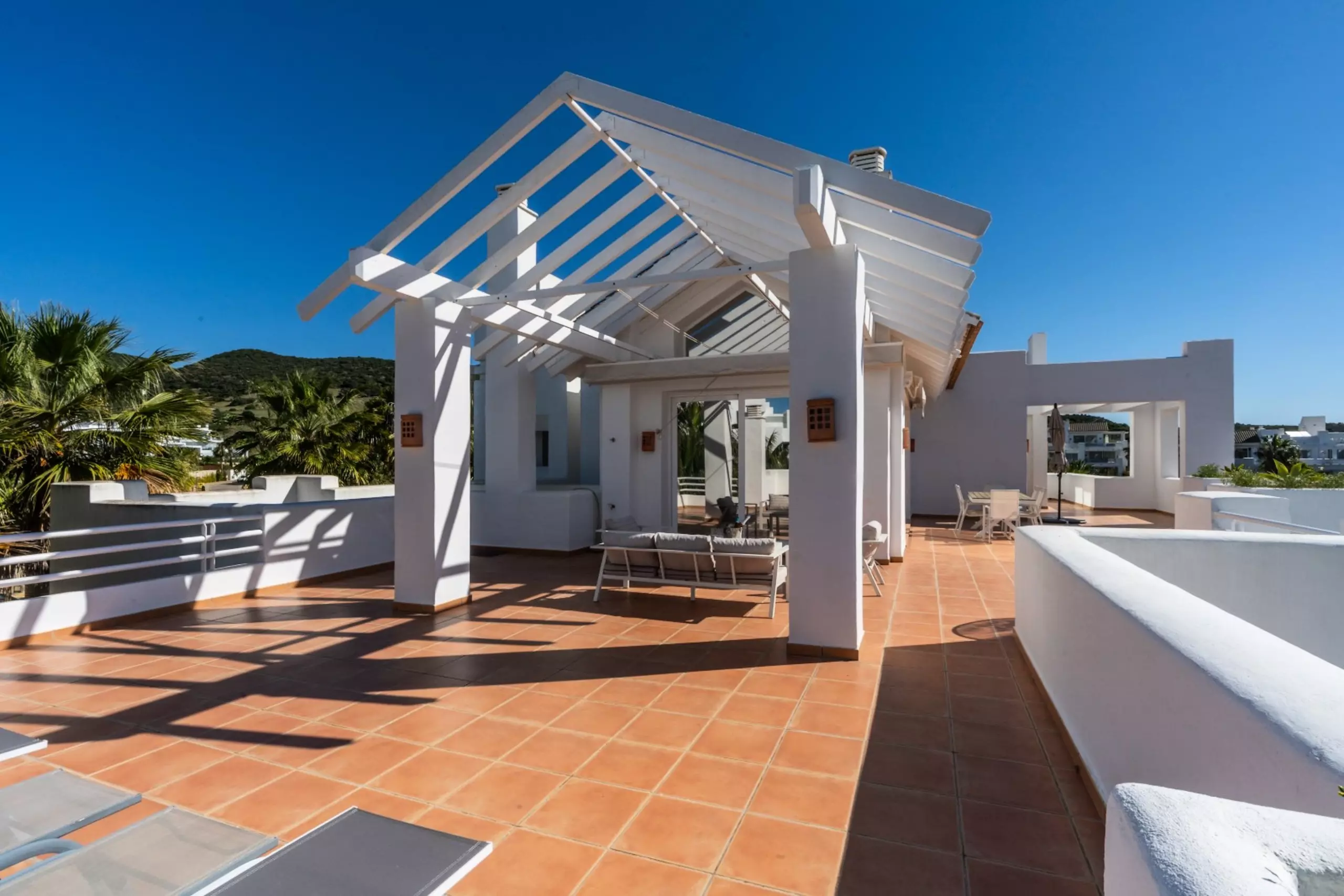•Terrasse gigantesque avec salon, salle à manger et chaises longues