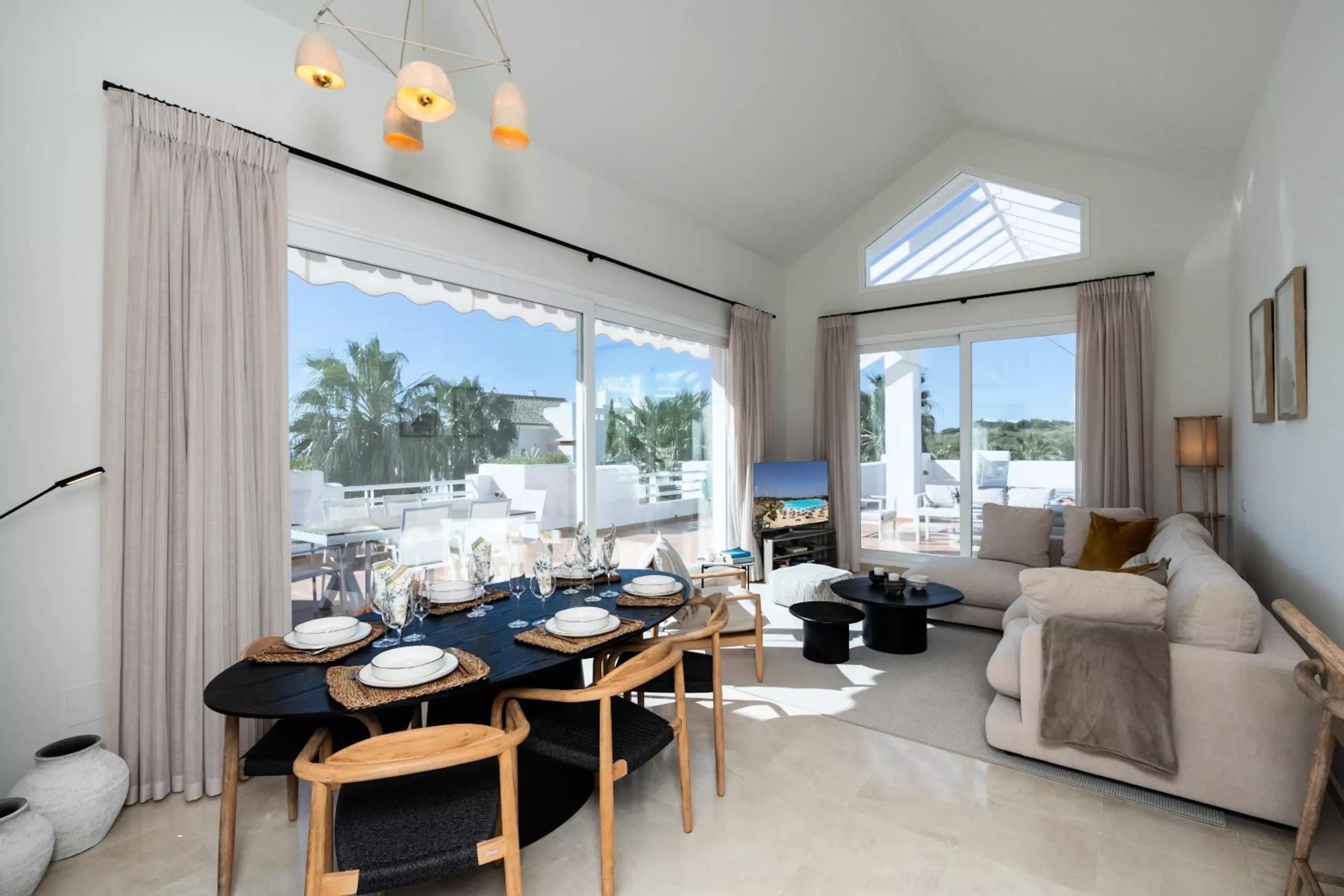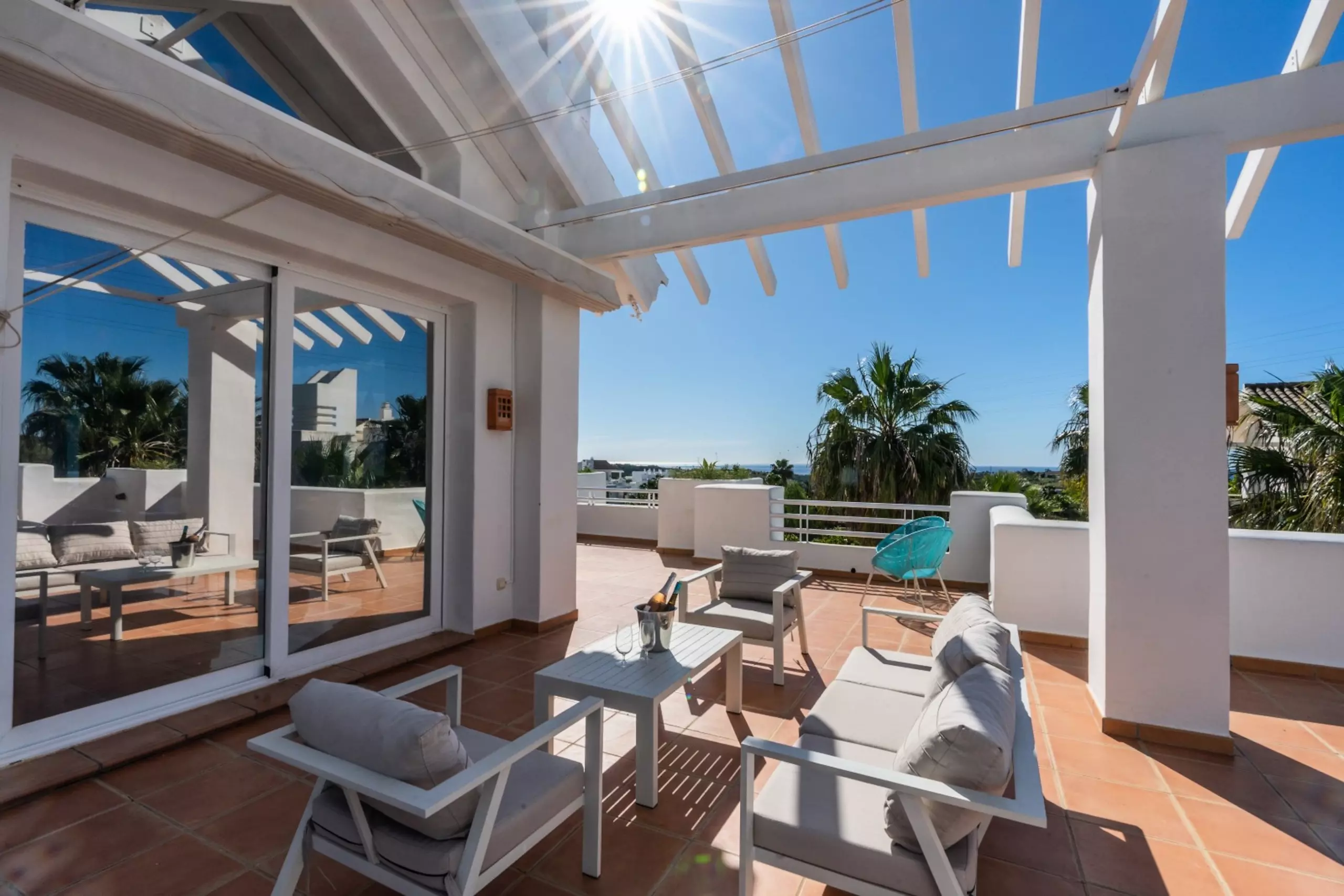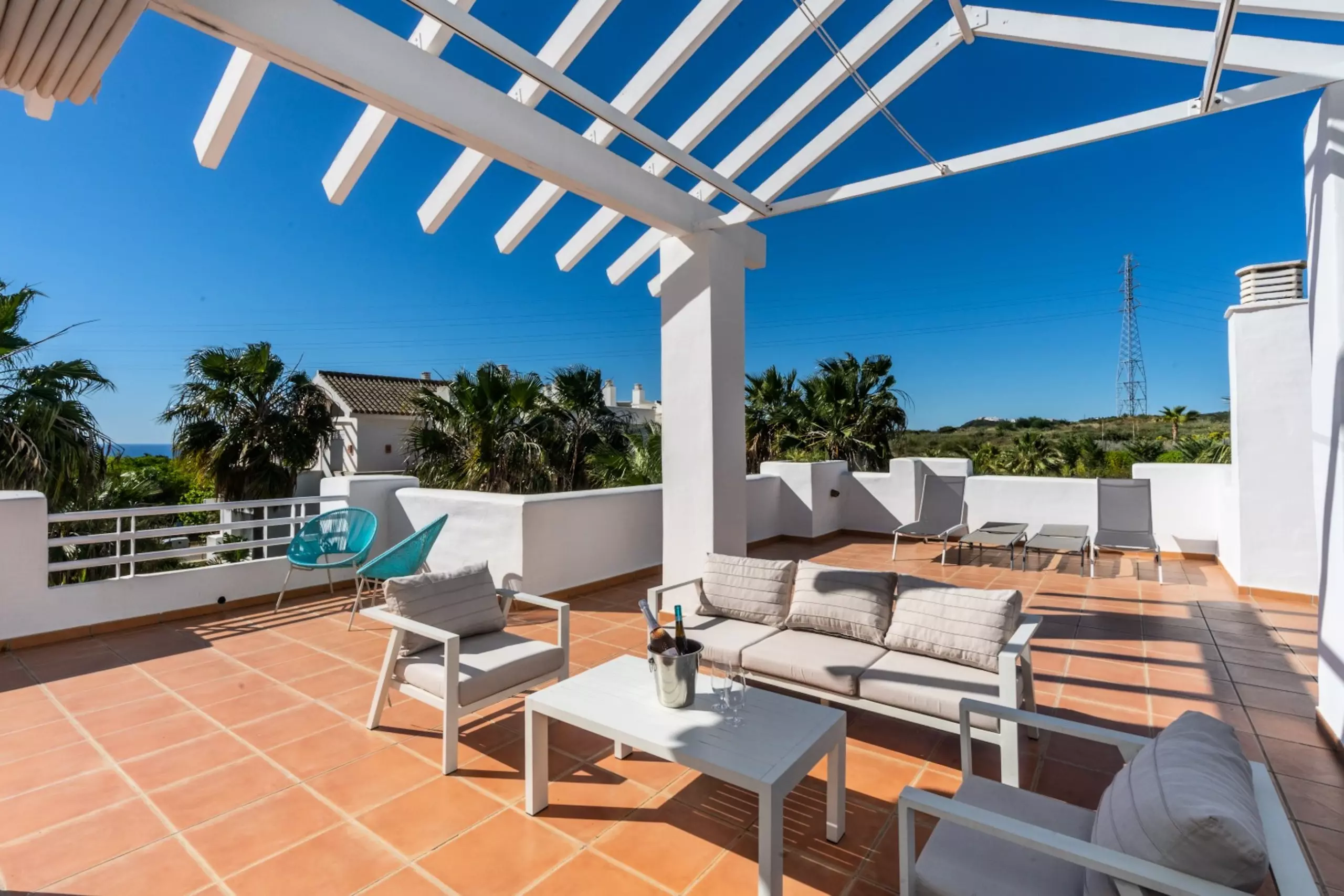 •Terrasse gigantesque avec salon, salle à manger et chaises longues
