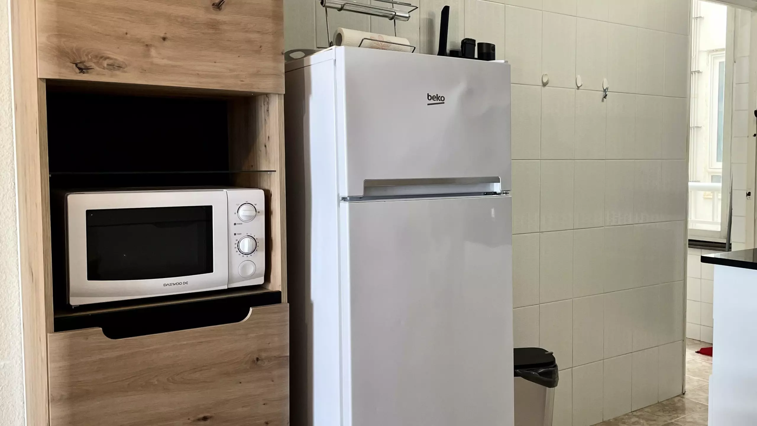 La cuisine américaine au gaz est équipée des appareils de base tels qu'un réfrigérateur, un micro-ondes, un four, un congélateur, une machine à laver, une cafetière et un grille-pain.