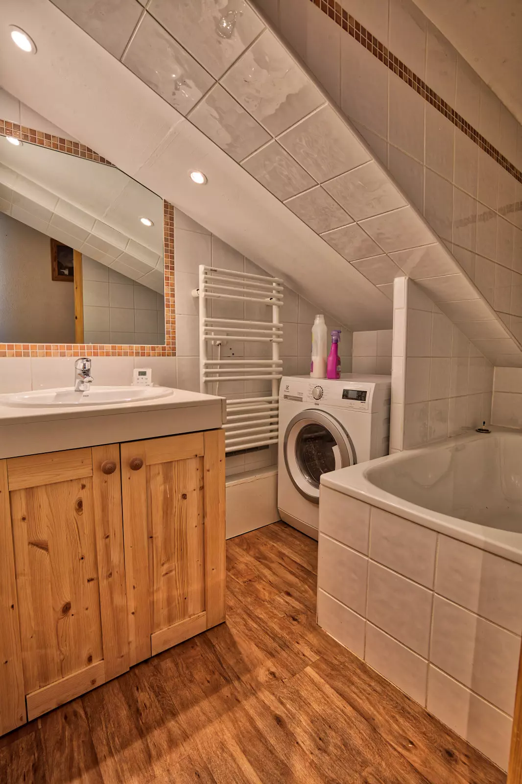 - Deux salles de bains : une avec douche et une avec baignoire et lave linge séchant.