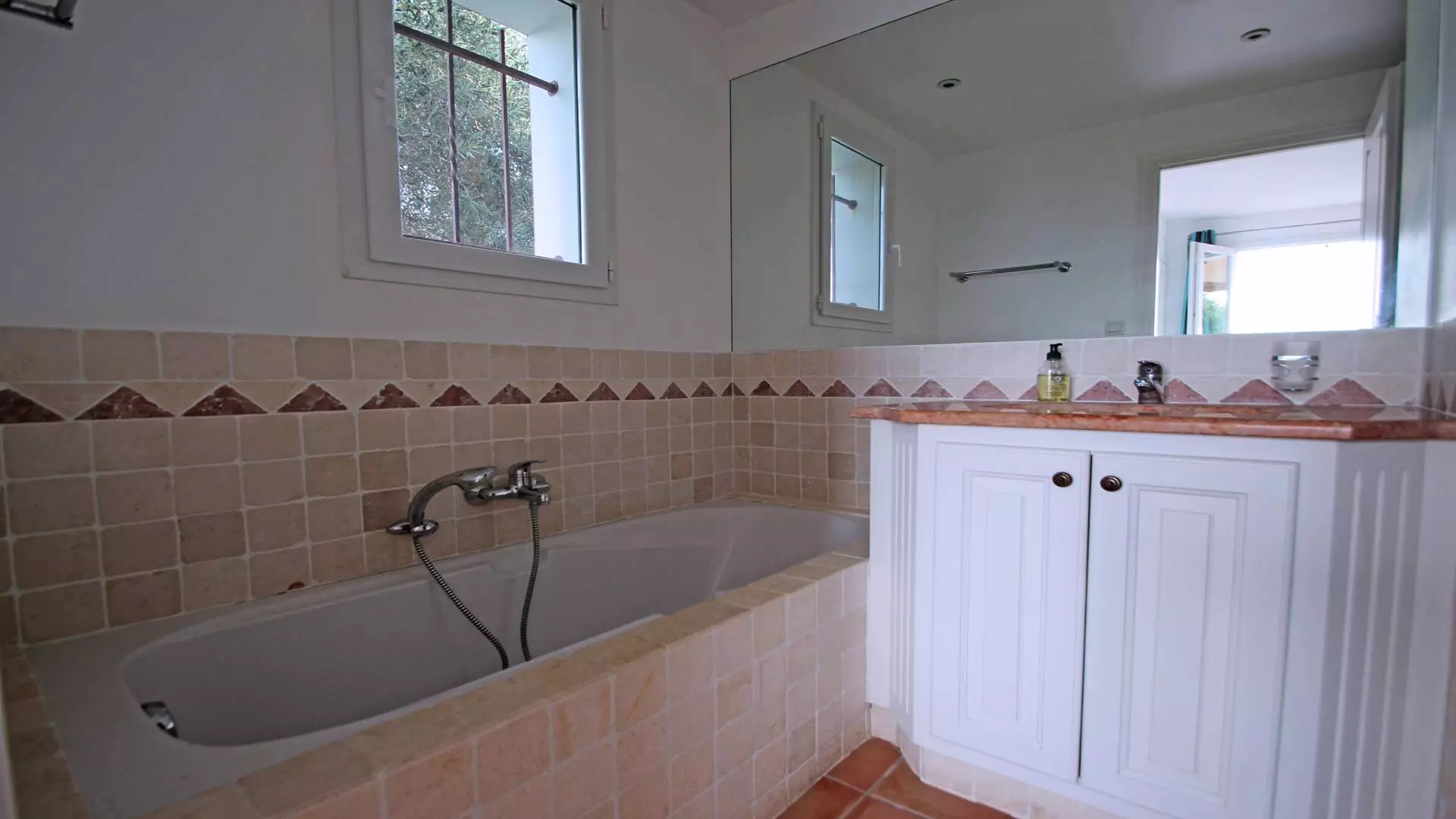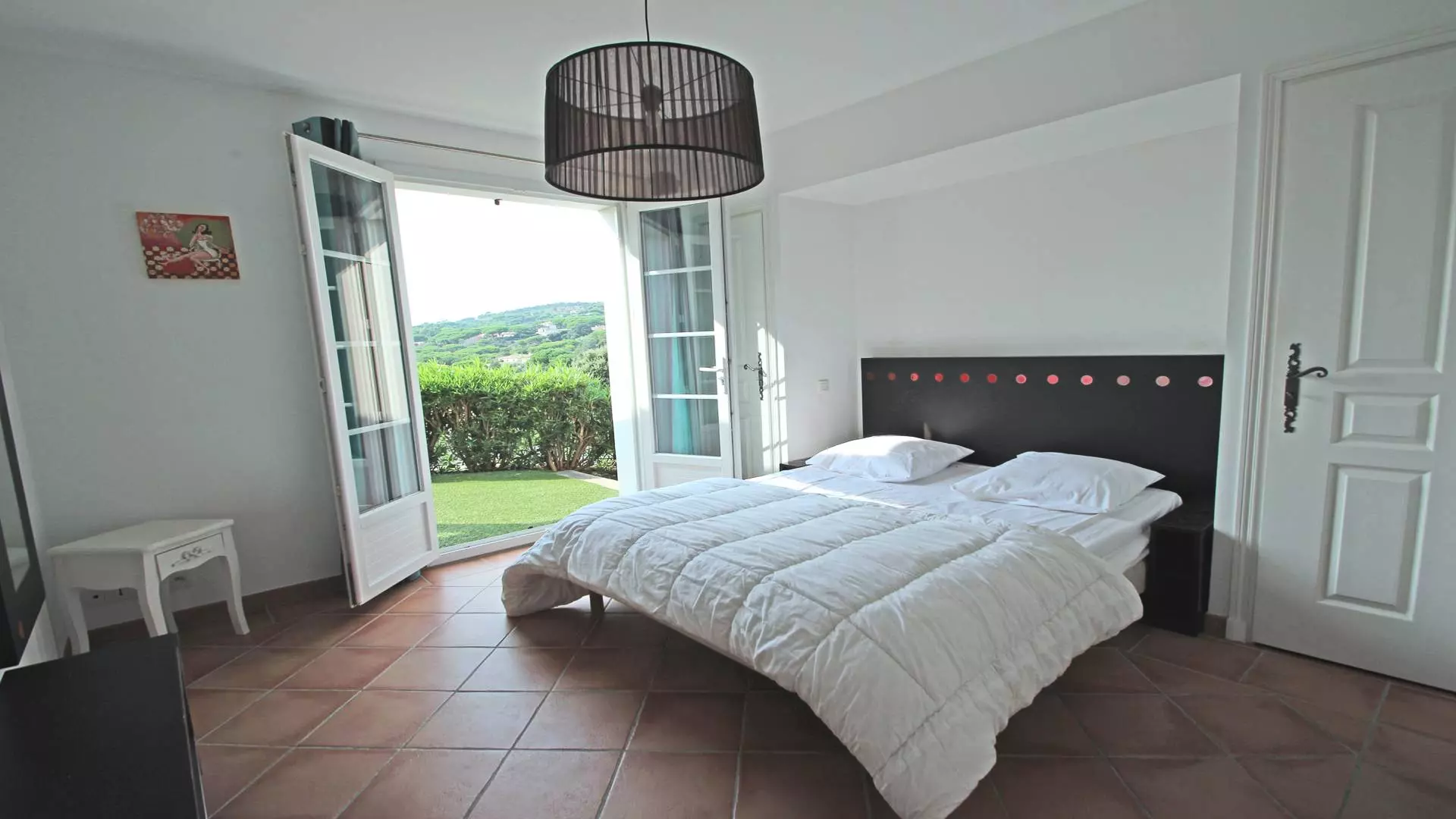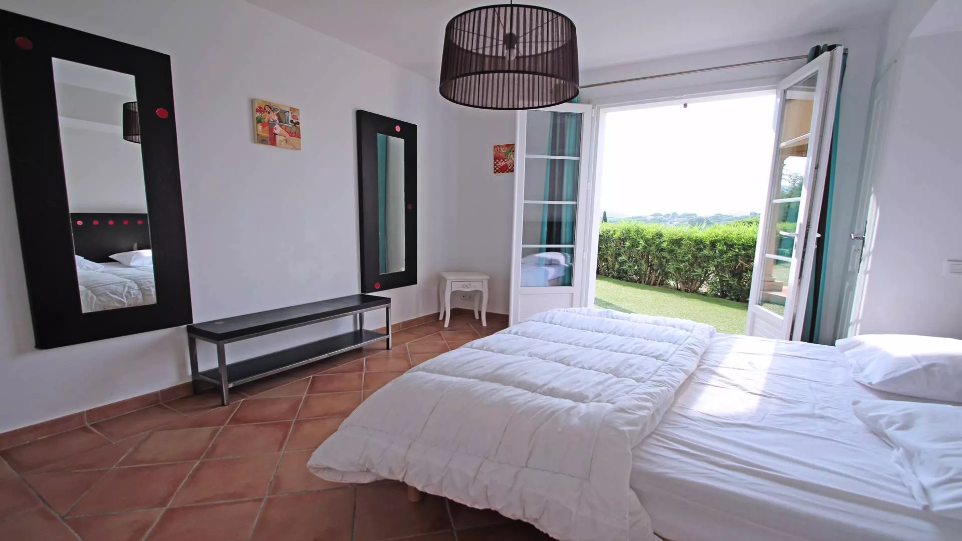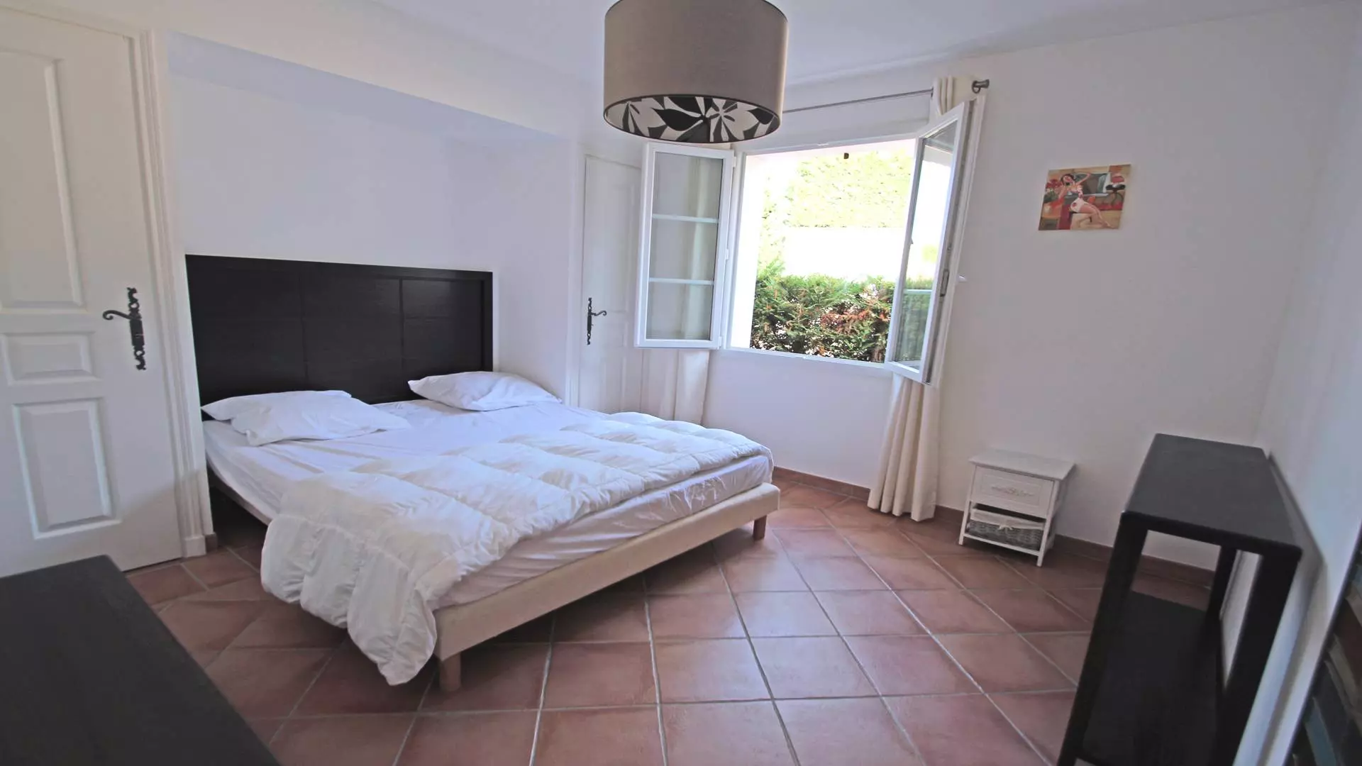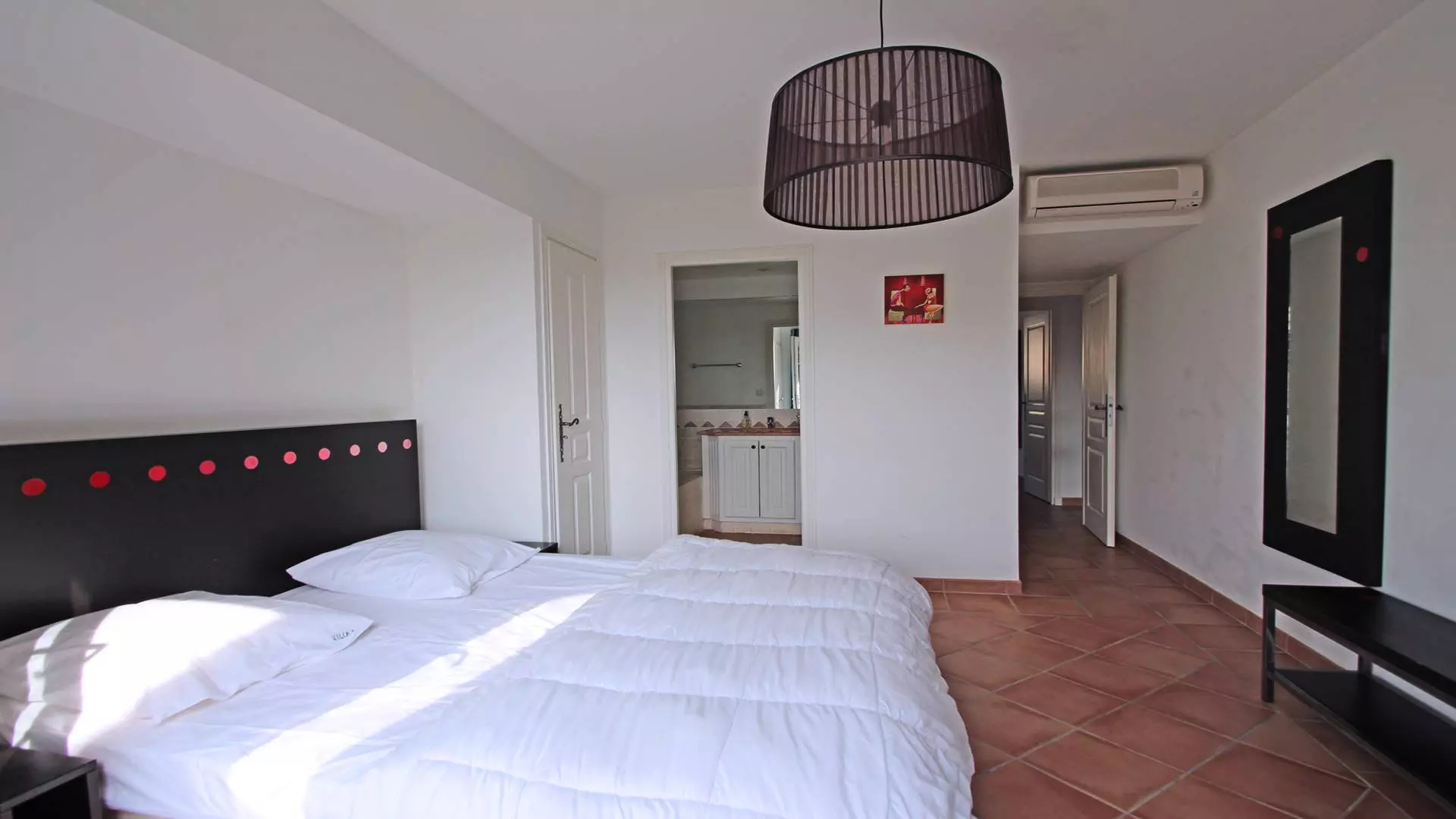 - Suite parentale climatisée (160cm) avec salle de bains (baignoire + douche) et WC, placard - Accès terrasse et piscine