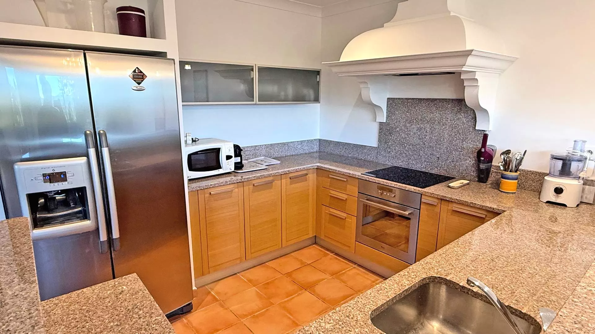 - Cuisine américaine entièrement équipée avec évier, plaque de cuisson vitrocéramique 4 feux, four, micro-onde, machine à café , Machine Nespresso, frigo américain, lave-vaisselle, vaisselles diverses, etc.