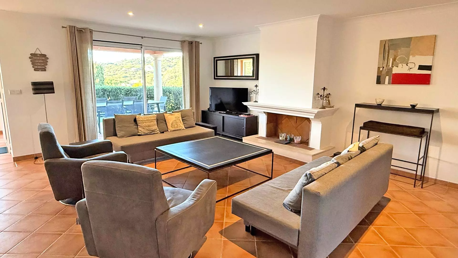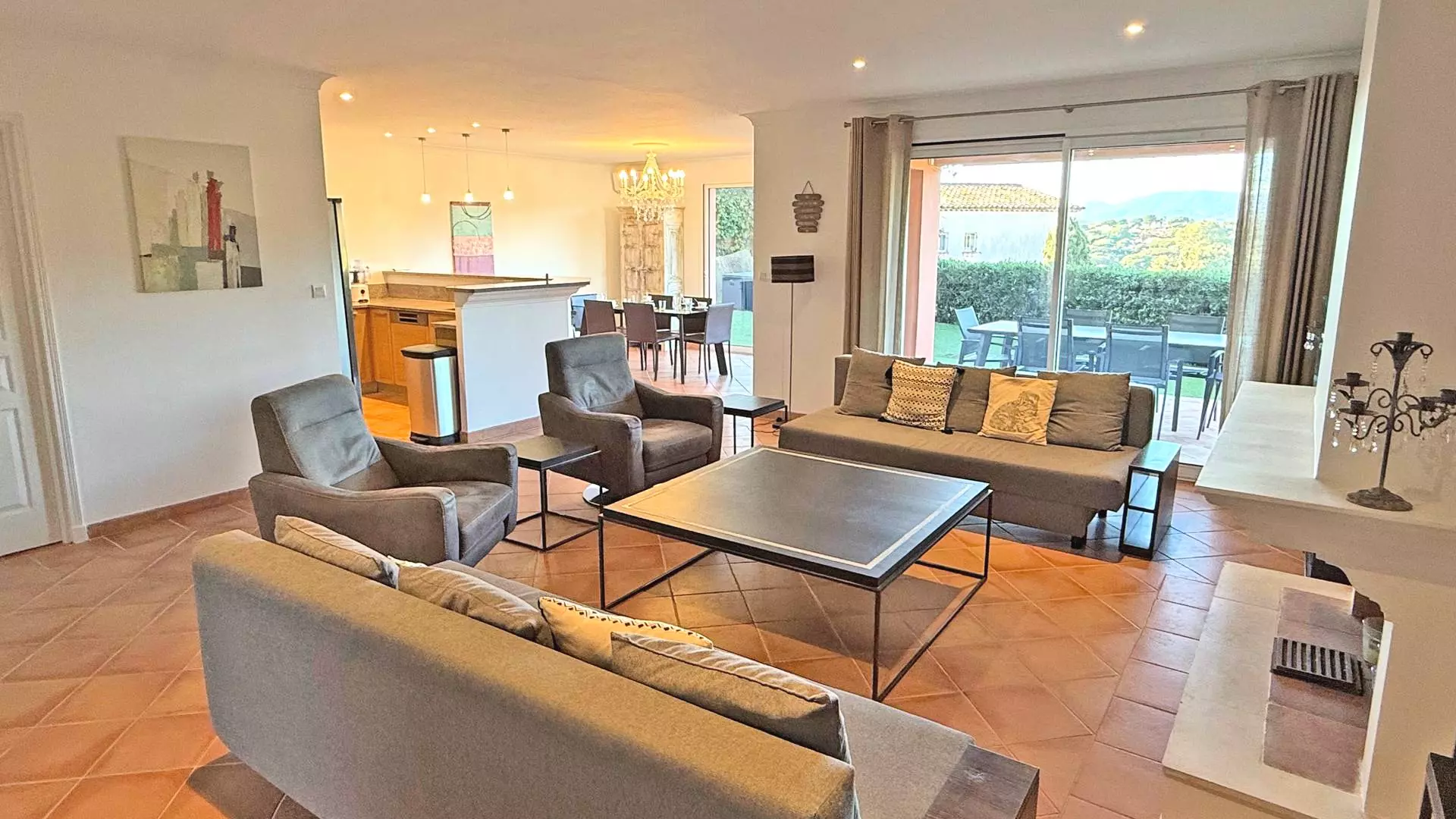 - Salon / Salle à manger climatisés avec canapés dont 1 banquette-lit (140cm), fauteuils, télévision écran plat, cheminée décorative, coin repas et accès direct à la terrasse