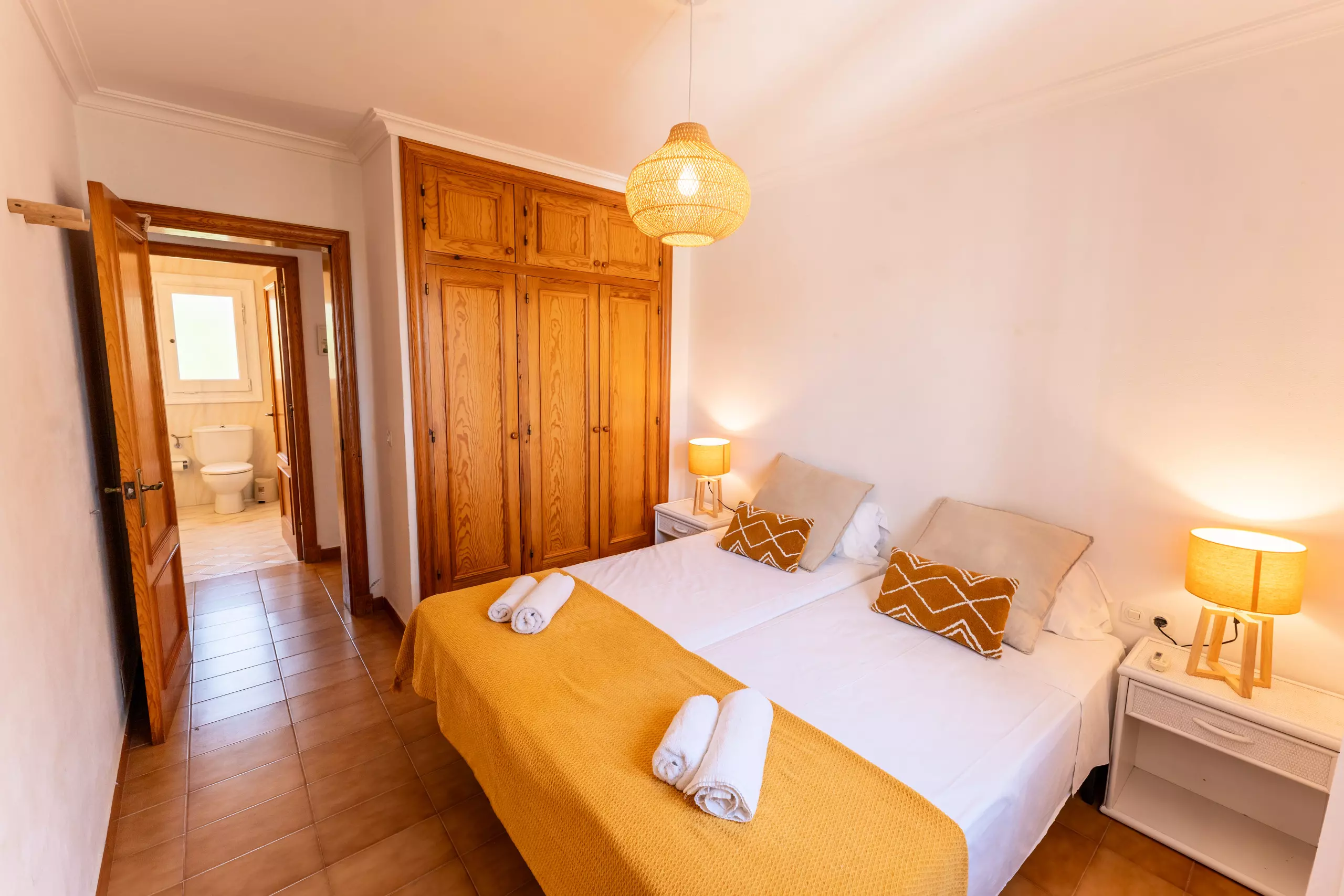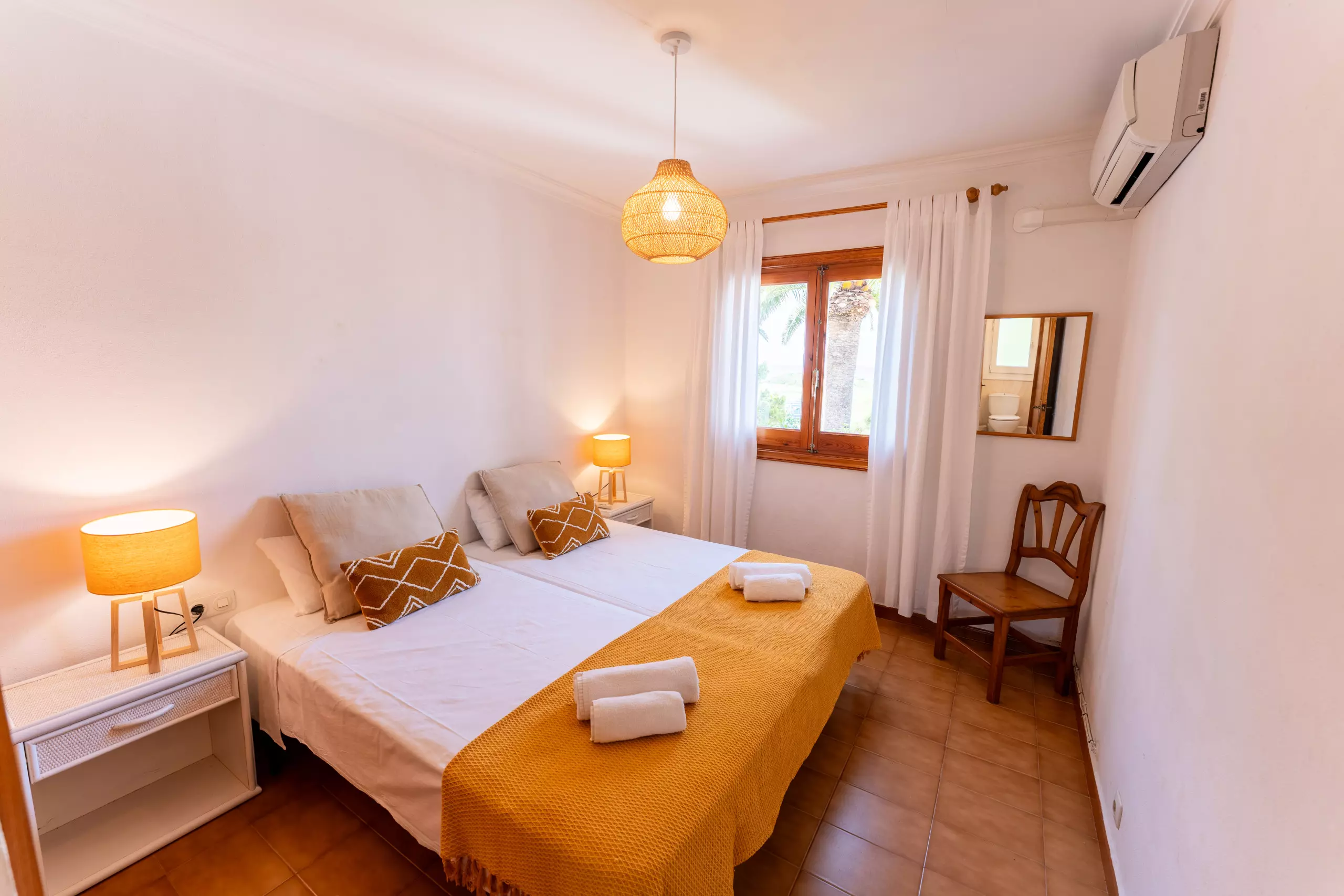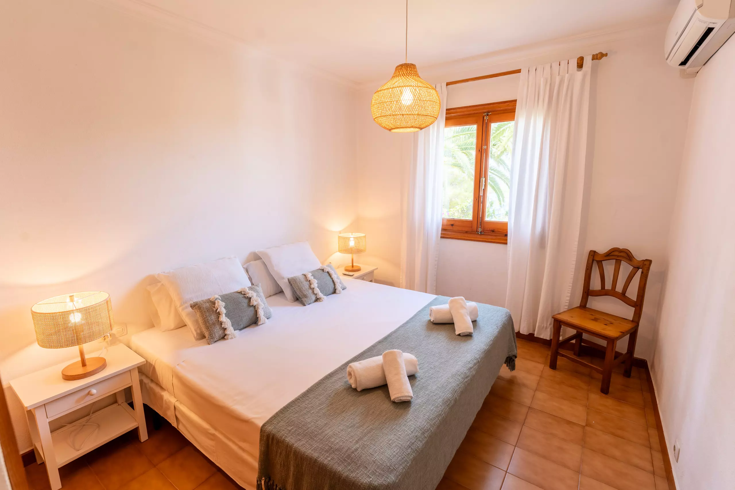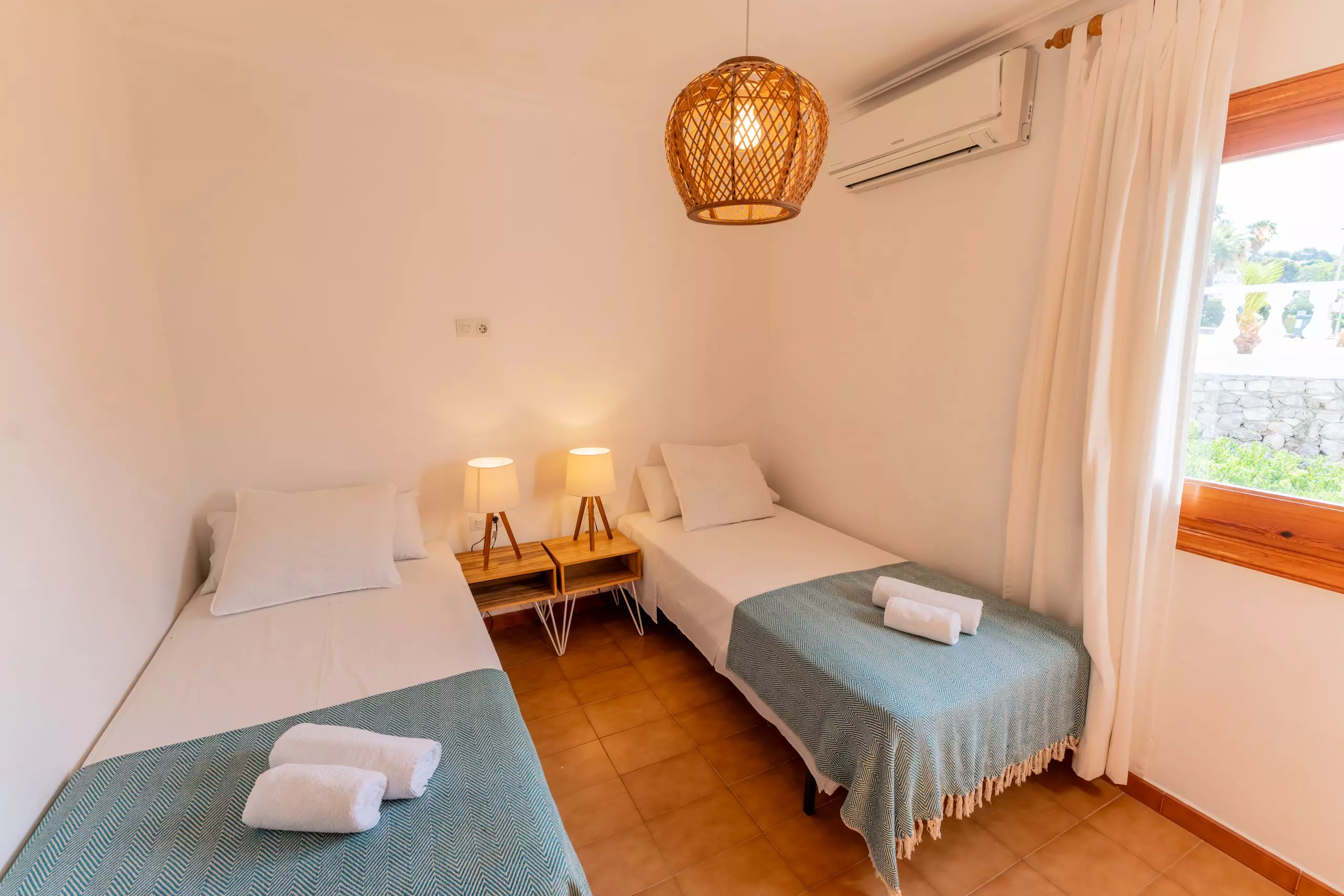 L'intérieur de la villa est entièrement climatisé avec la climatisation et offre 4 chambres avec 6 lits (2 doubles et 4 individuels), ce qui permet une distribution flexible pour différents types de groupes. Elle dispose de 3 salles de bains, 2 avec douche et 1 avec baignoire, facilitant la cohabitation des invités.