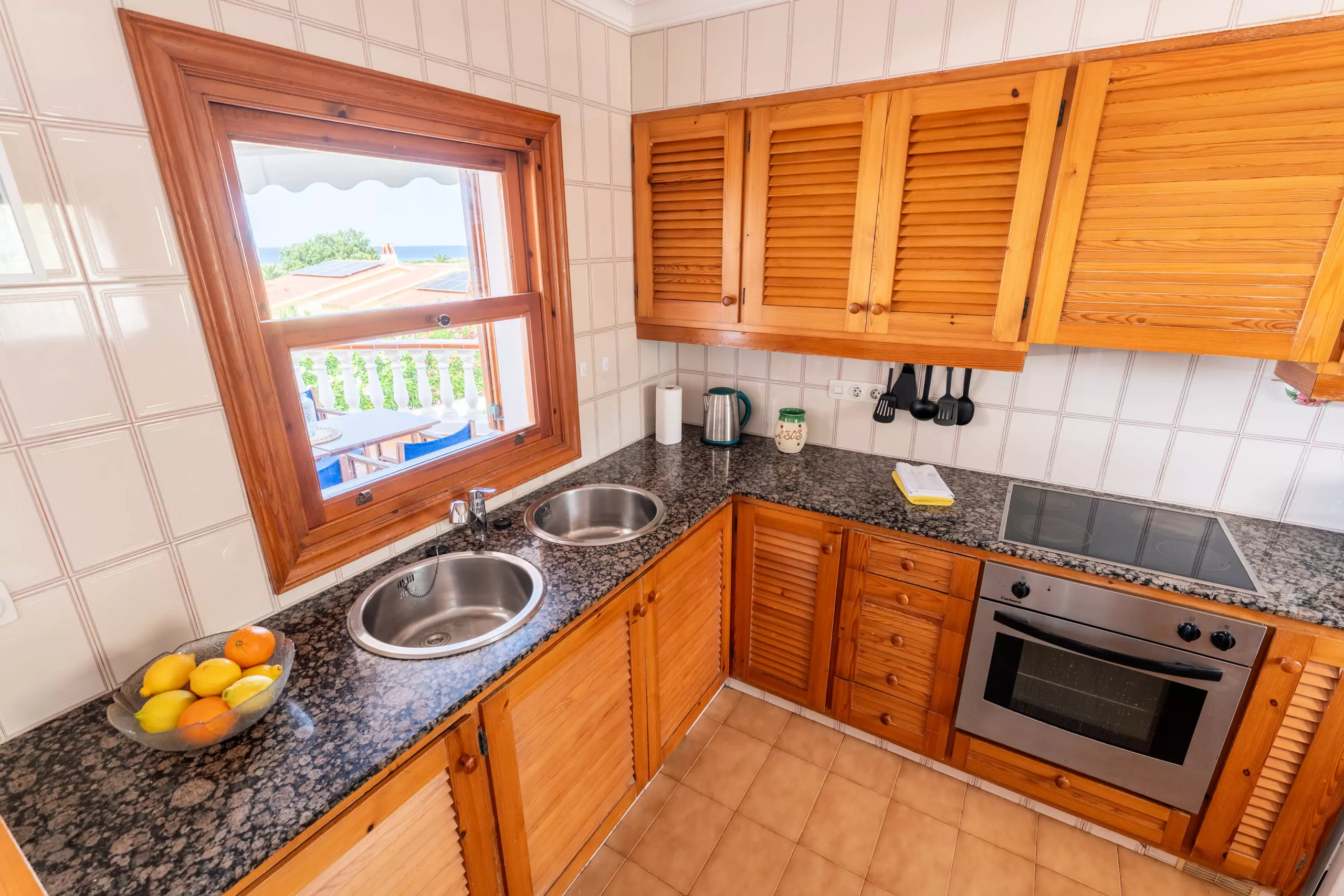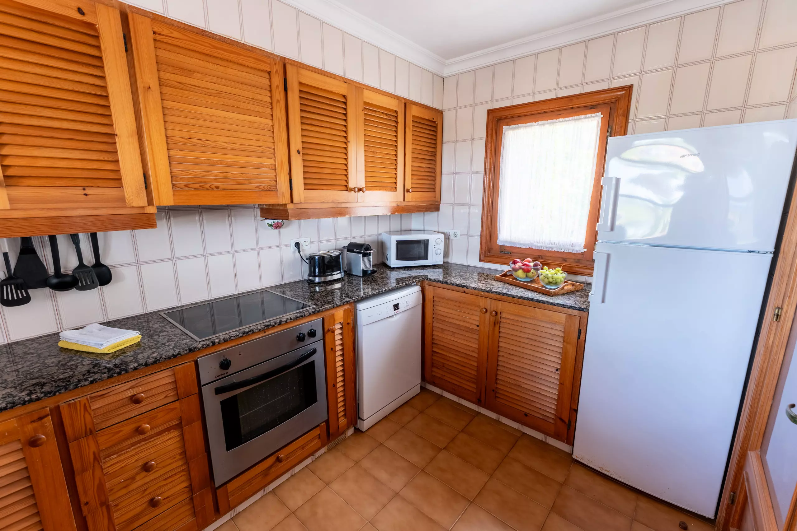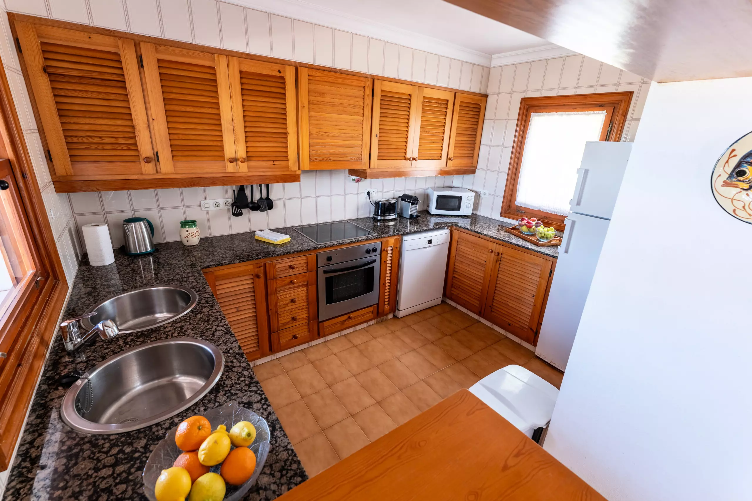La cuisine américaine est entièrement équipée d'appareils électroménagers modernes tels que lave-linge, lave-vaisselle, four, micro-ondes, cafetière, grille-pain et bouilloire. De plus, elle dispose d'une connexion WiFi et d'une télévision avec des chaînes en espagnol, anglais et allemand.