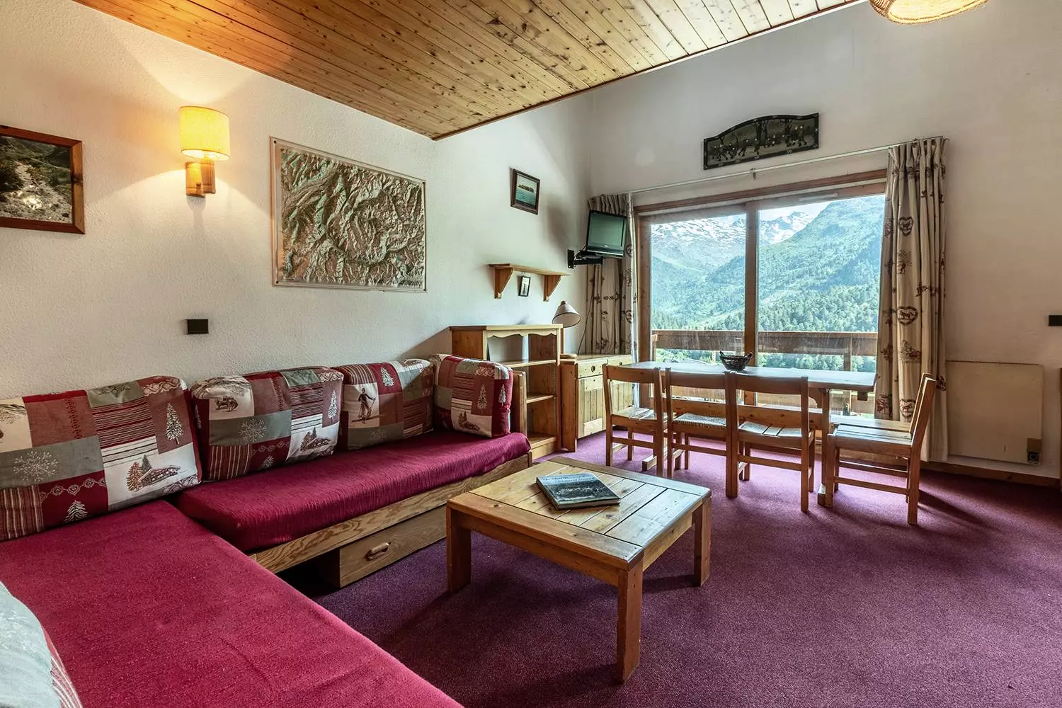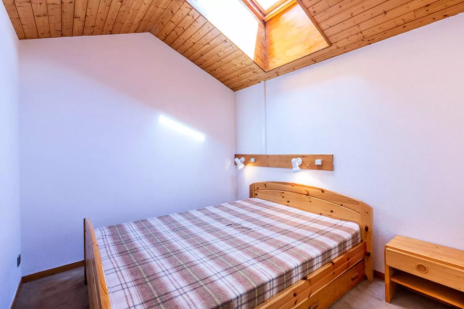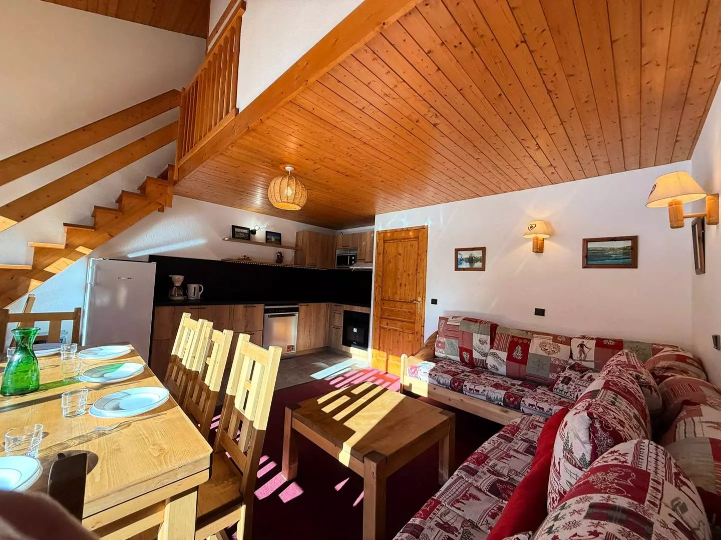 Séjour avec une banquette lit simple (80x190), un canapé et une télévision. Chambre avec un lit double (140x190). Une salle de bains et un wc séparé. La cuisine est rénovée et entièrement équipée (plaques vitrocéramiques, four, micro ondes, lave vaisselle, bouilloire, grille-pain, cafetière et réfrigérateur). Sur la mezzanine, se trouve deux chambres mansardées dont une avec trois lits simples (80x190) et une avec un lit double (140x190). Une salle de douche avec wc. Balcon. Casier à ski et ascenseur dans la résidence. Animaux non admis. Appartement non fumeur. Etage -1. Départ skis aux pieds.