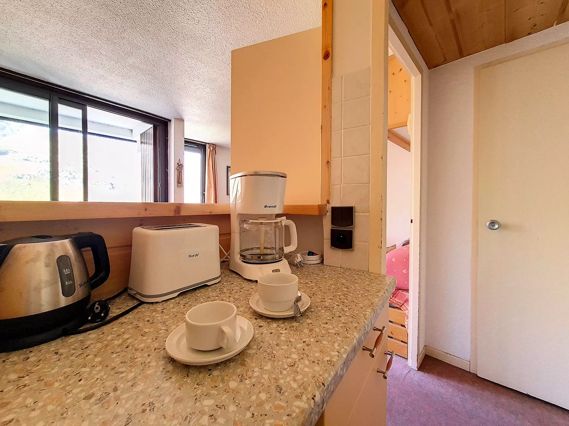 Cuisine équipée de 2 plaques électriques, four, micro-ondes, réfrigérateur, lave-vaisselle, cafetière, grille-pain et bouilloire.