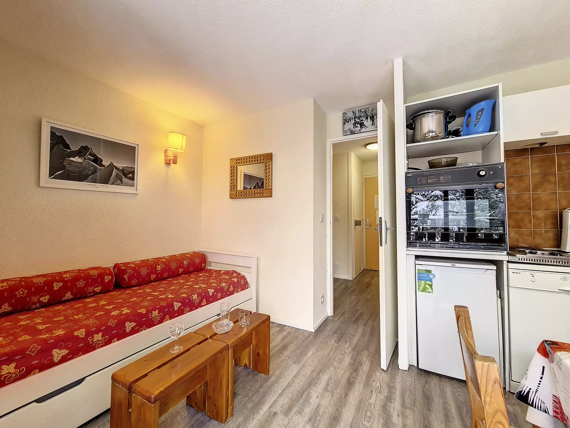 Séjour : 1 banquette-lit une personne + 1 lit gigogne relevable. Equipé d'une télévision.