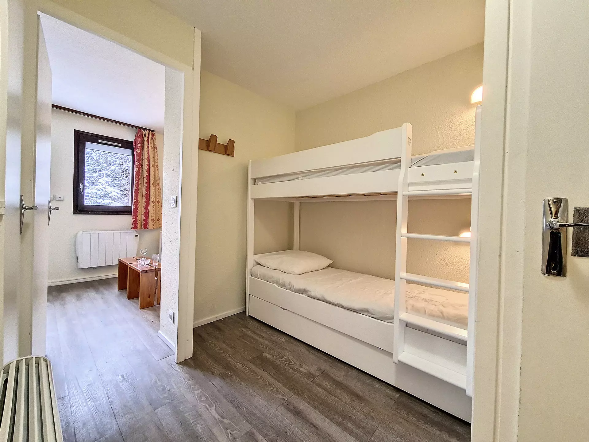 Coin montagne (dans l'entrée séparée du séjour par une porte) : 2 lits 1 personne superposés.